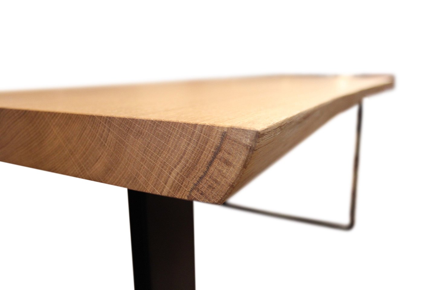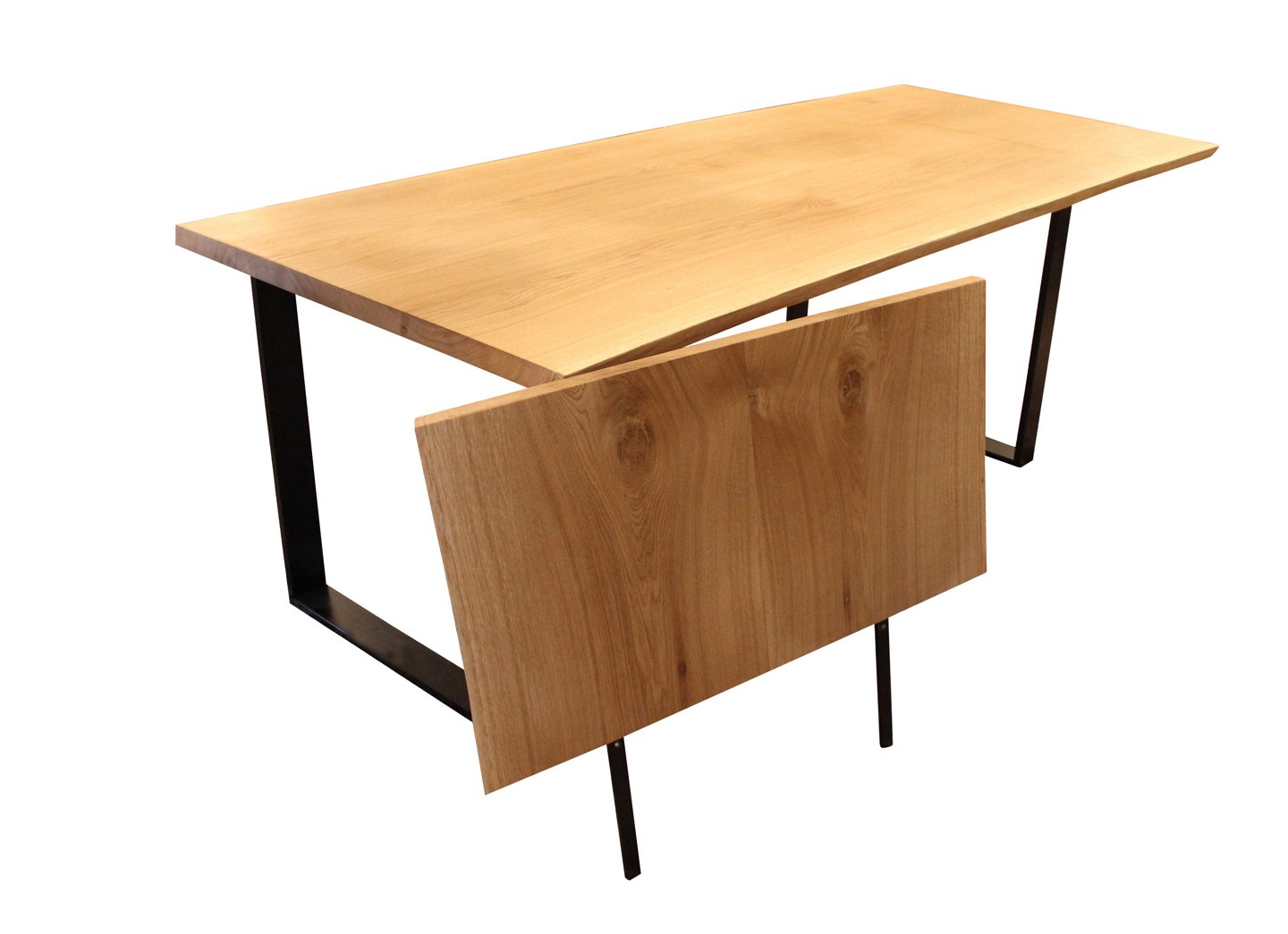Kontakt os vedrørende prisPlankebord af eg og rammestel af sort metal, af 2 massive planker med naturkanter. Bordet er af eget design og ny fremstillet med to udtræksplader (á 50 cm).