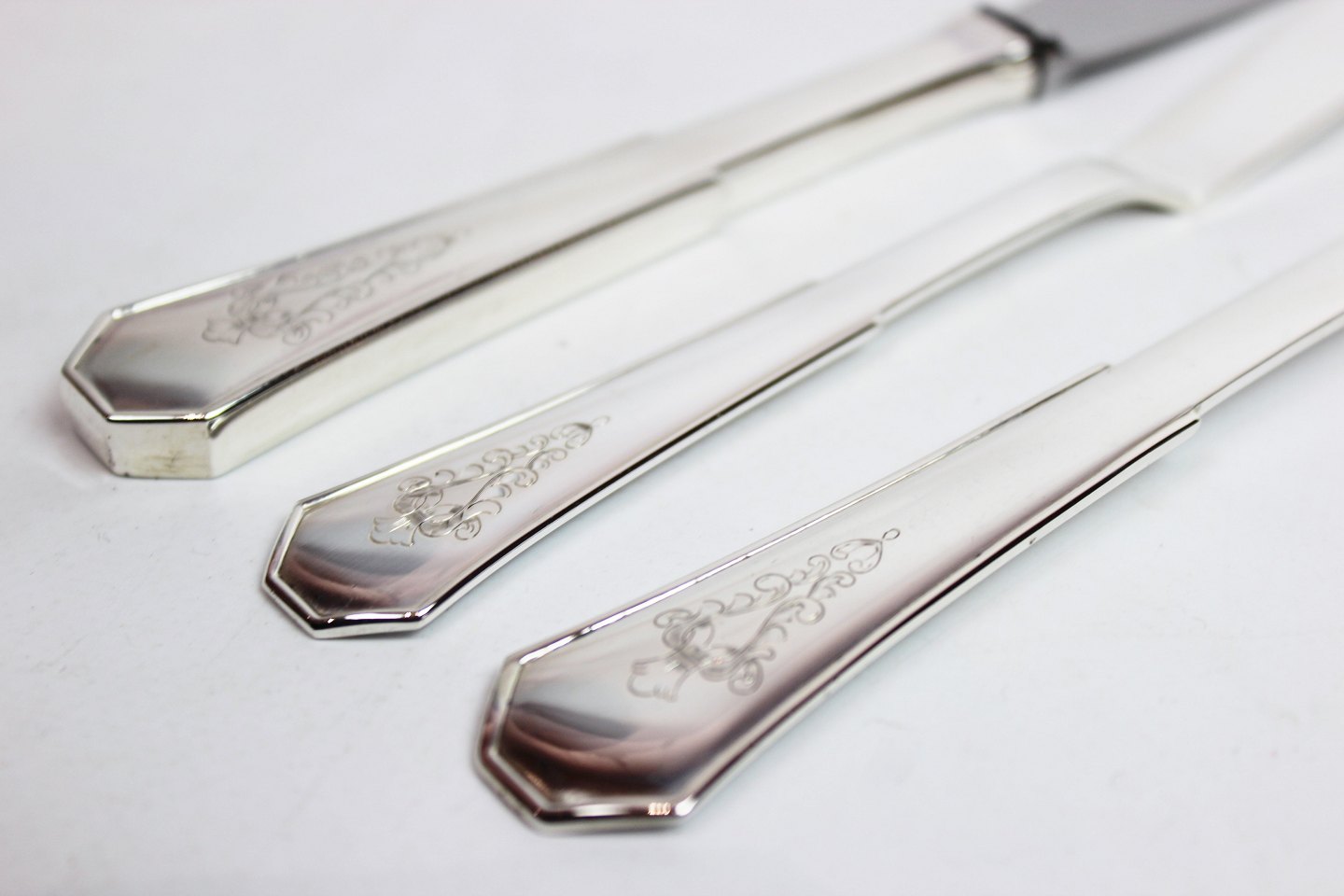 Se prisen i varebeskrivelsenMiddagskniv, fiskekniv og frokostgaffel i Arvesølv nr. 2 af Hans Hansen. Spørg for antal på lager.