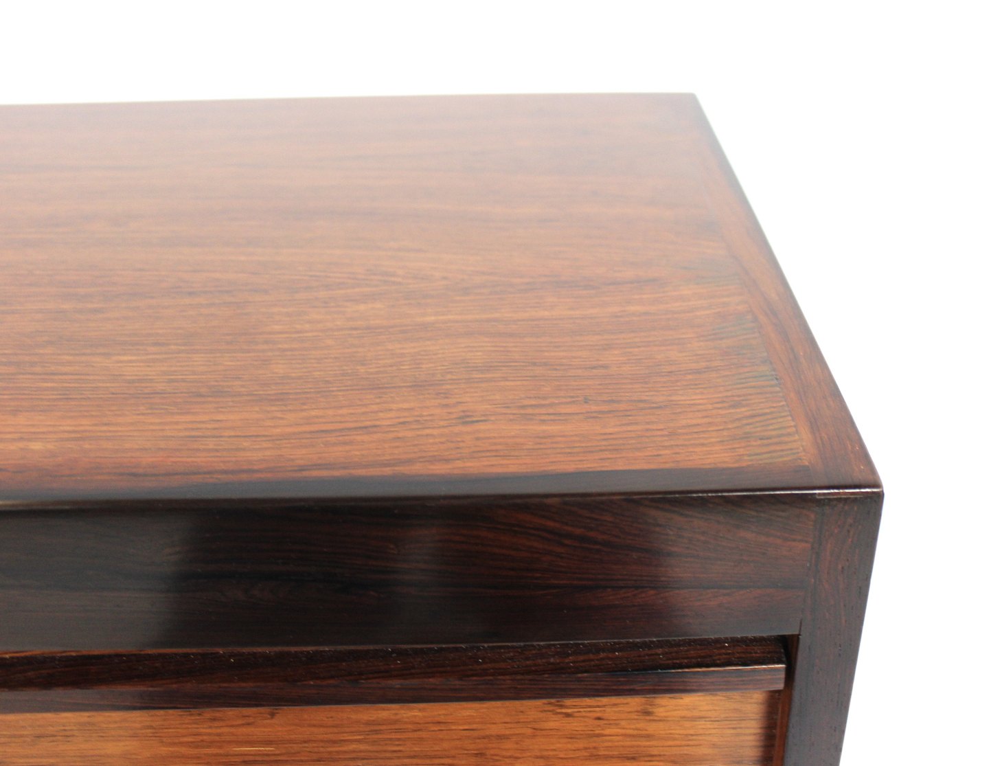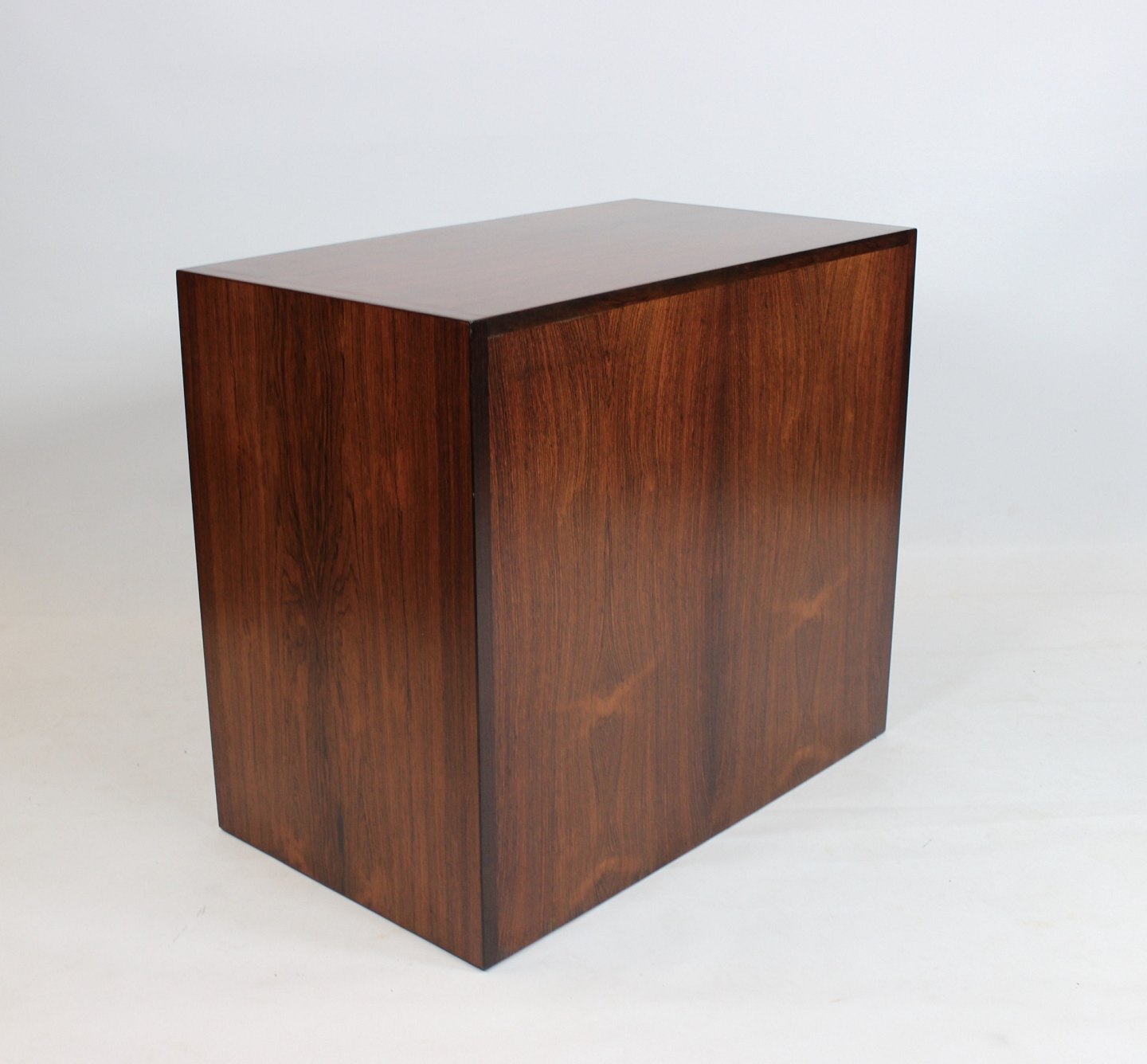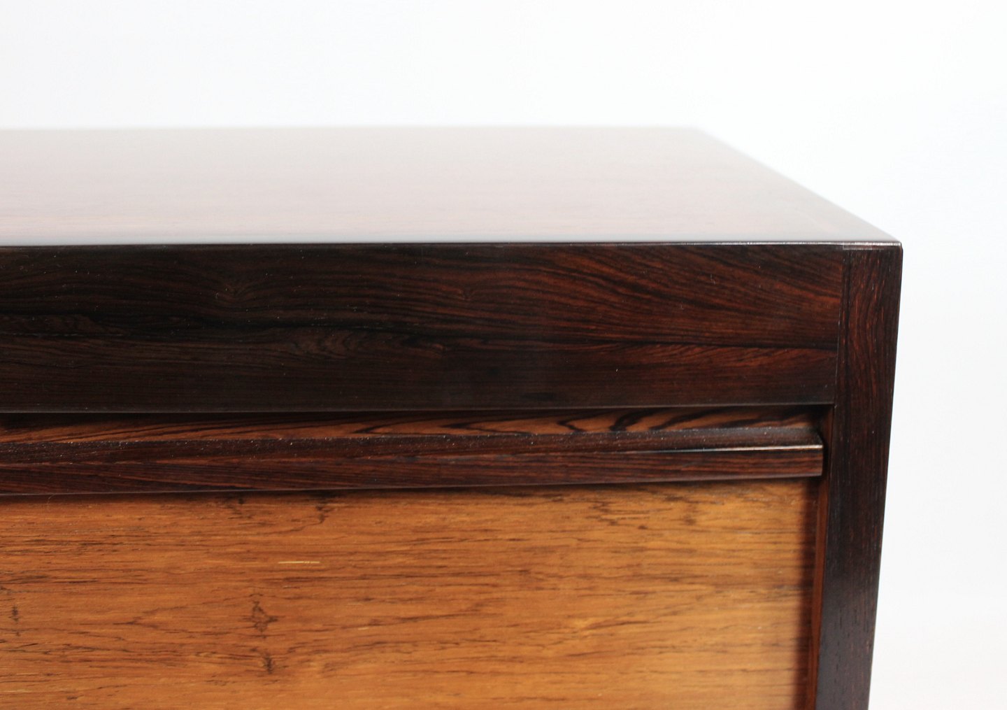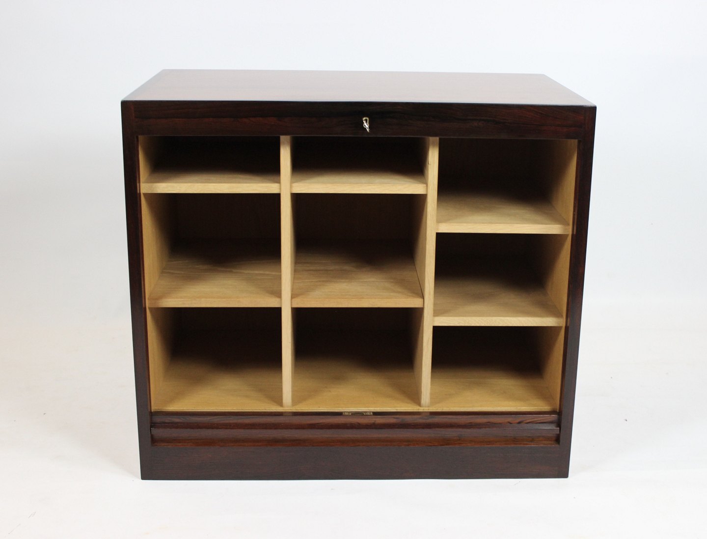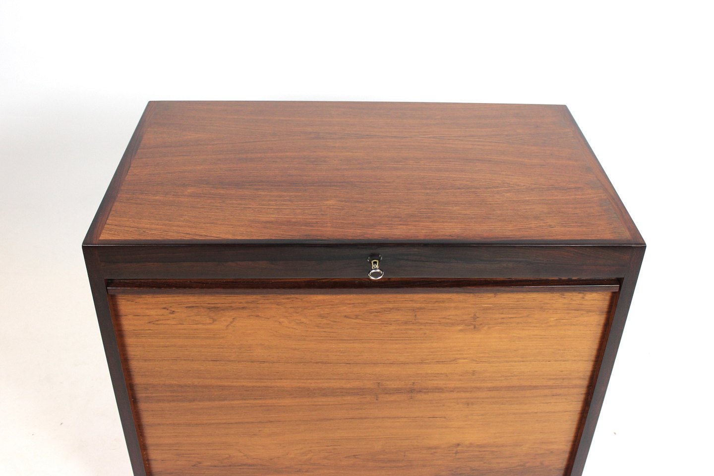 The rosewood shutters are an iconic example of Danish design from the 1960s. The rich color and beautiful pattern of the rosewood creates a timeless elegance, while the louvre slats add a unique visual element to the cabinet's design.