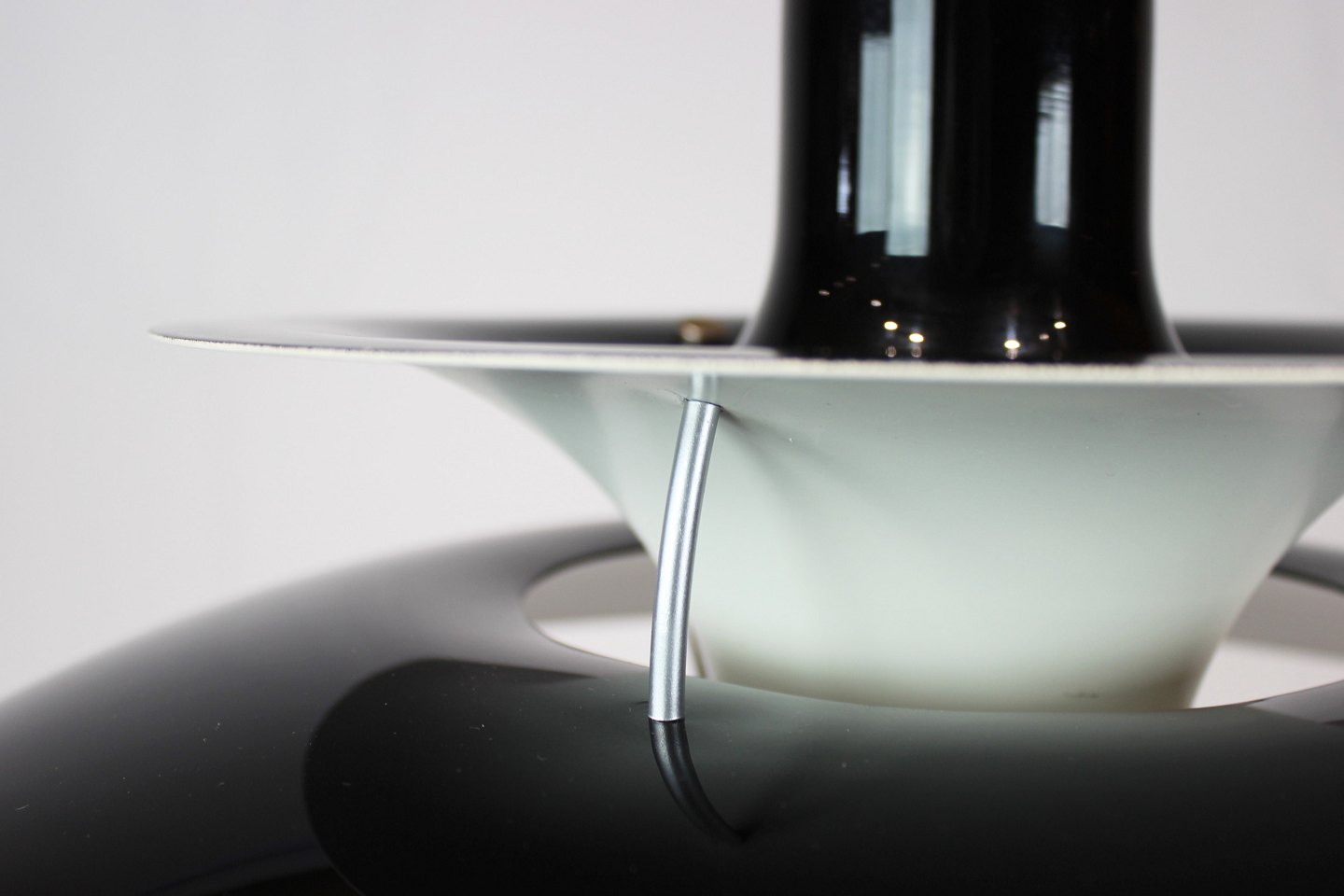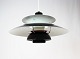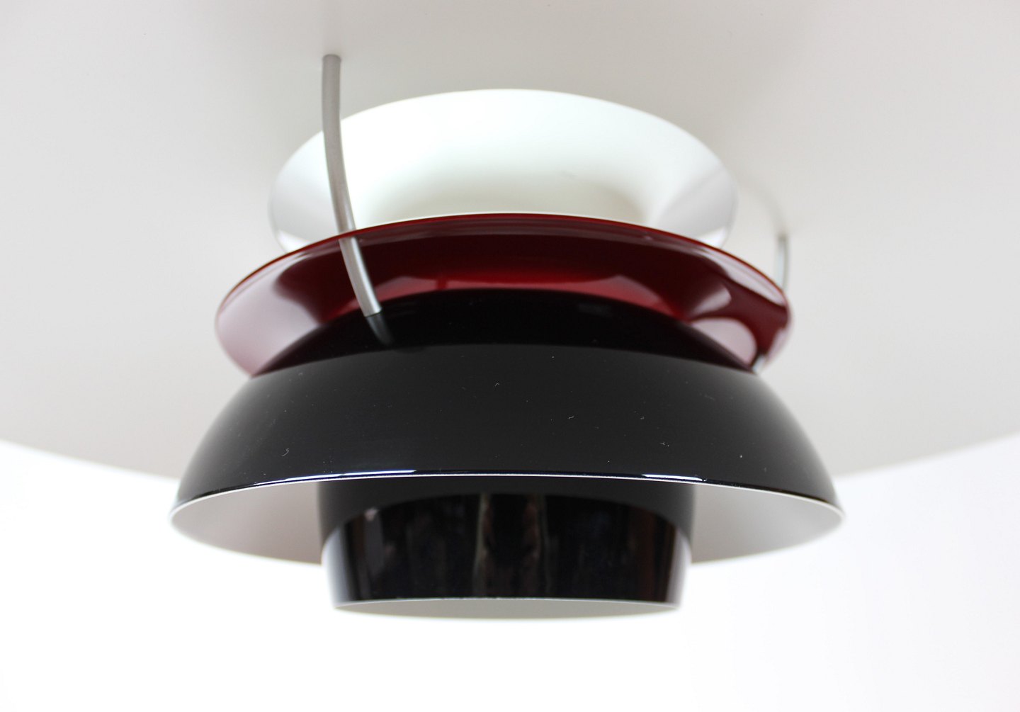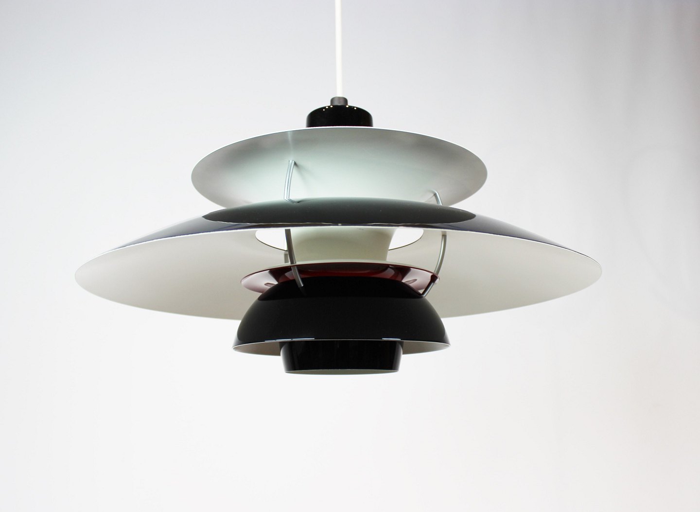 PH5 lamp designed by Poul Henningsen in 1958 and manufactured by Louis Poulsen. The lamp has lacquered metal shades in black, red and white, and is a newer model.