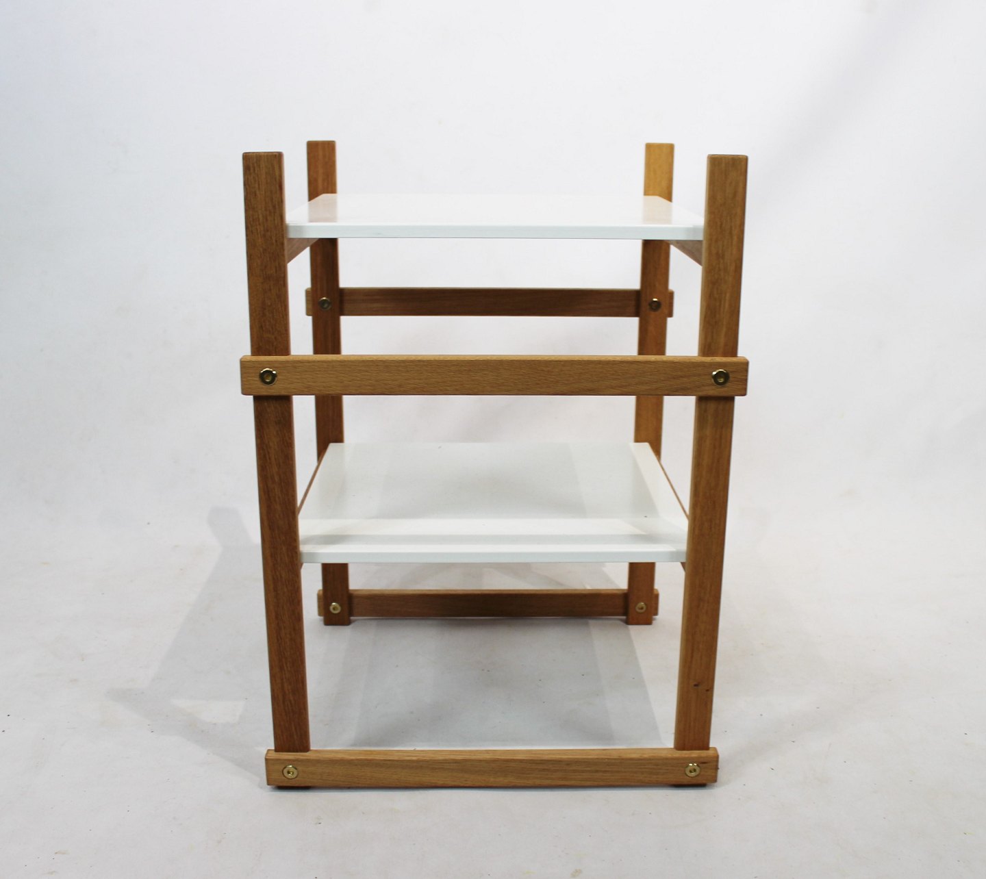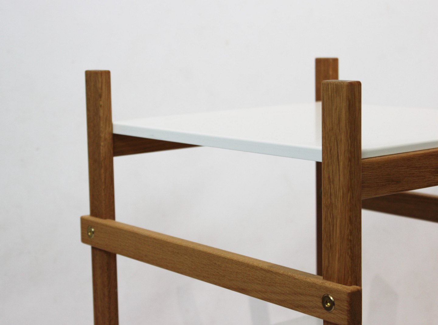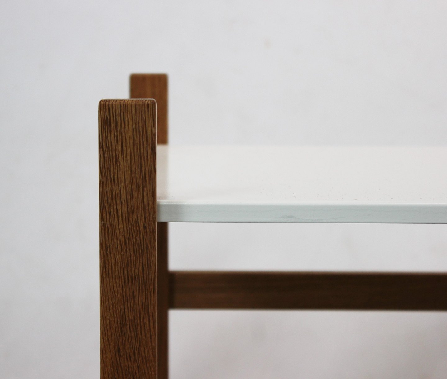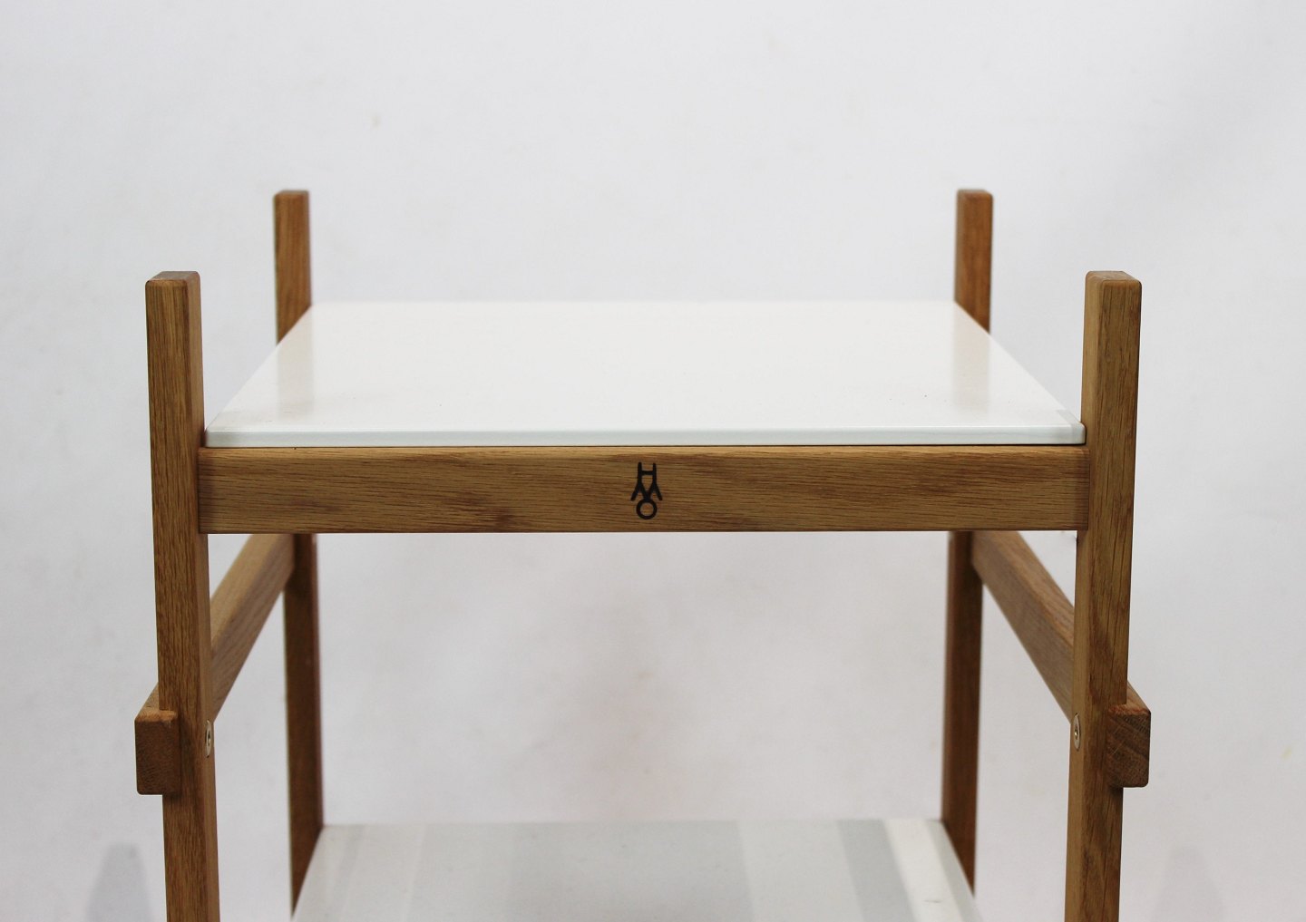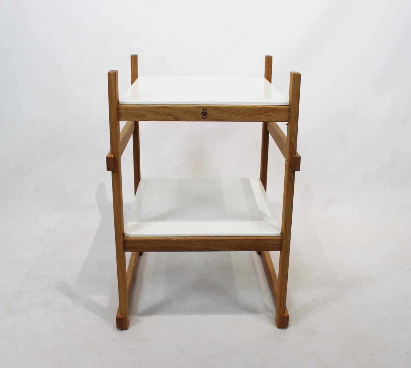 Side table with shelf of white laminate and frame of oak. The table is in good condition.