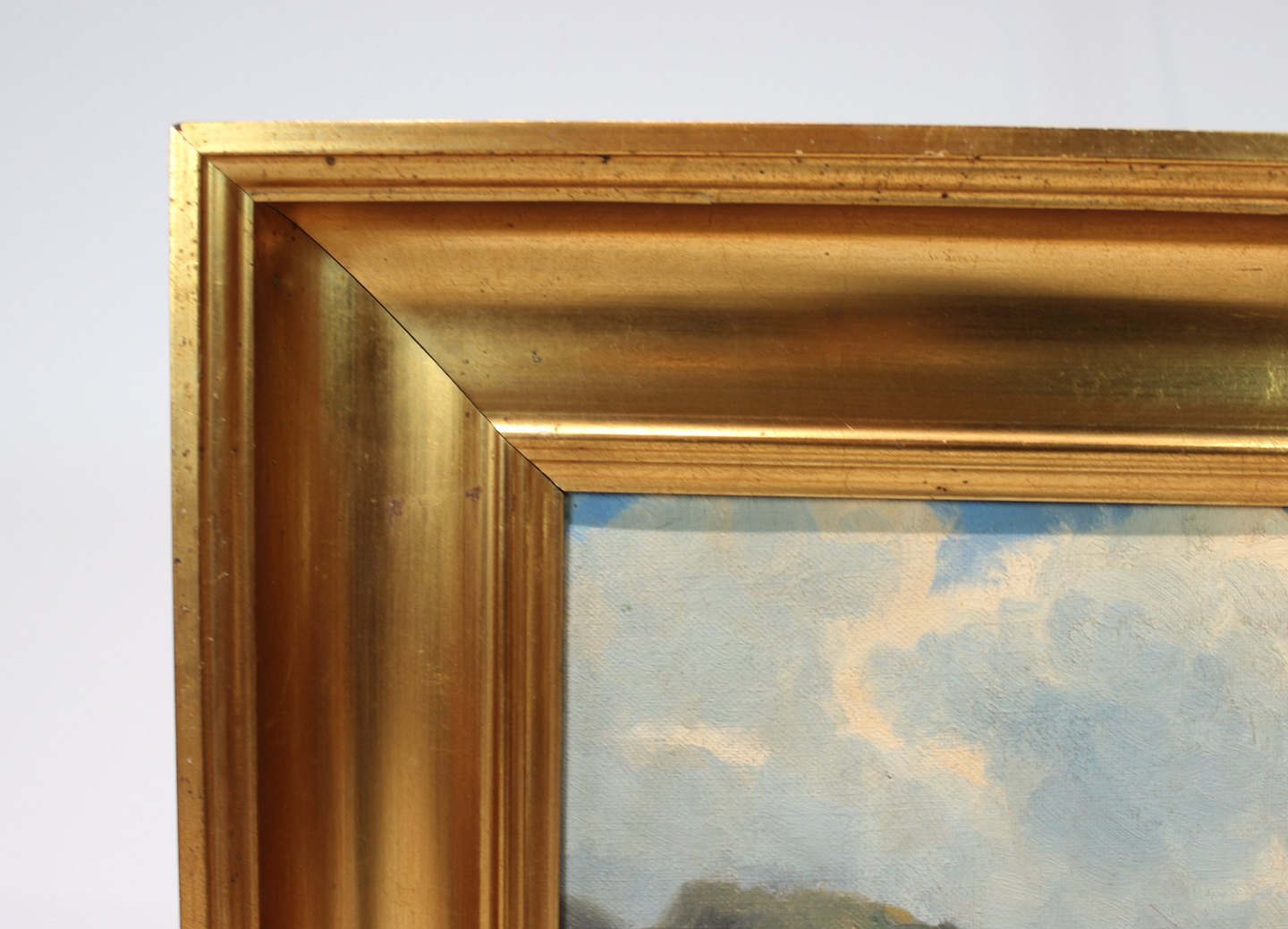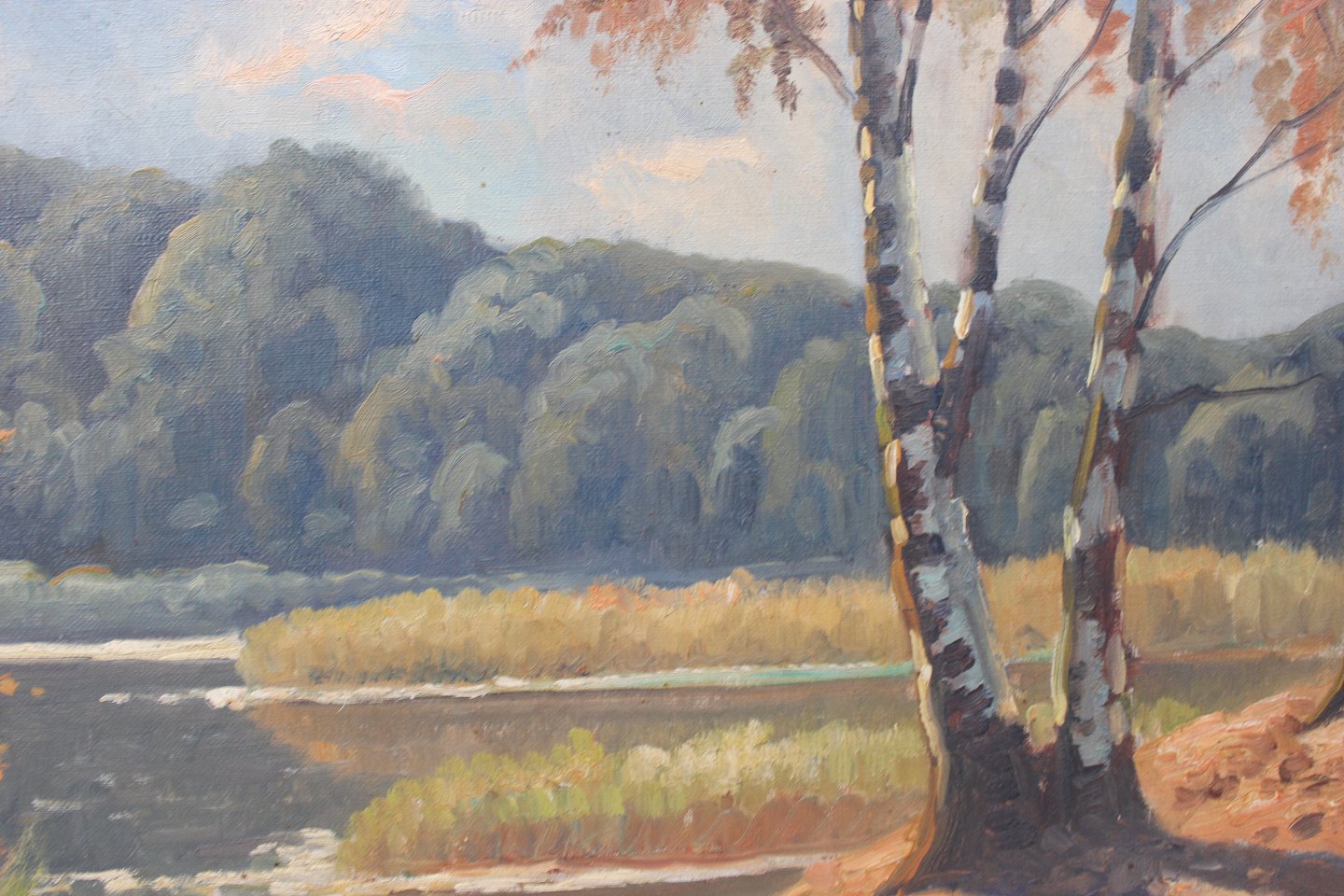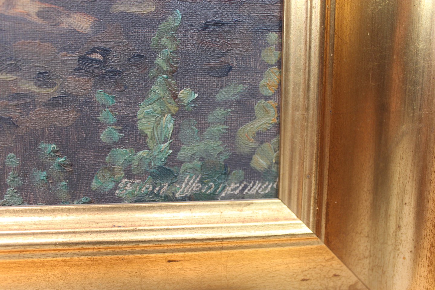Painting with forest motif and gilded frame signed Finn Wennervald. The painting is in great vintage condition.