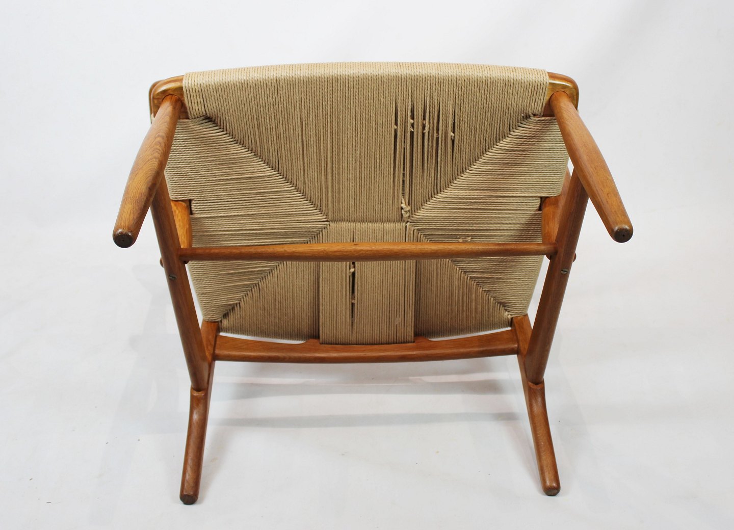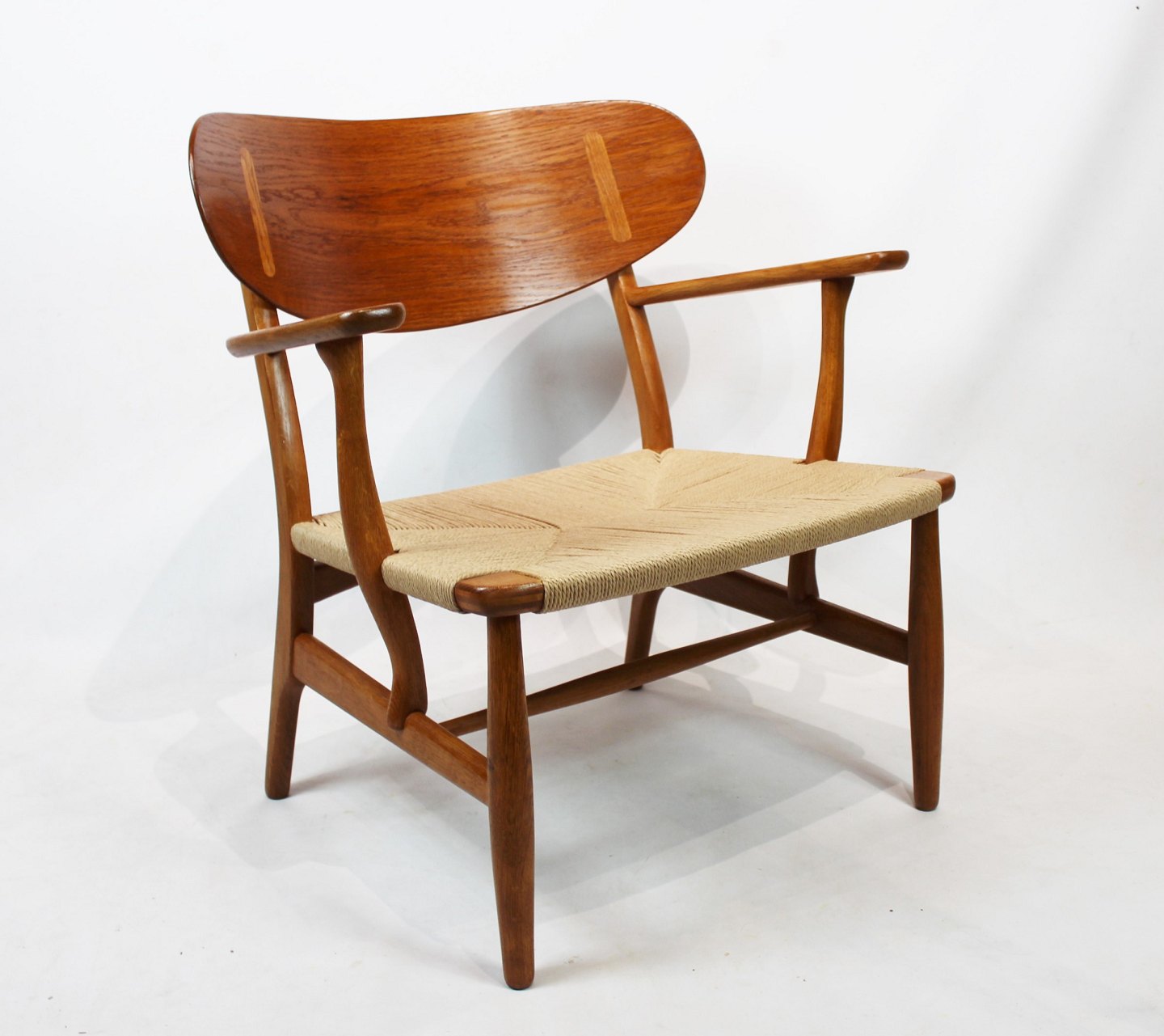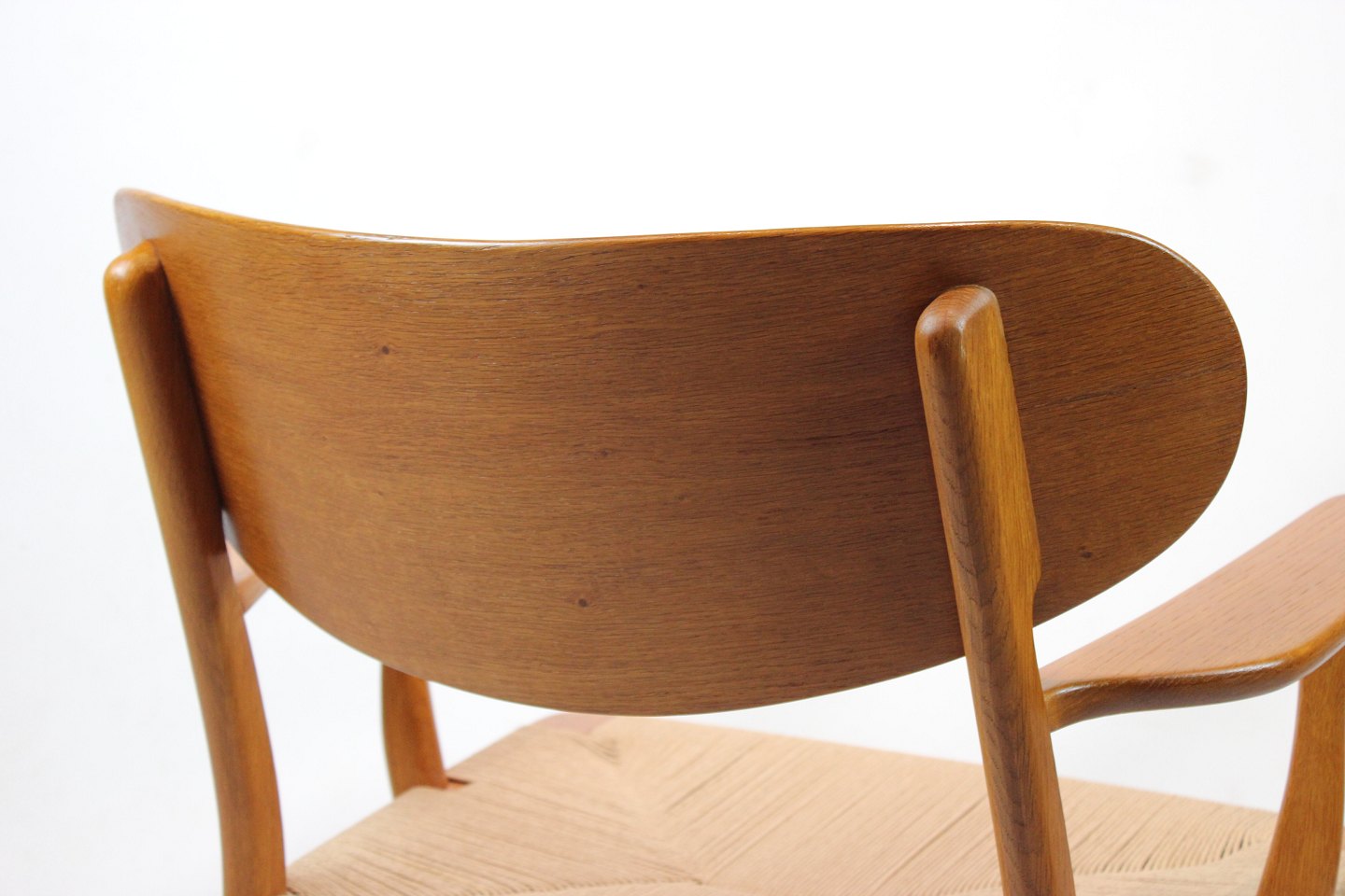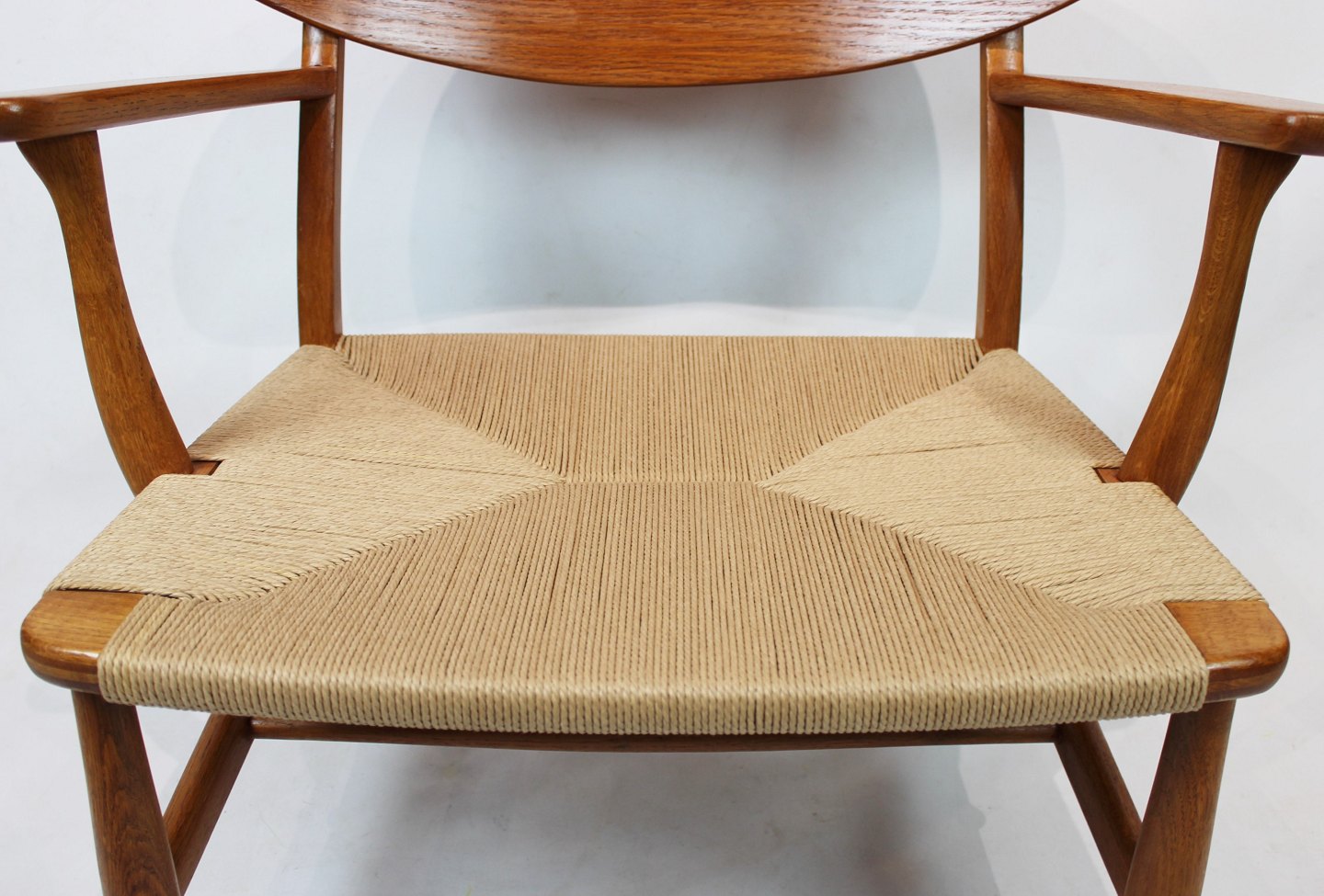 Armstol, model CH22, i egetræ og papirflet designet af Hans J. Wegner og fremstillet af Carl Hansen & Søn i 1950erne. Stolen er i flot original stand med ny flet.