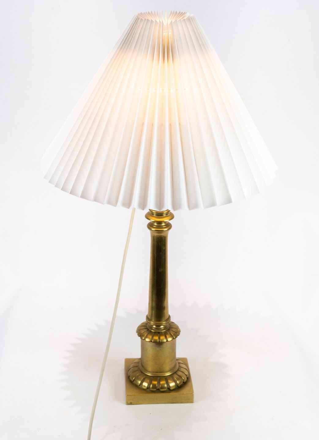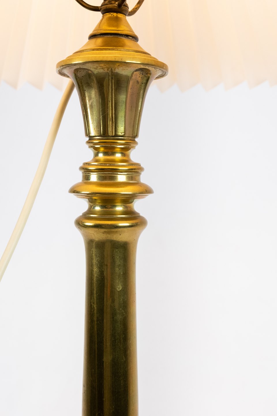 Tall table lamp in brass from the 1920s. The shade is handpainted and hand folded in paper.