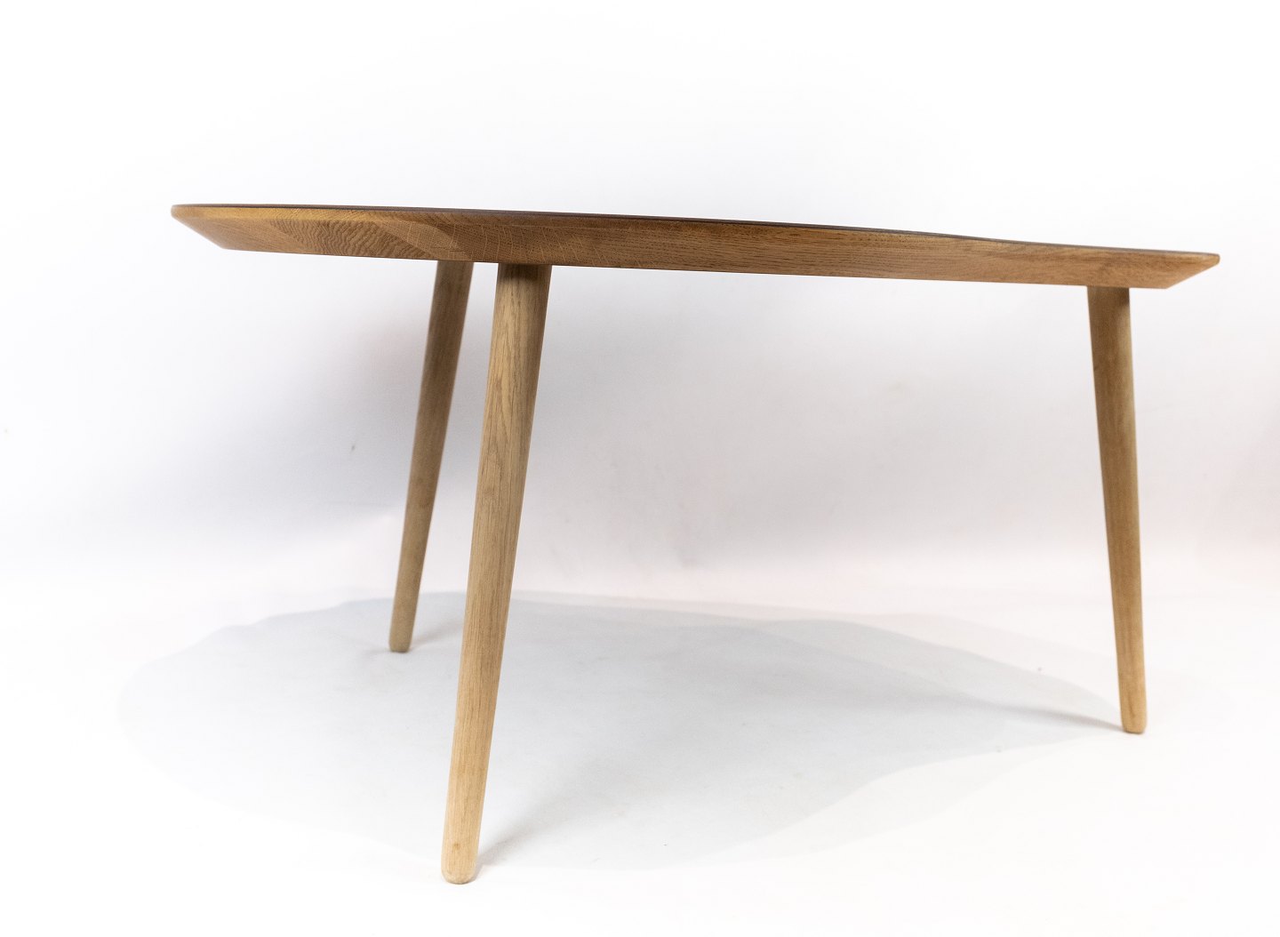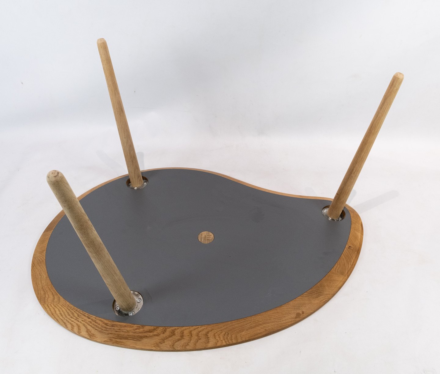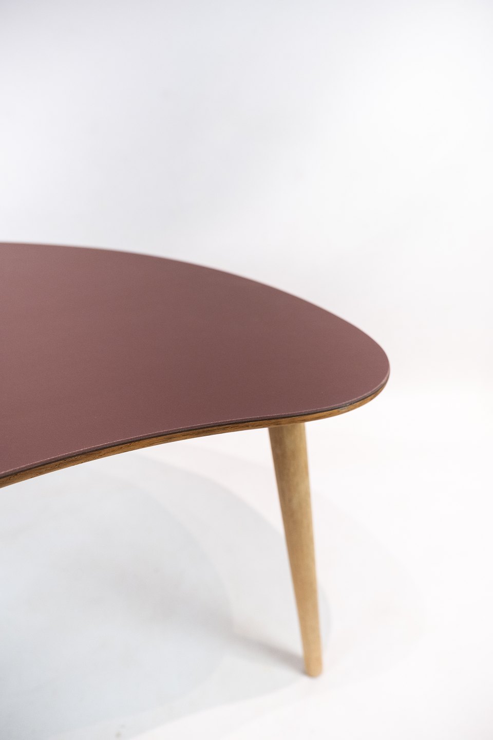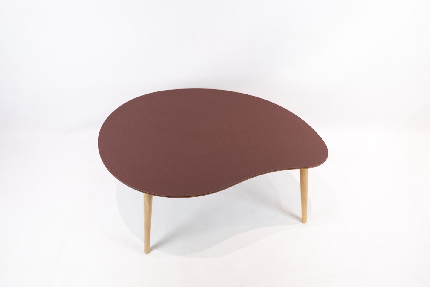Sofabord med brun laminat top og ben i egetræ af Via Copenhagen. Bordet er i flot stand.