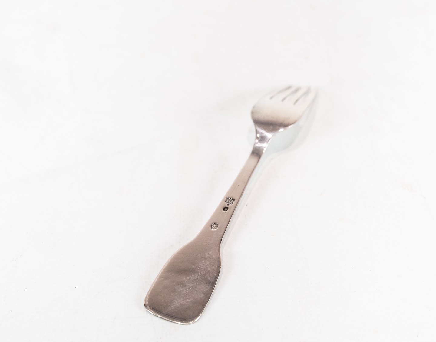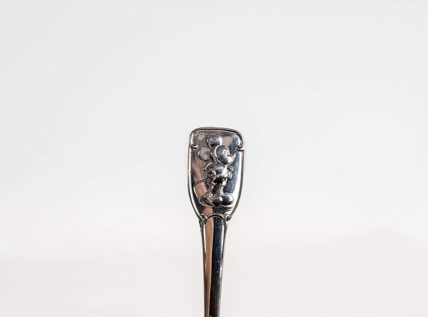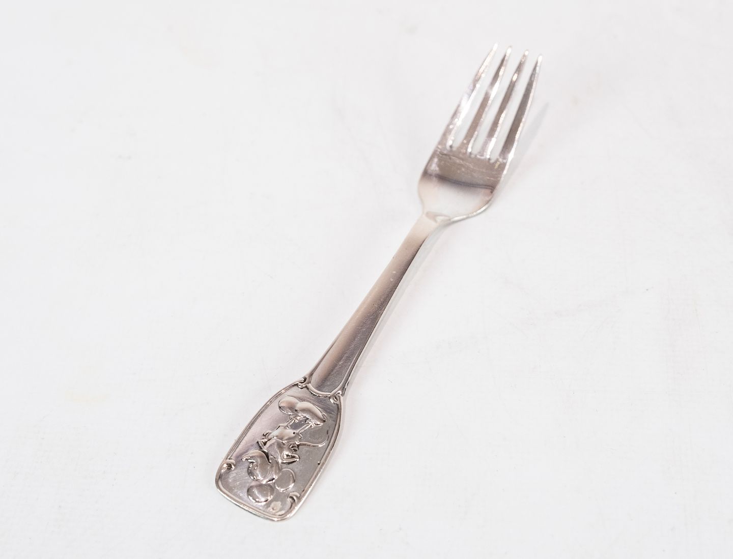 Barnegaffel med motiv af Mickey Mouse og af tretårnet sølv.