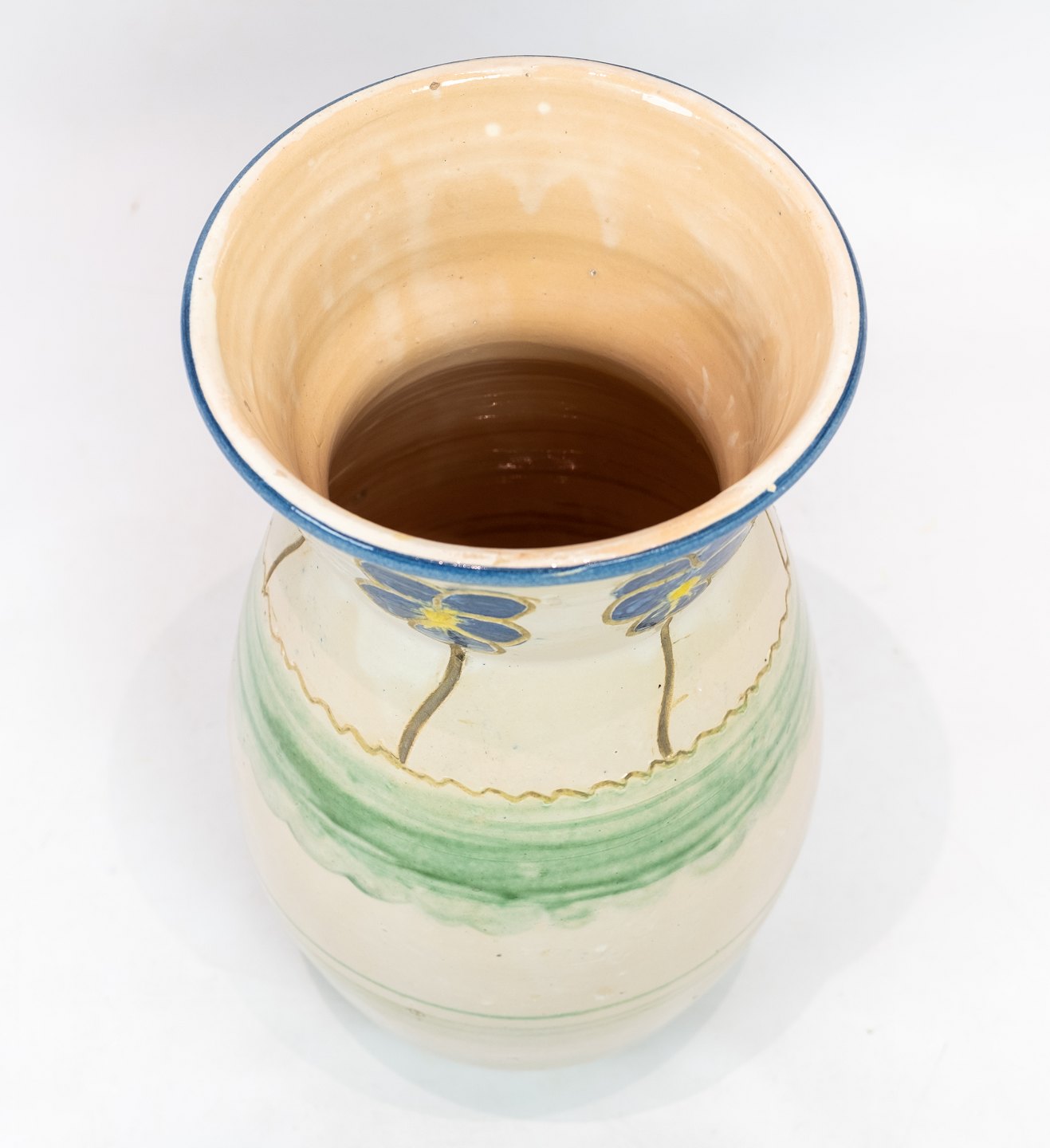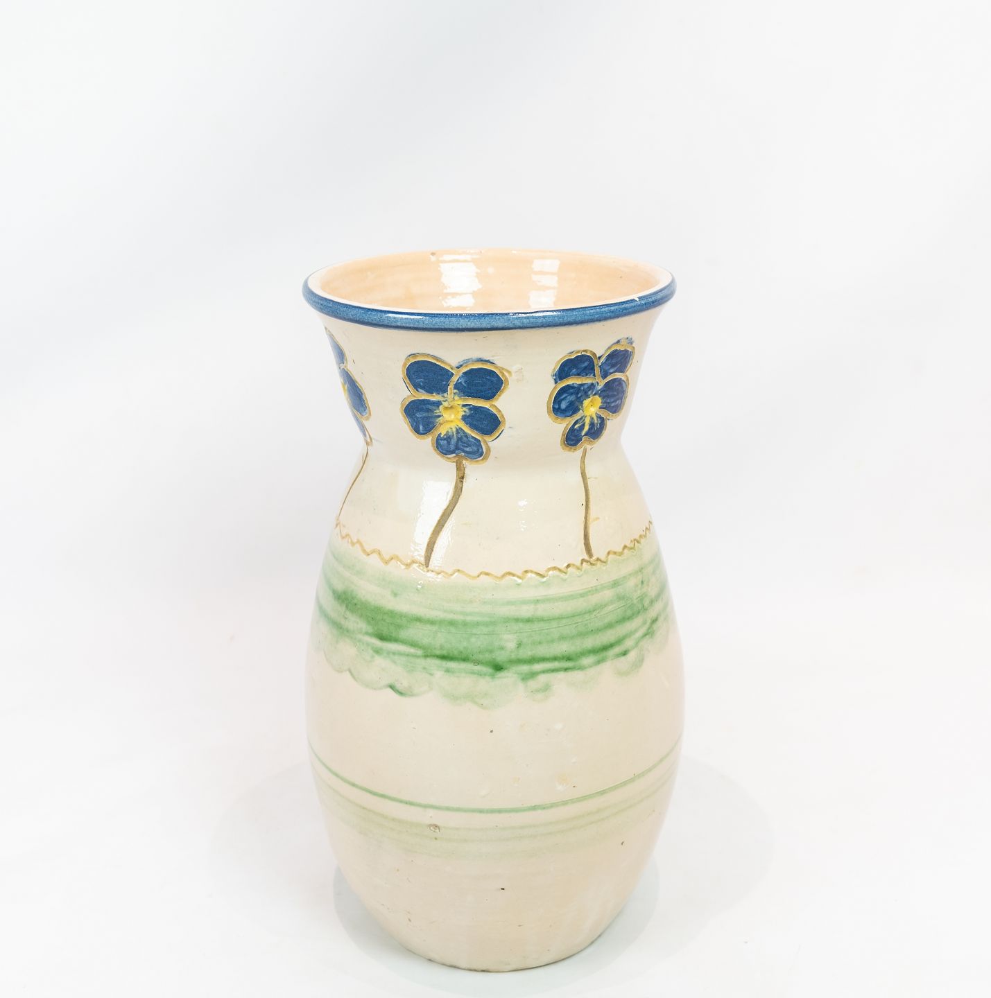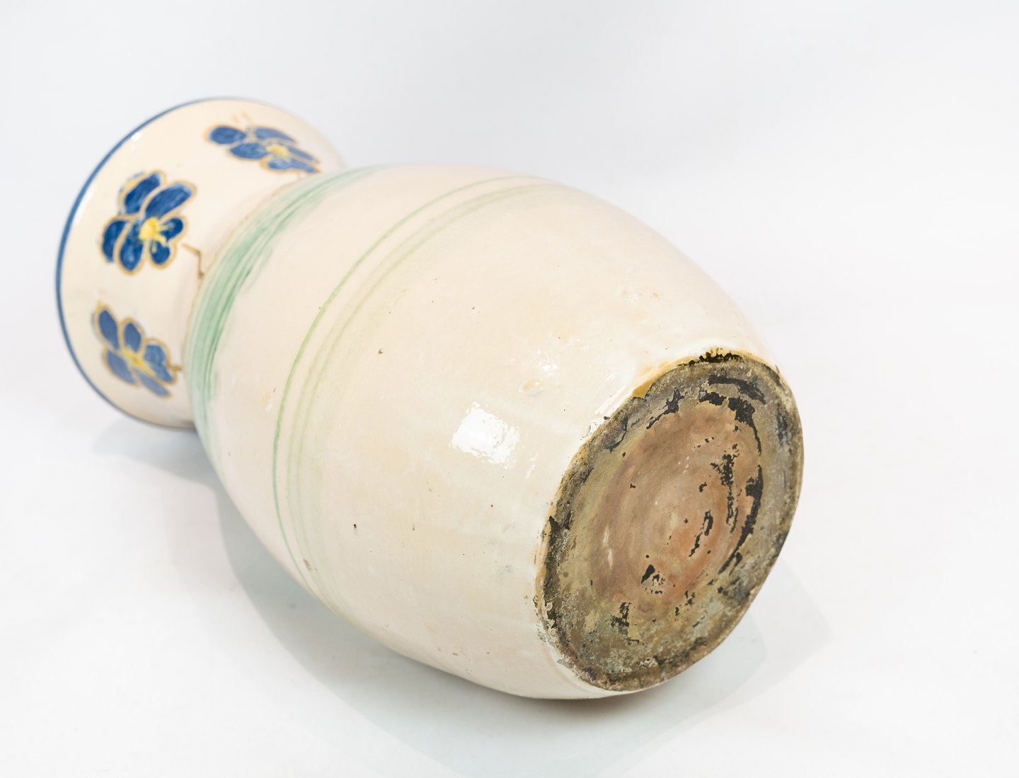 SoldCeramic floor vase in light color decorated with blue flowers. The vase is in great vintage condition.