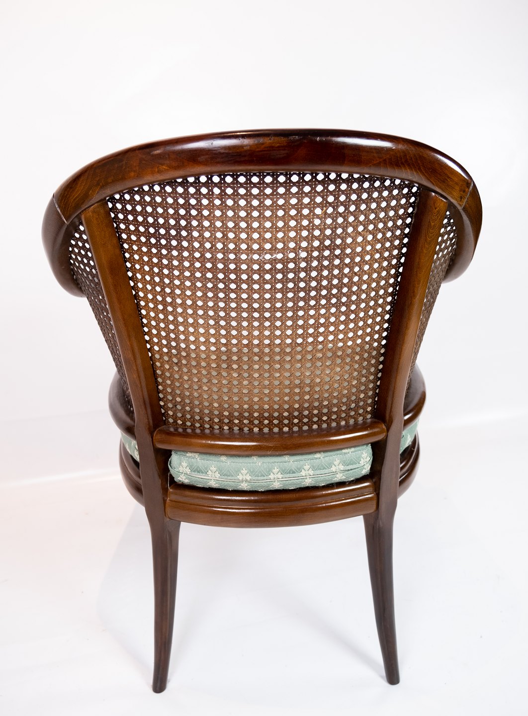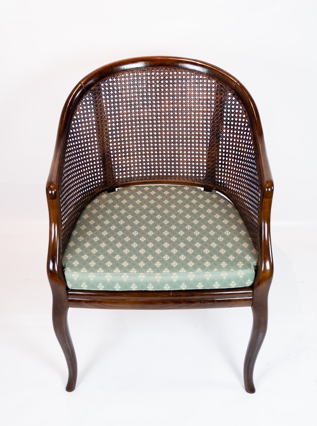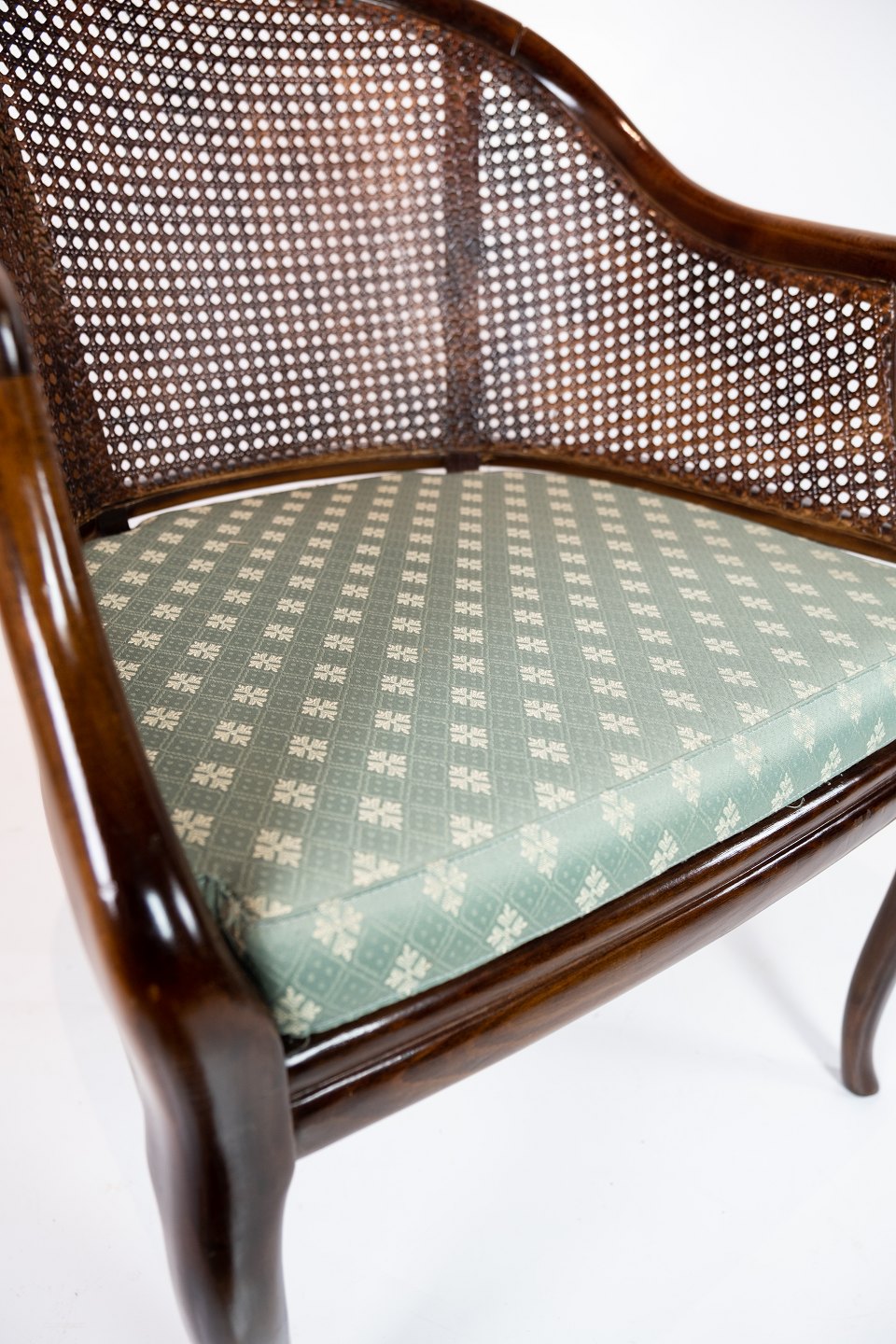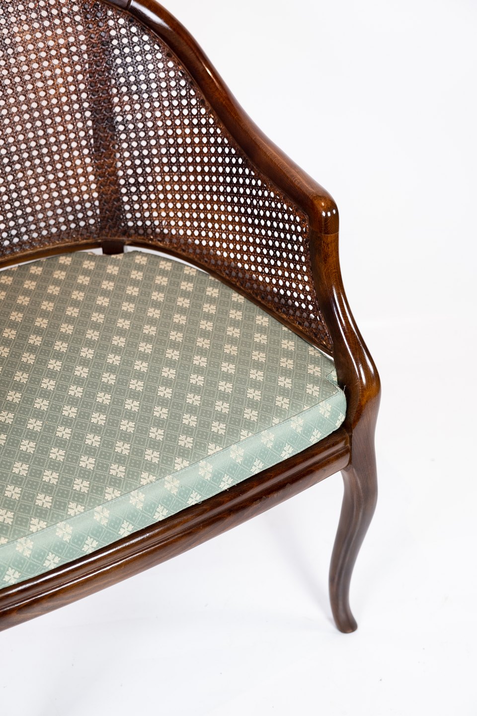 Armchair of mahogany and upholstered with light green fabric from the 1920s.