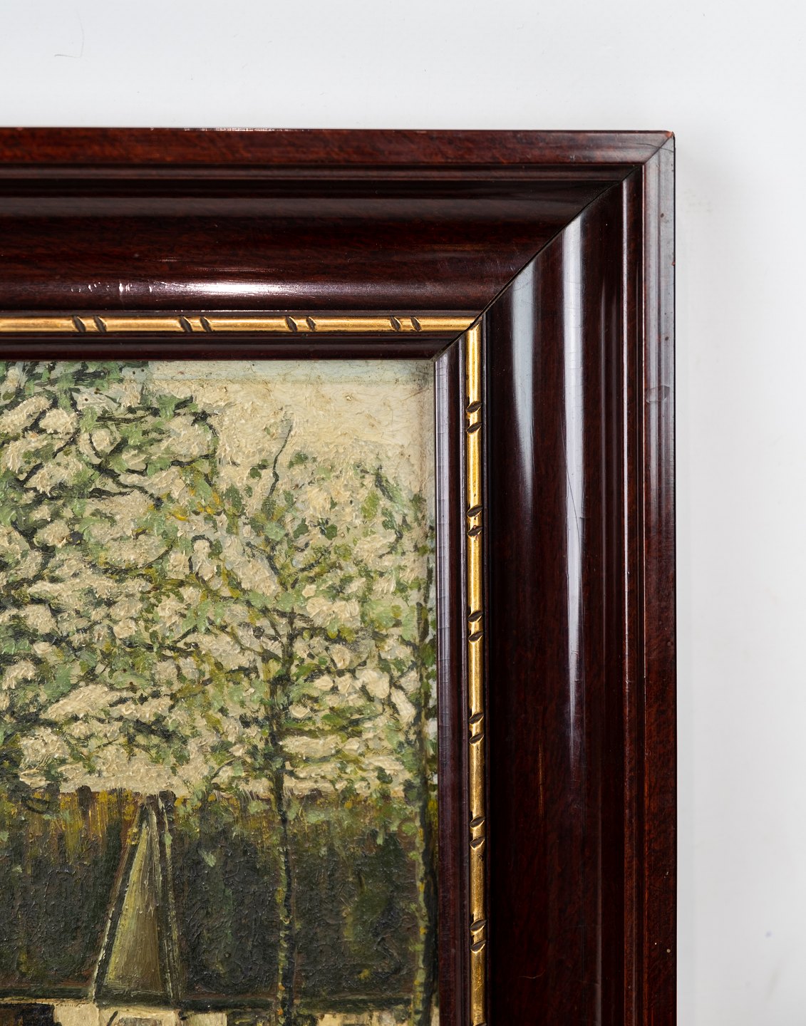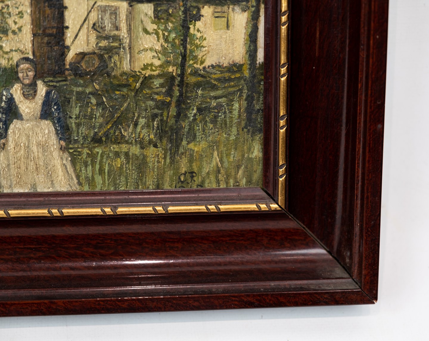 Oil painting with farm motif and dark wooden frame, from 1915.