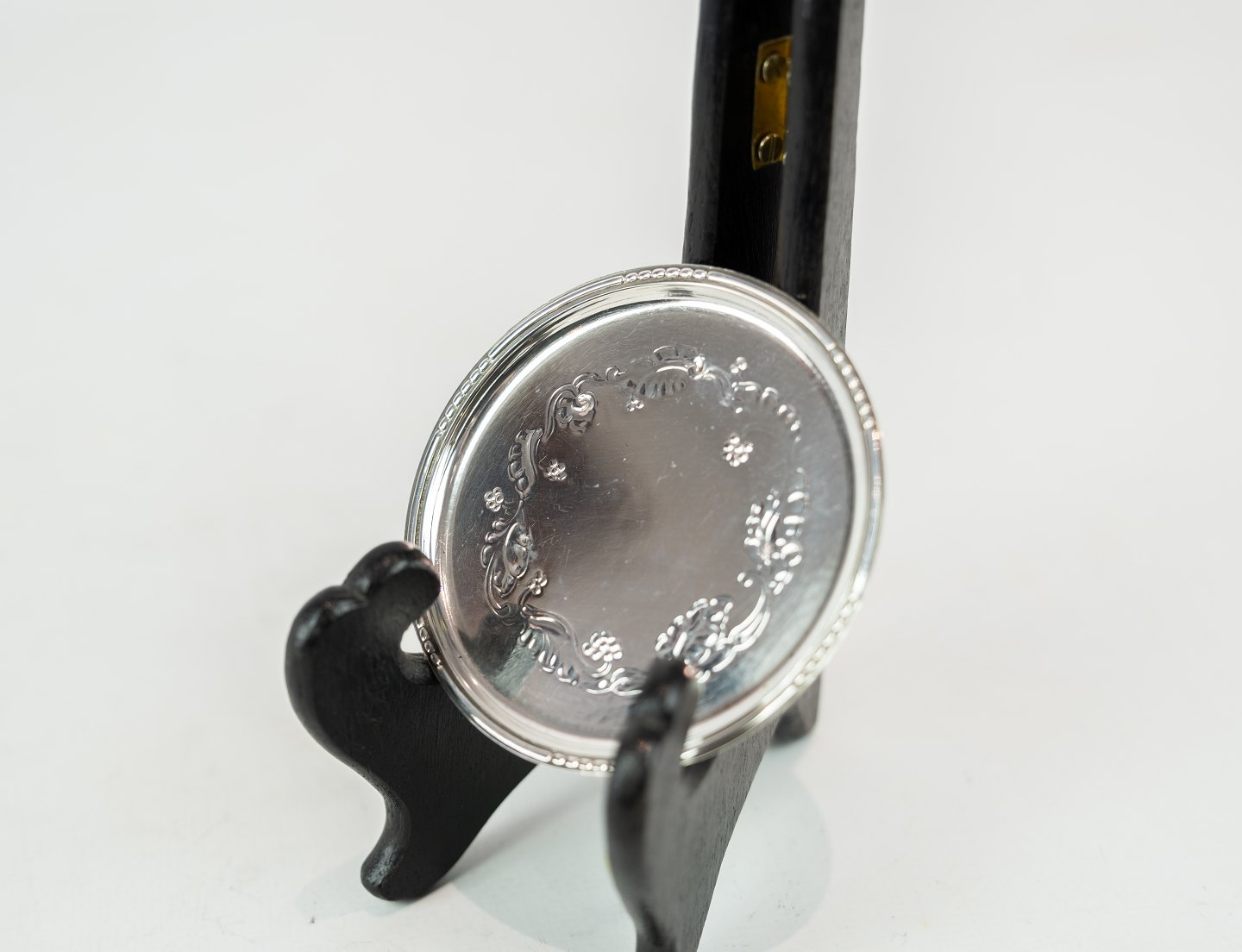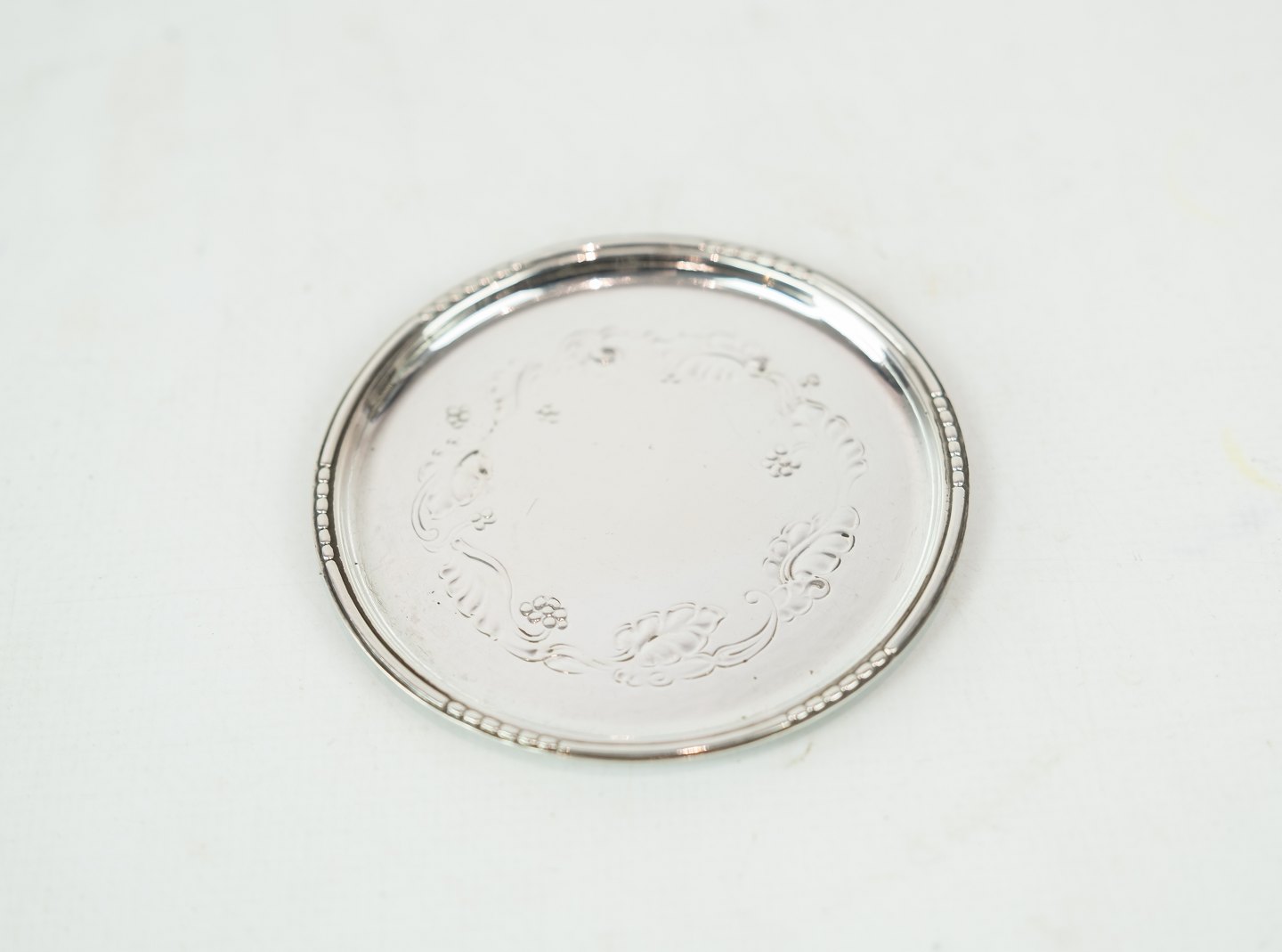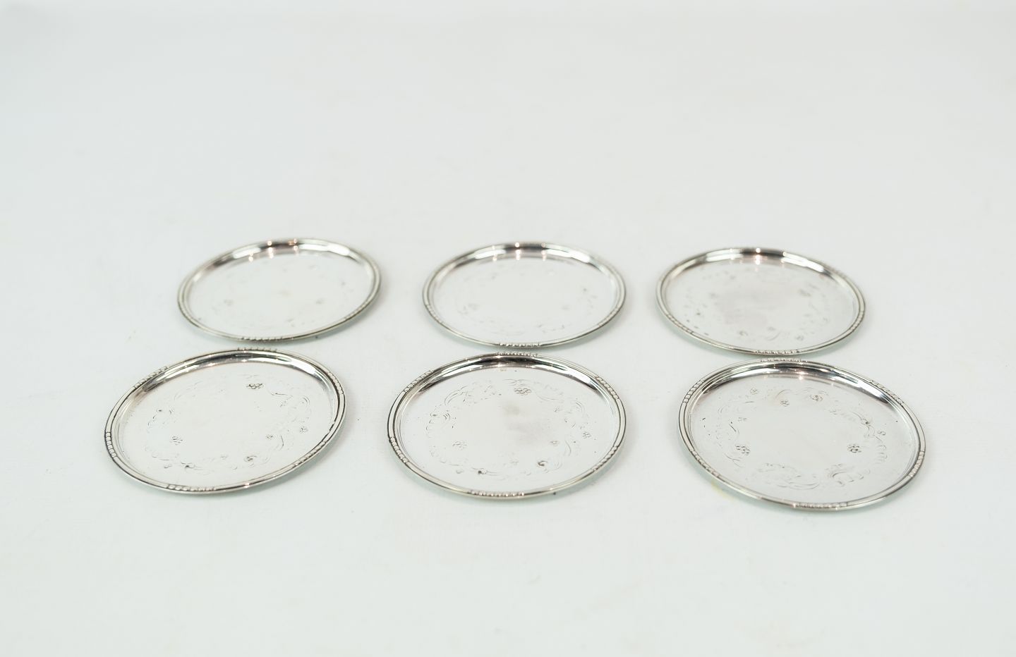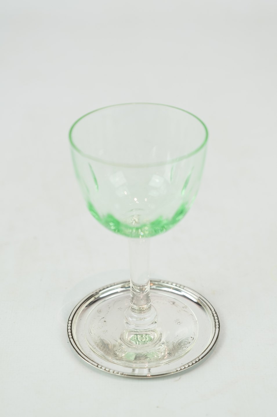 SolgtSæt af glasbakker i tretårnet sølv.