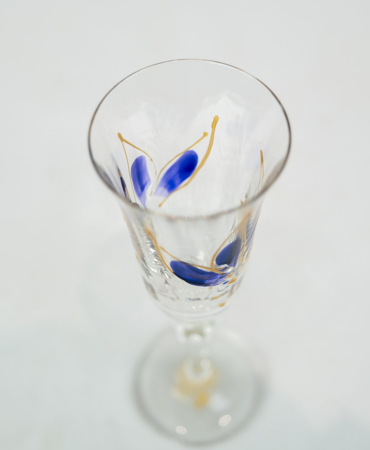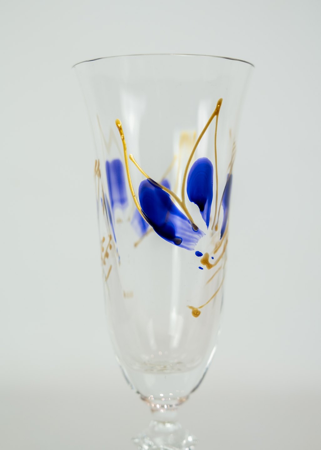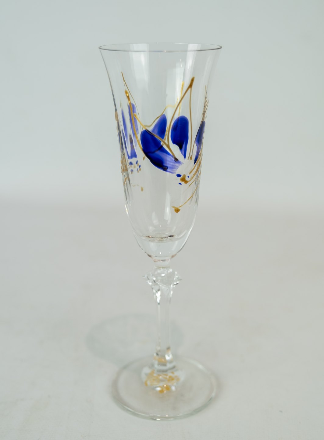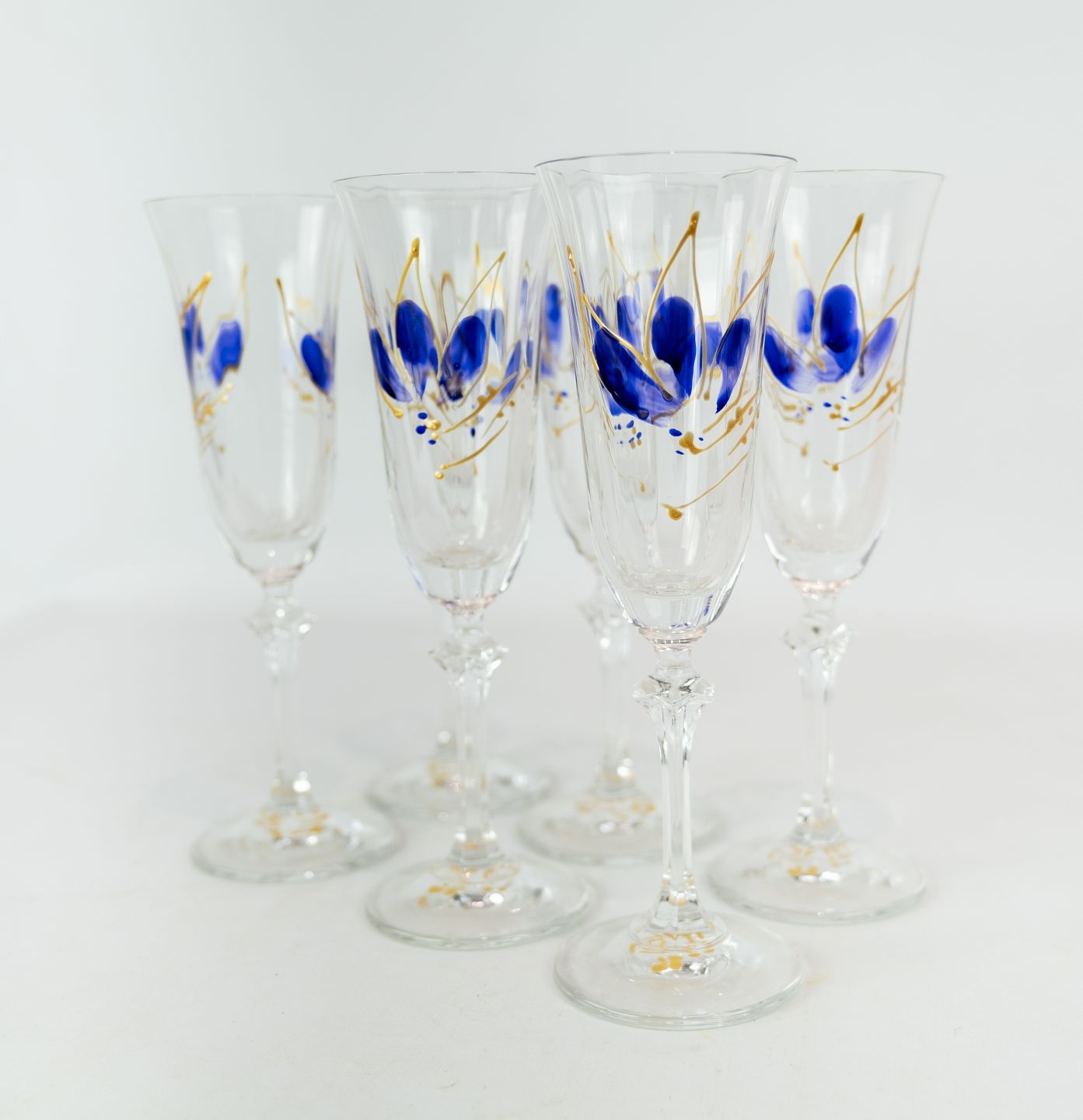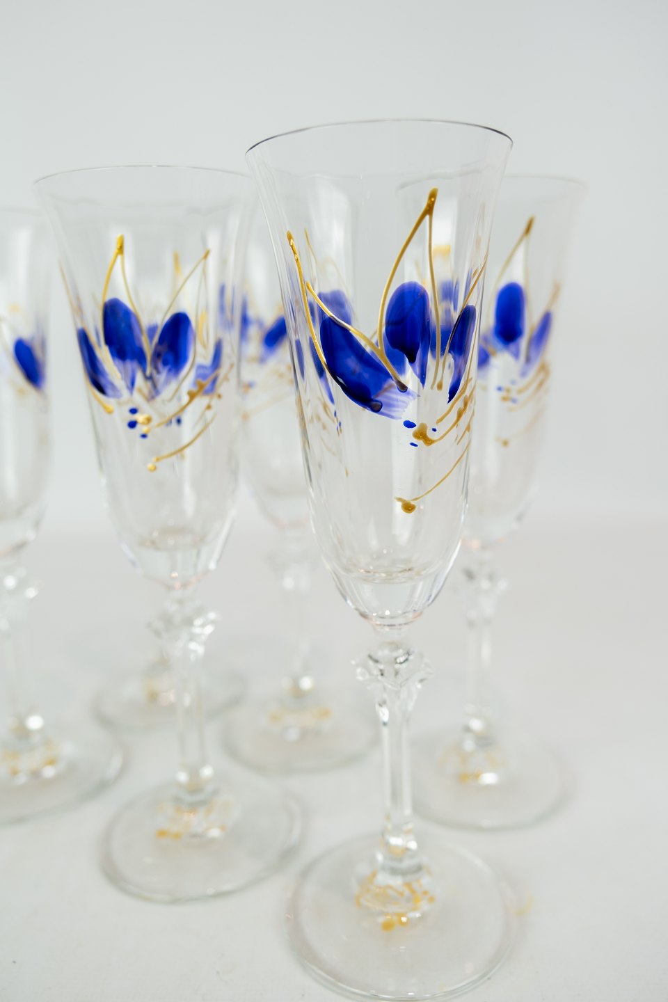 set of six champagne glass decorated with blue and gold flowers.