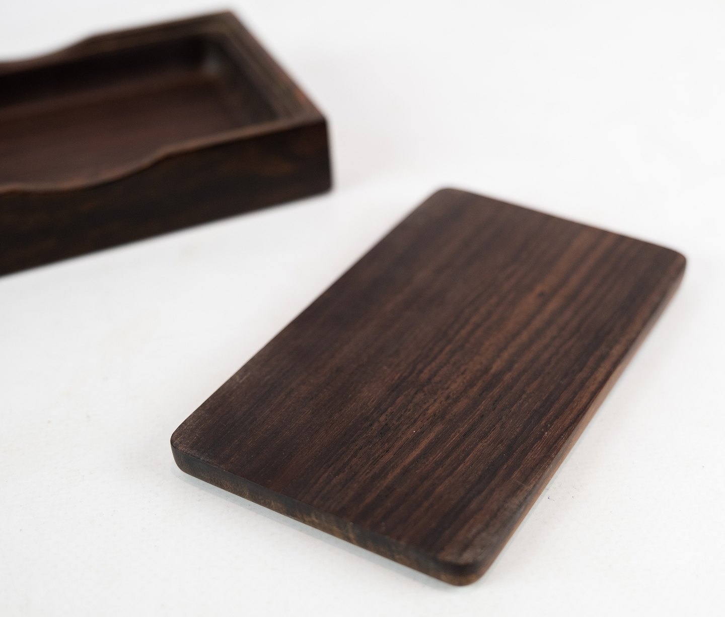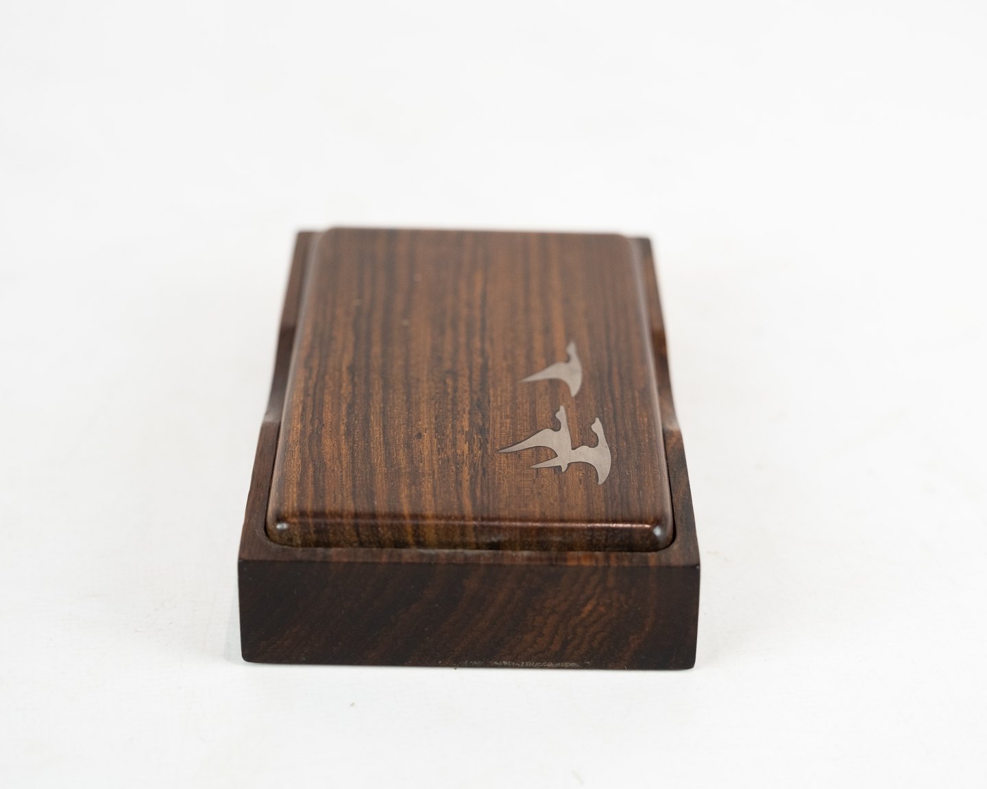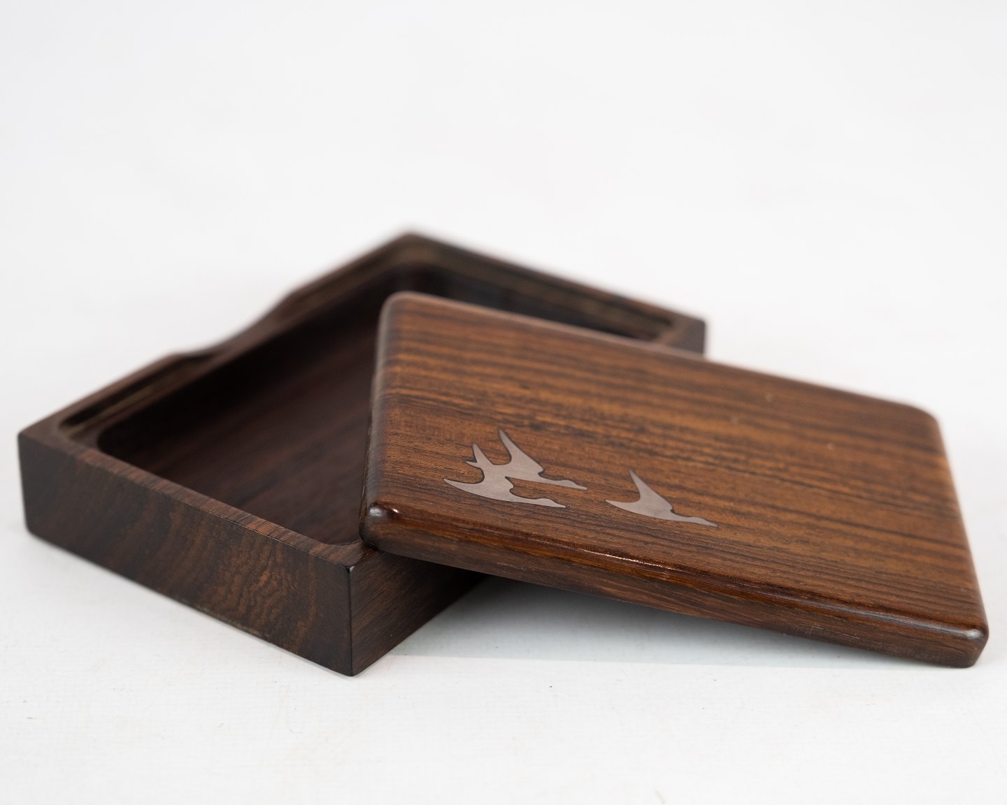Æske i palisander dekoreret med fugle, i flot brugt stand.