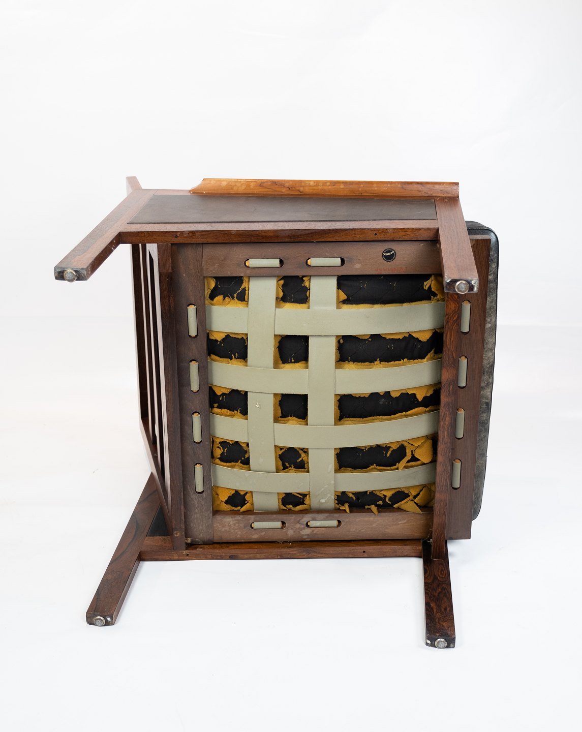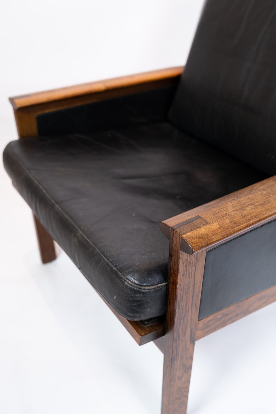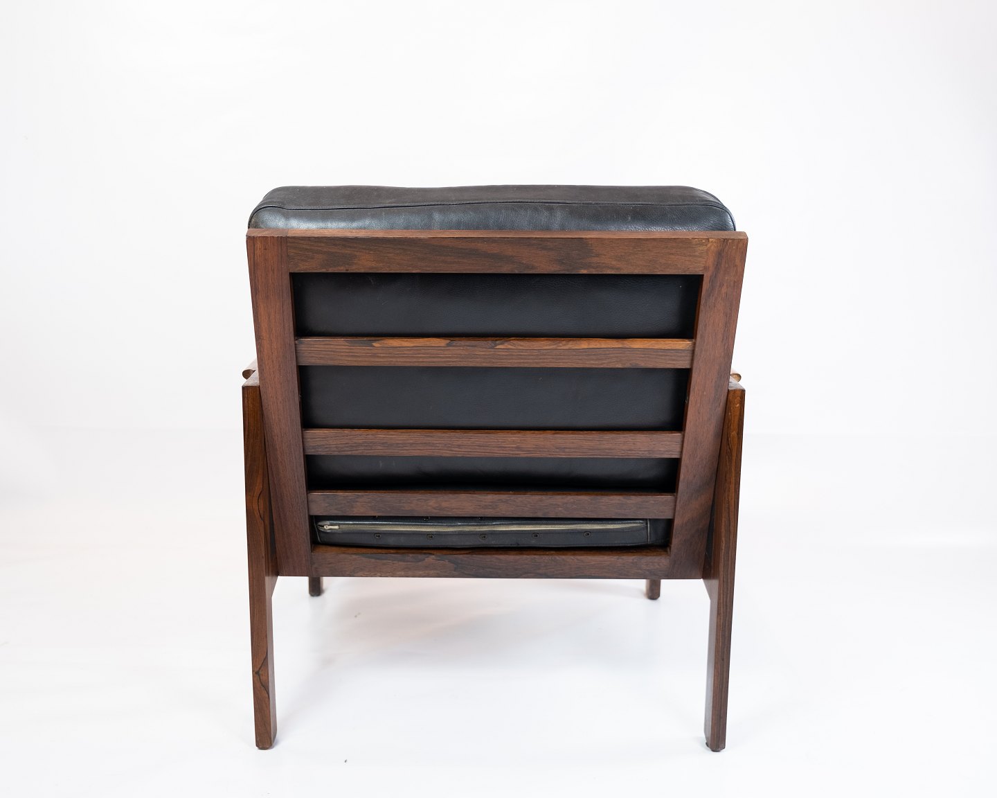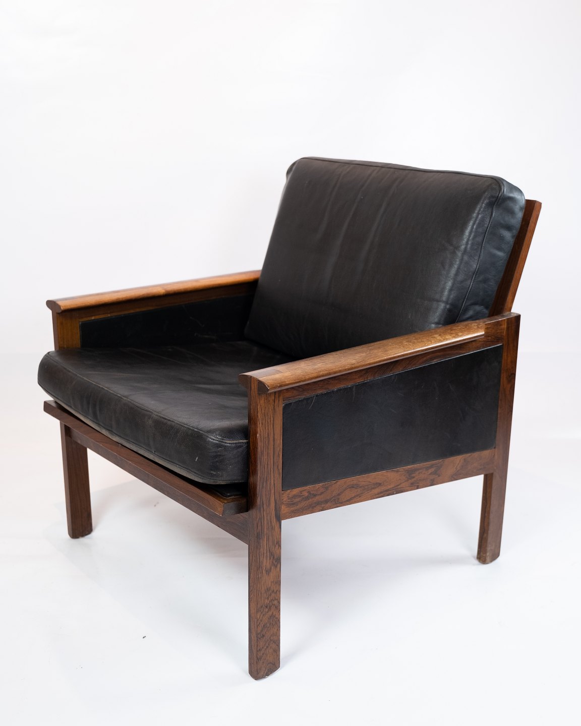The set of armchairs, known as Model Capella, is a beautiful example of Danish furniture design from the 1960s. These armchairs were designed by the renowned furniture designer Illum Wikkelsø and are created with a unique combination of rosewood and black elegance leather.