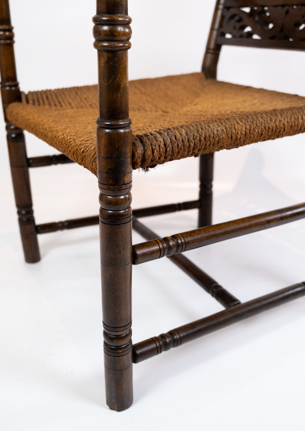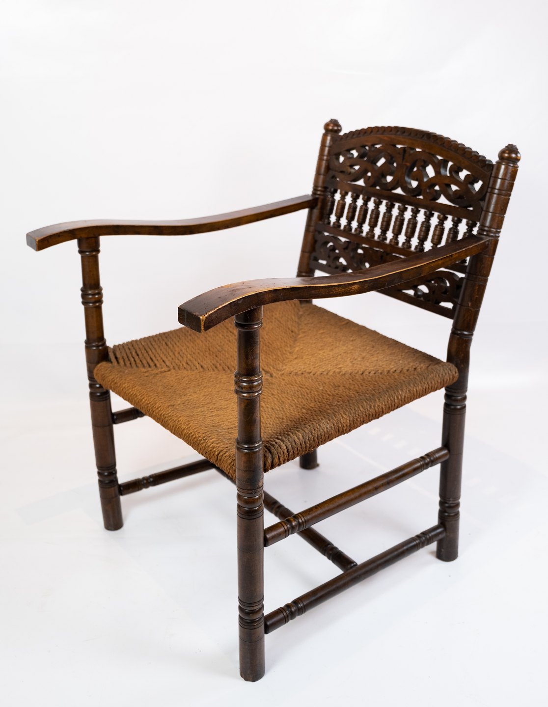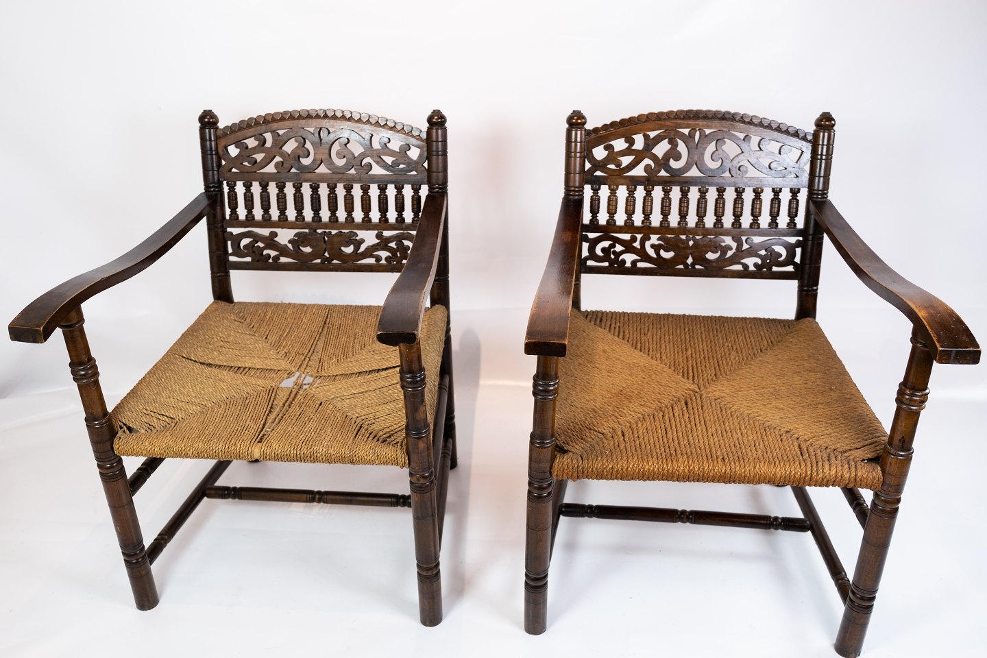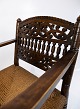 Et par antikke armstole af mørkt træ og flet fra 1920erne. Begge stole er i flot antik stand.