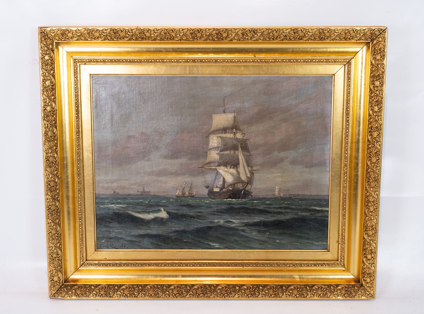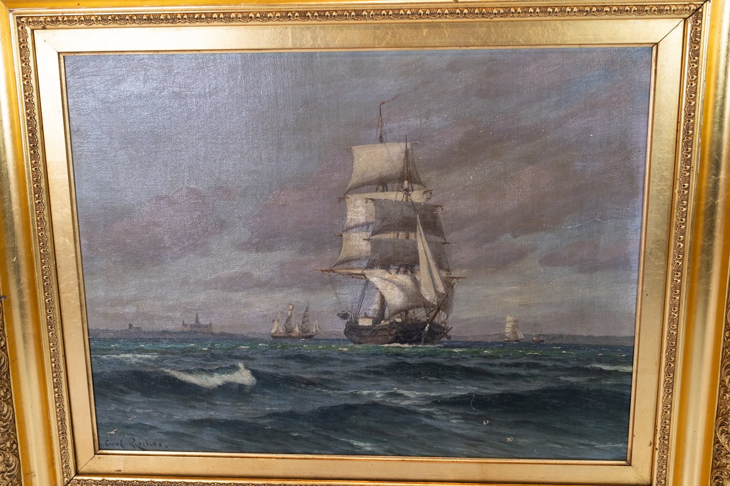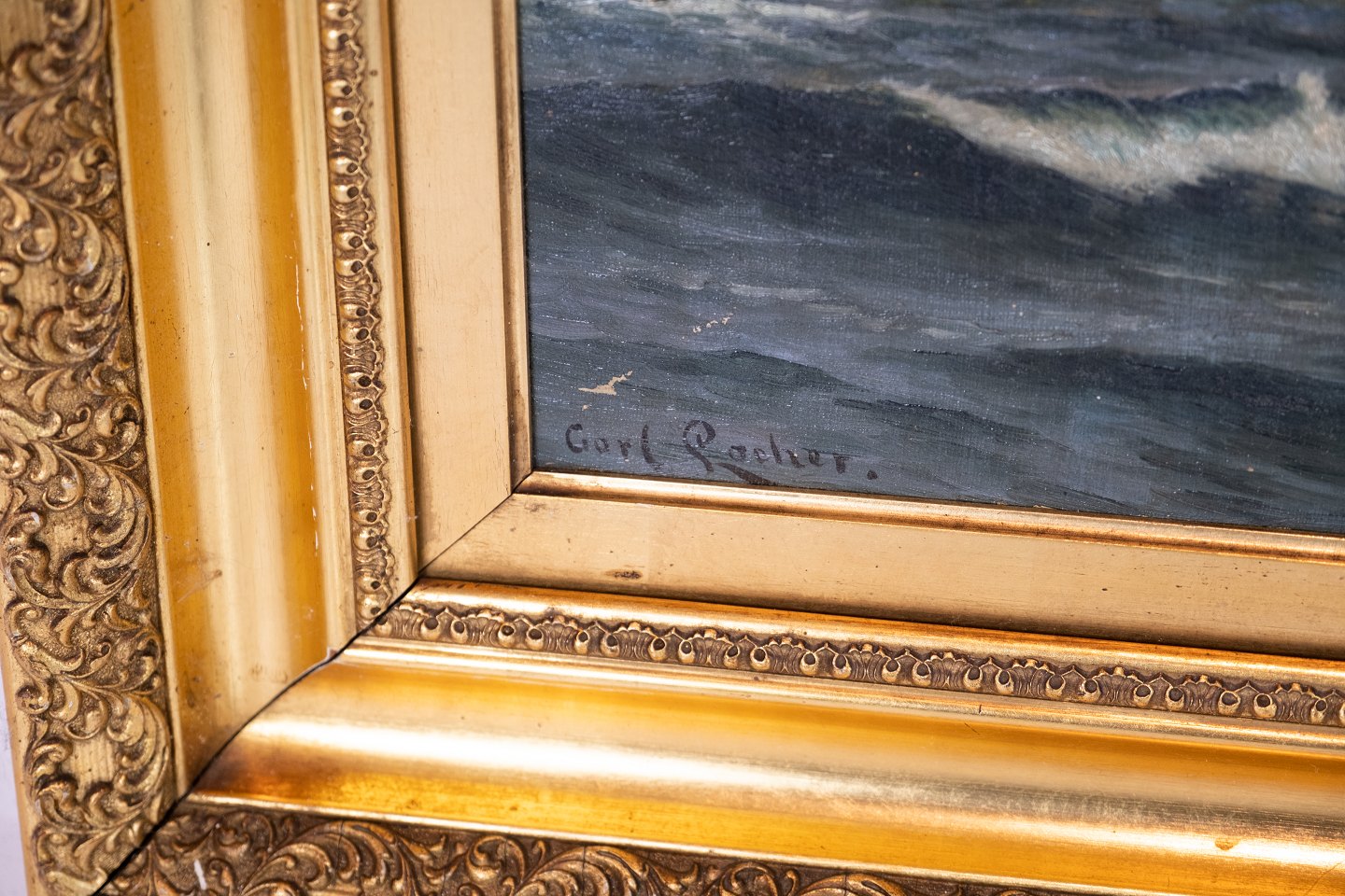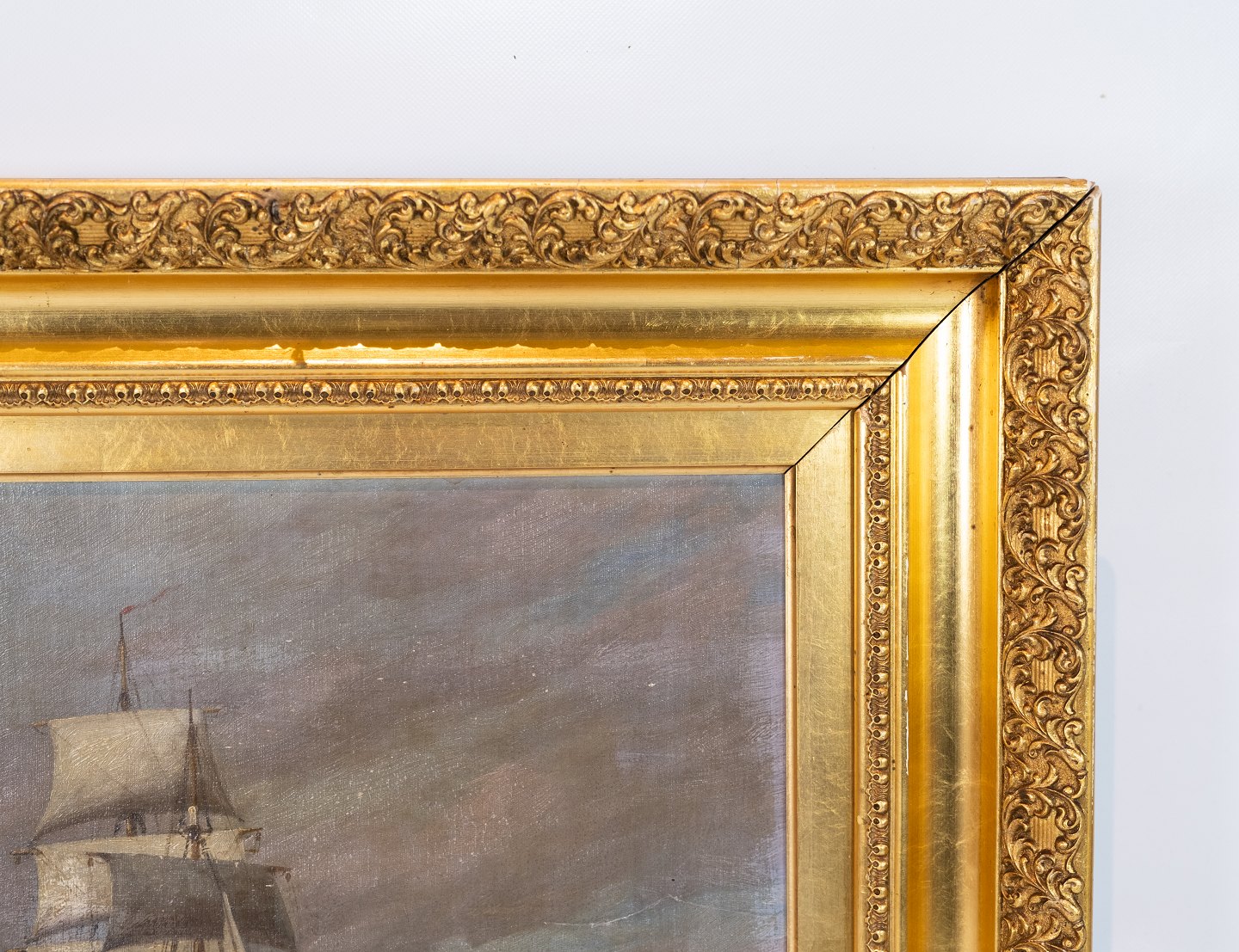 SoldOil painting with marine motif with gilded frame signed Carl Locher. The painting is in great vintage condition. Carl Locher was born in Flensburg in 1851 and died in Skagen in 1915.