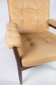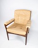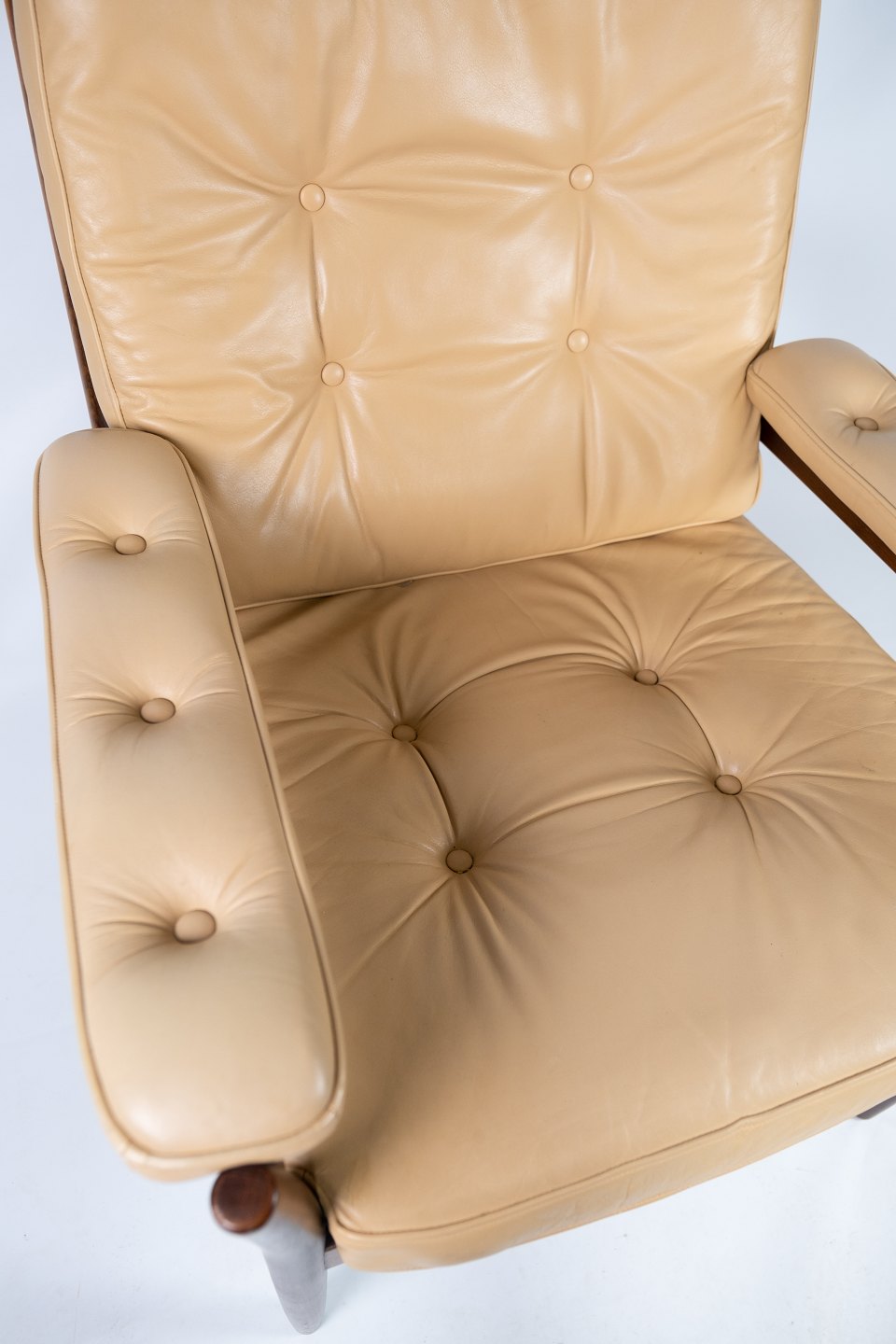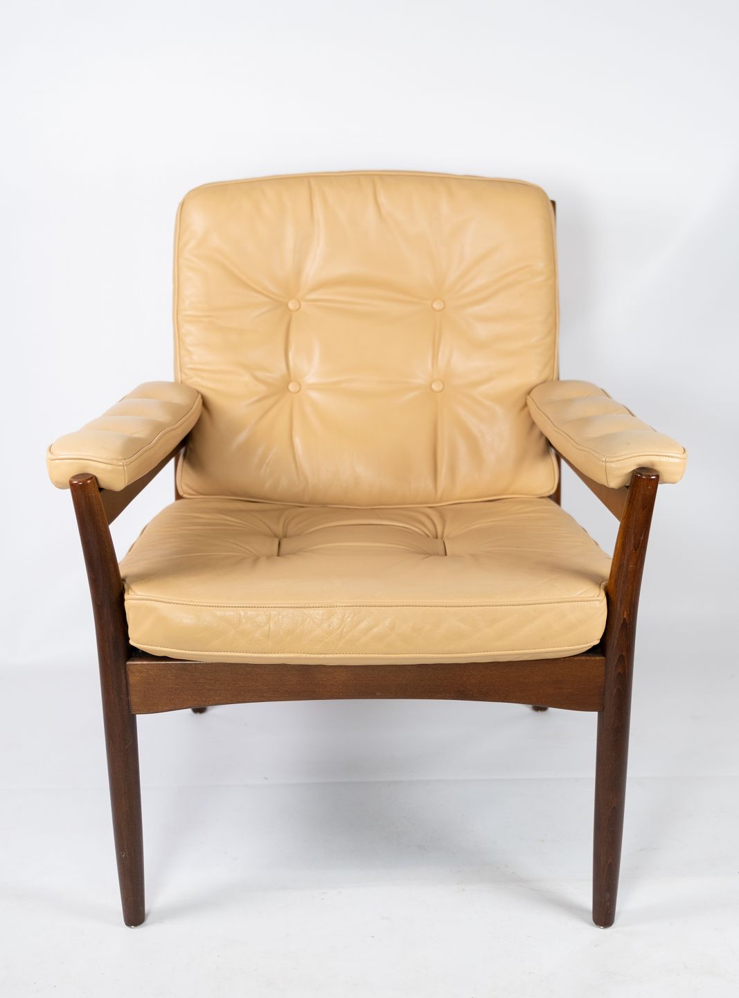 This armchair in dark wood, upholstered in light elegance leather, is an elegant example of Swedish furniture design from the 1960s. Manufactured by Göte Møbler, a renowned furniture company known for their quality and craftsmanship, this chair is a timeless symbol of Scandinavian design heritage.