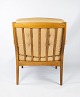 The dark wood adds a warm and sophisticated tone to the chair, while the light elegance leather provides a luxurious and comfortable sitting experience. The chair is in nice used condition, which testifies to its durability and quality over the years.