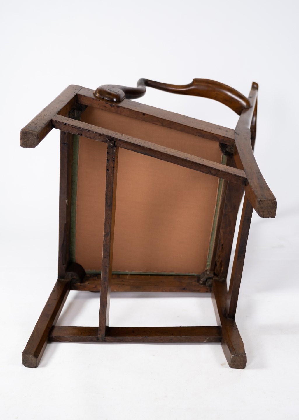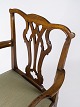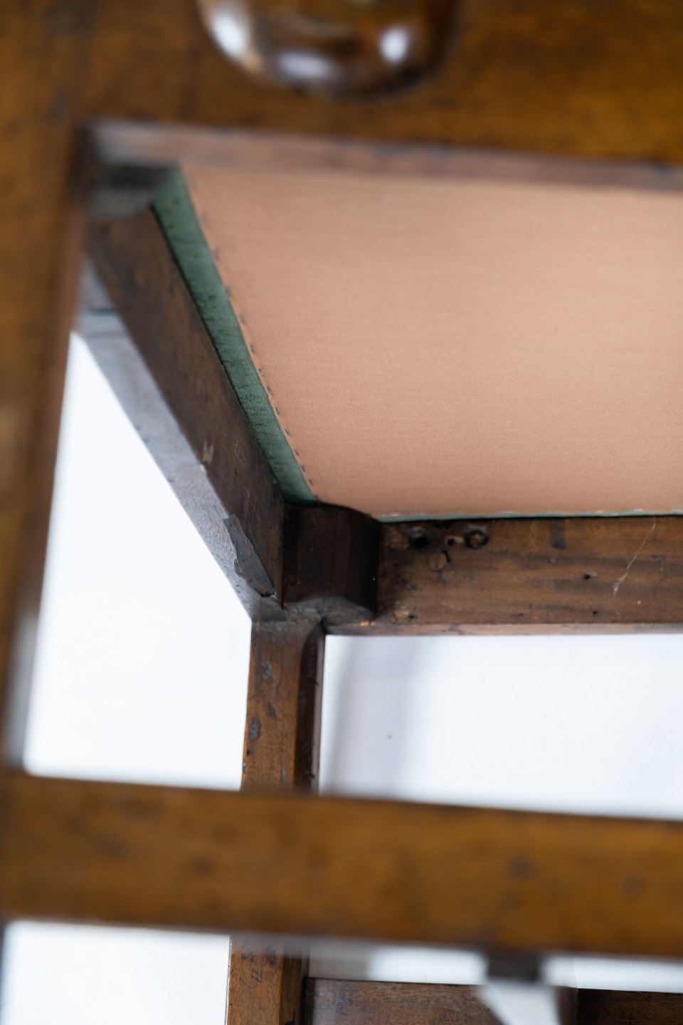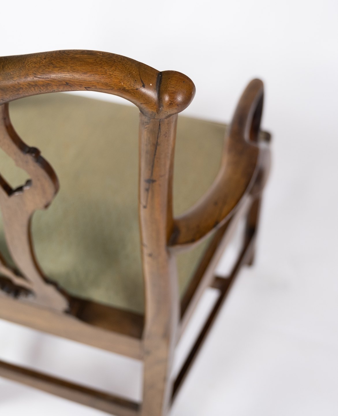 Antik armstol af lys mahogni og polstret med grønt uld stof fra 1890erne.