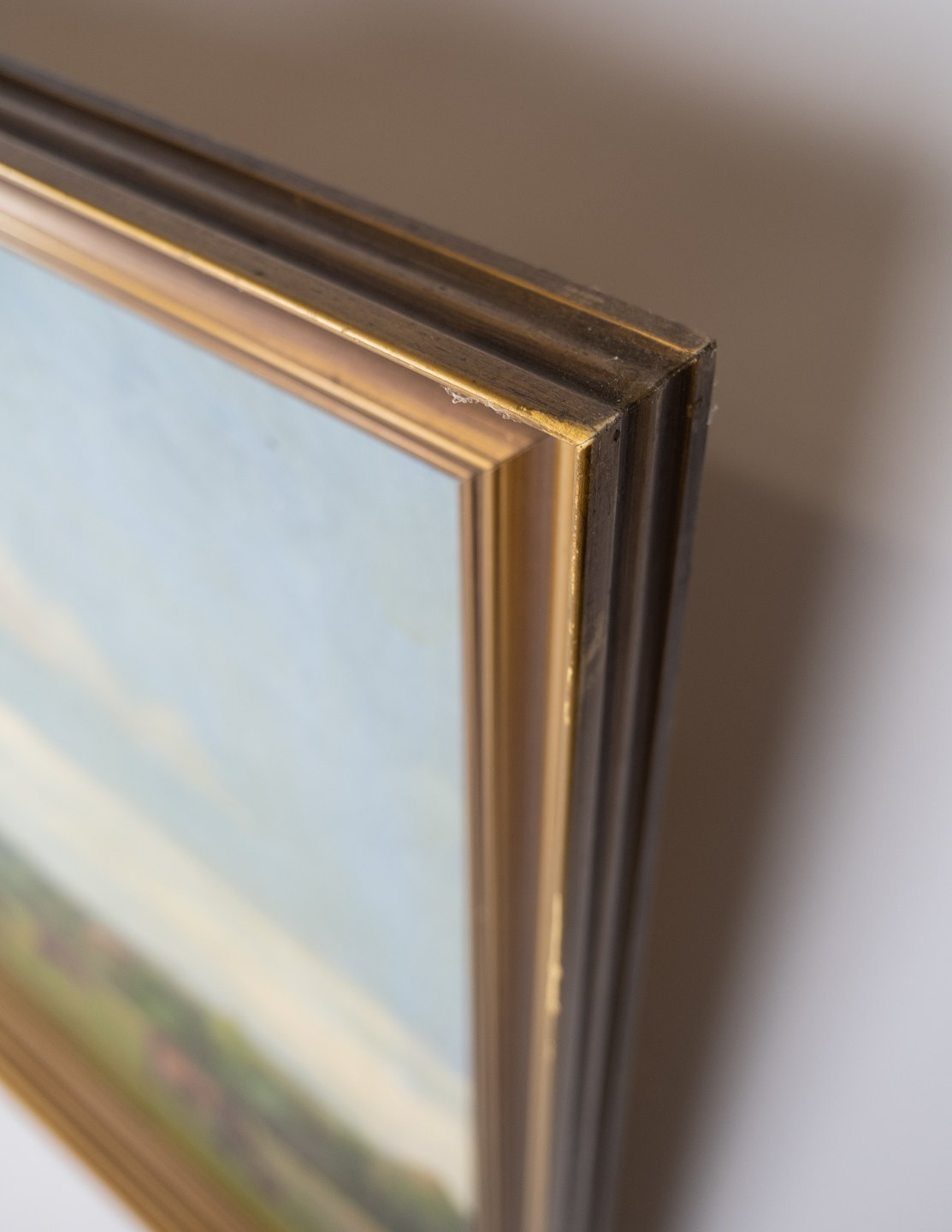 Oliemaleri med land motiv og forgyldt ramme, af Niels Christiansen.