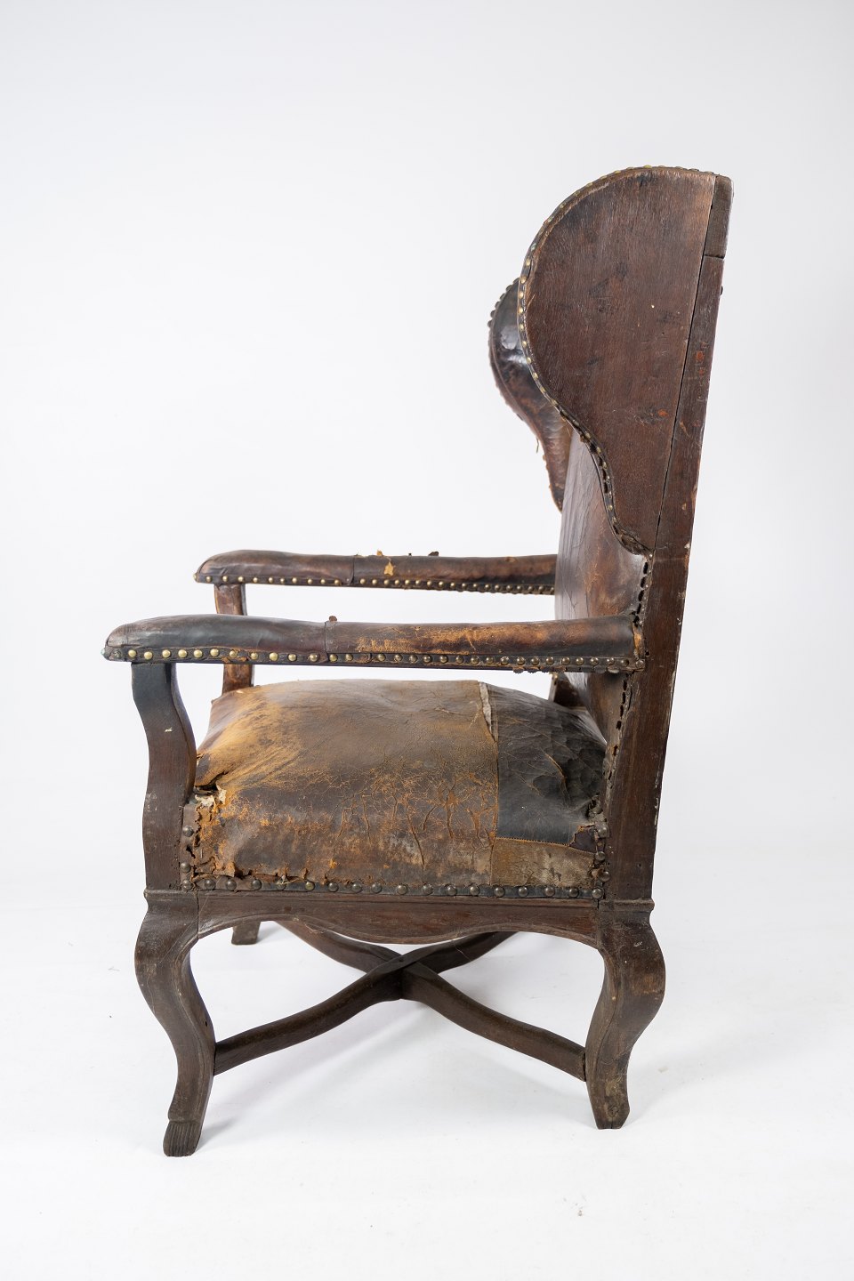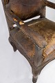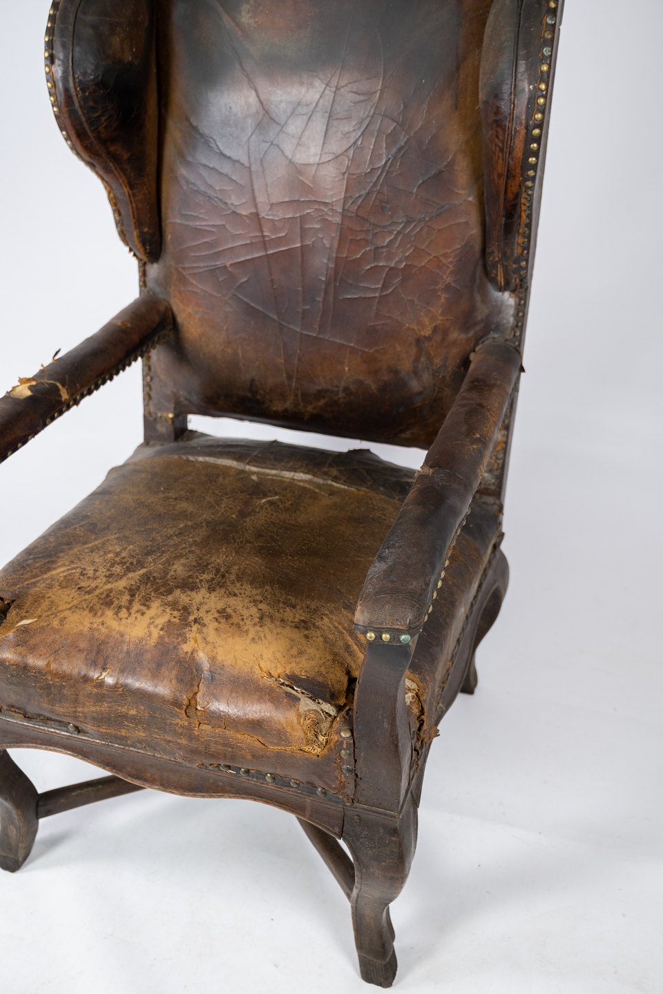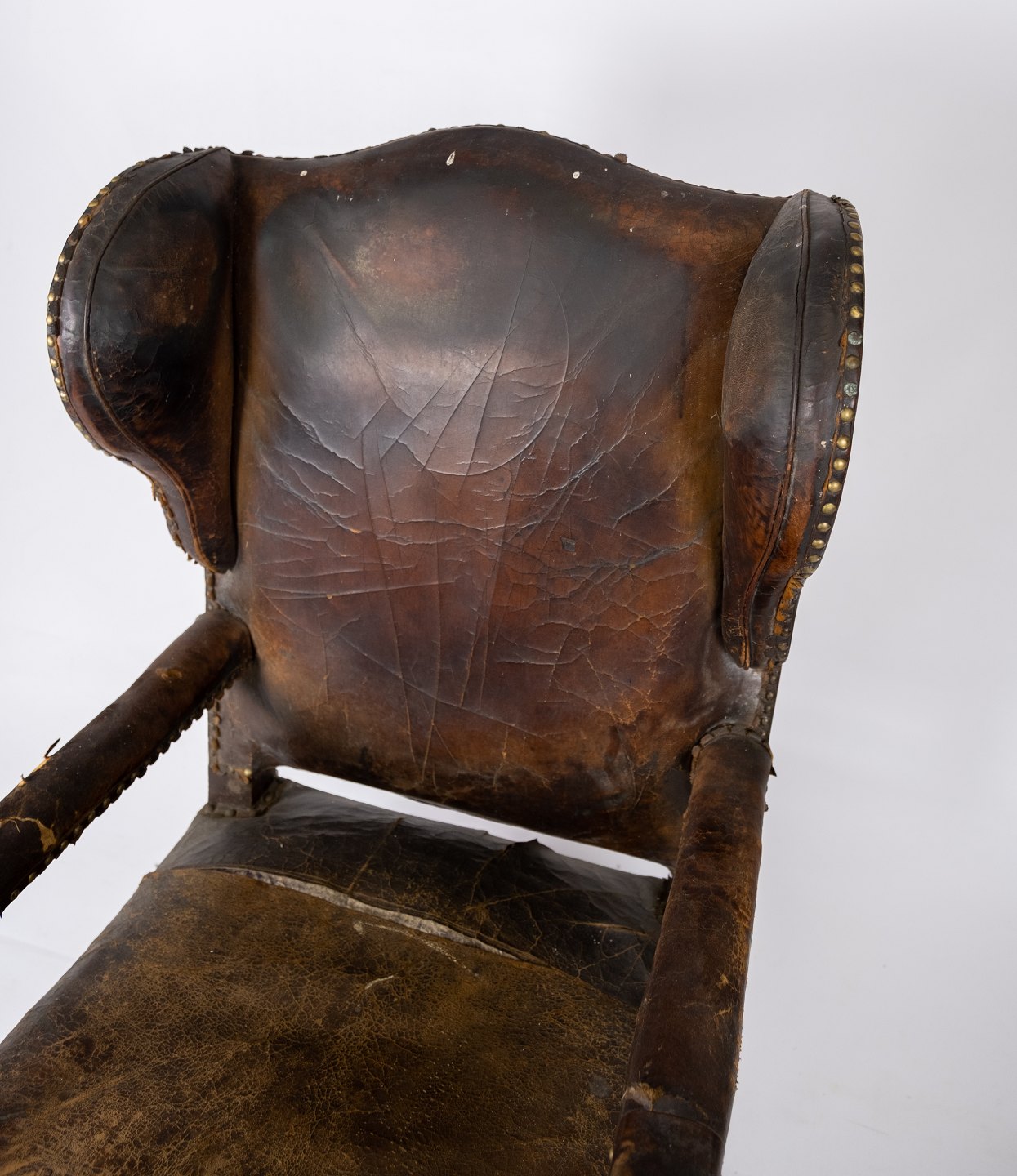 Antik øreklapstol med originalt mørkebrunt læder fra 1790.