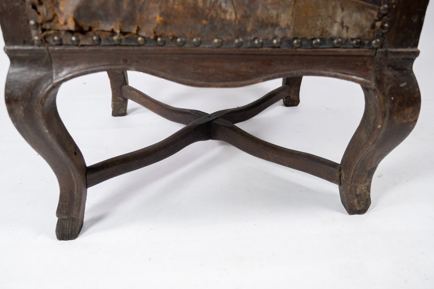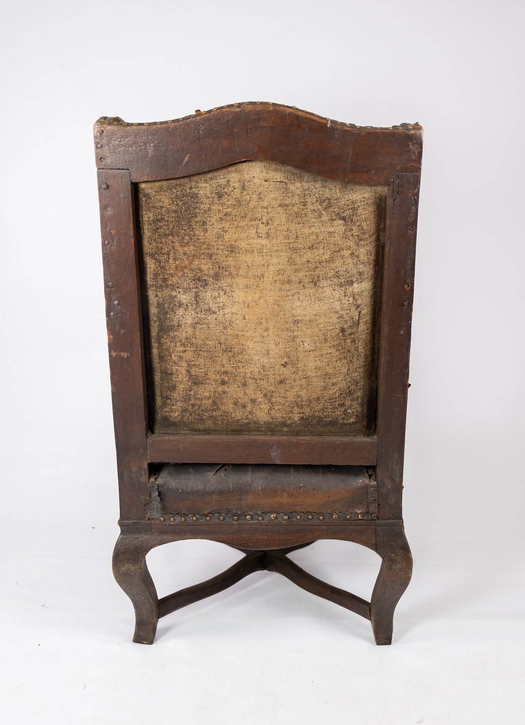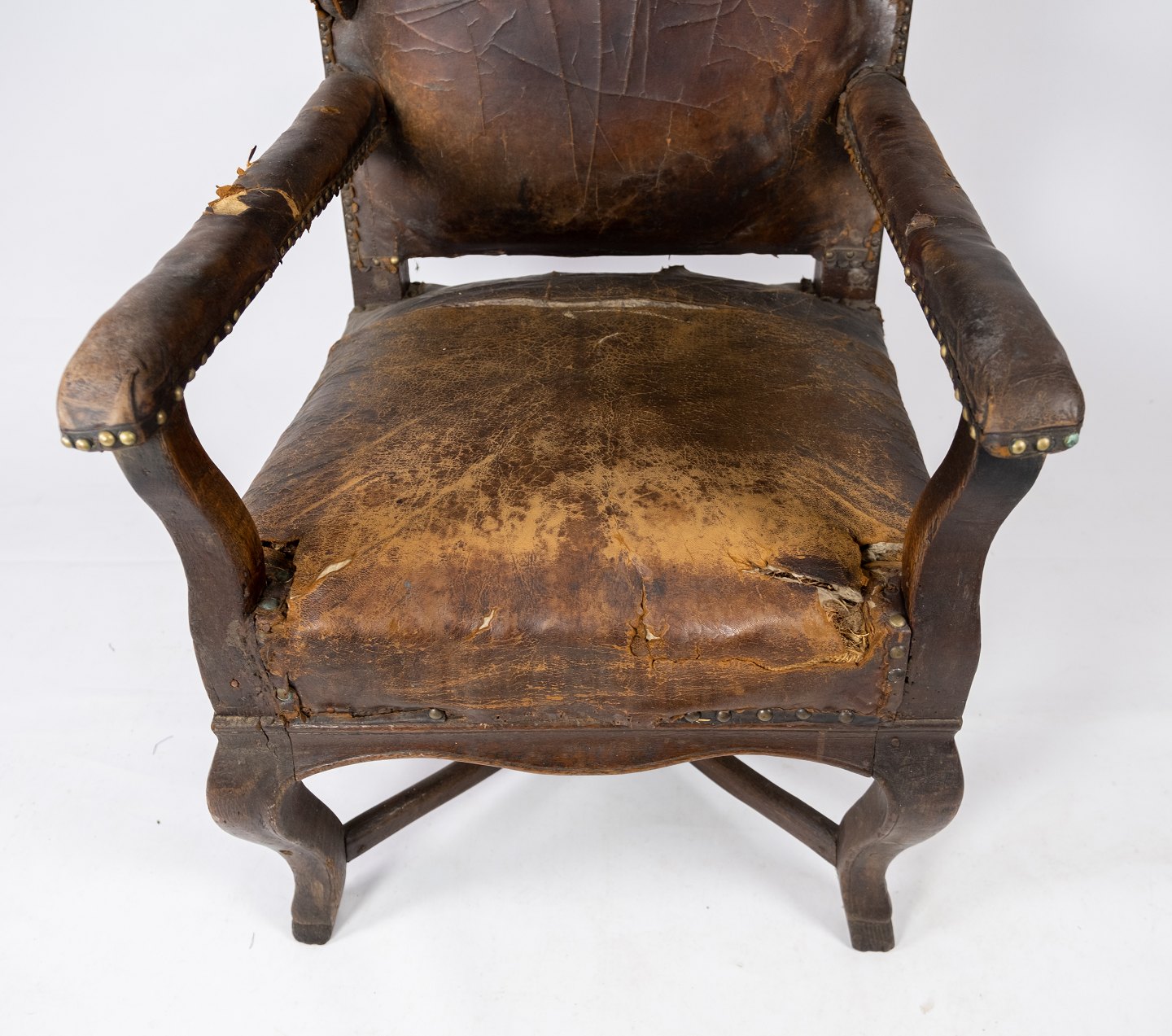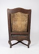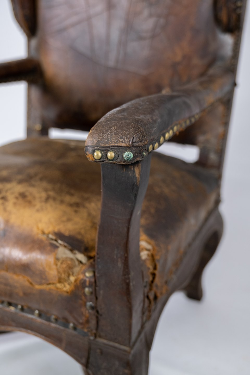 Antik øreklapstol med originalt mørkebrunt læder fra 1790.
