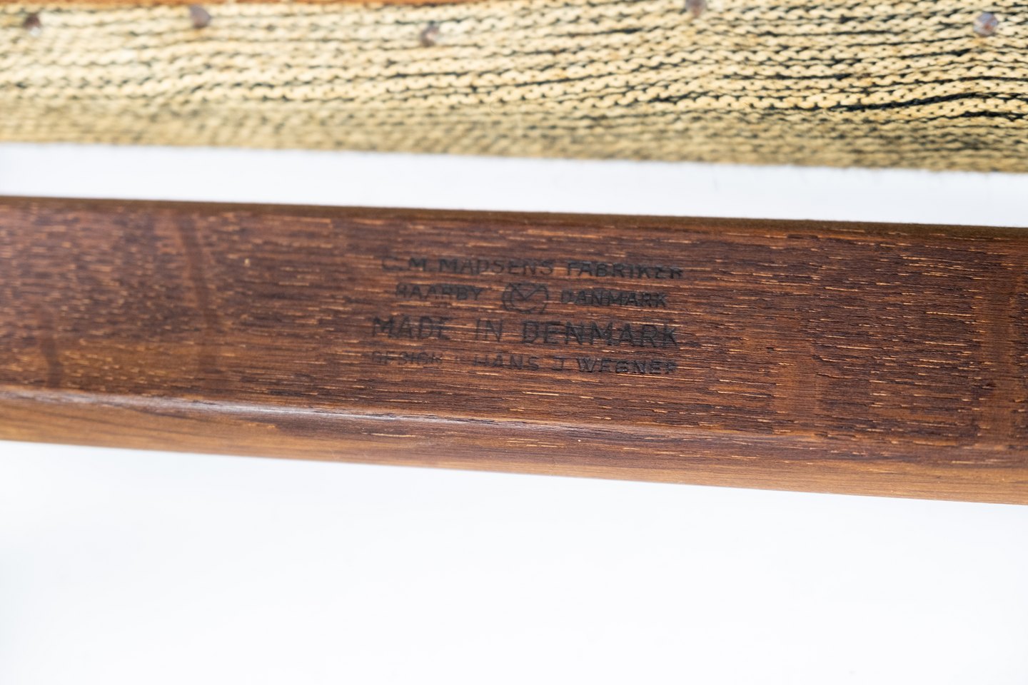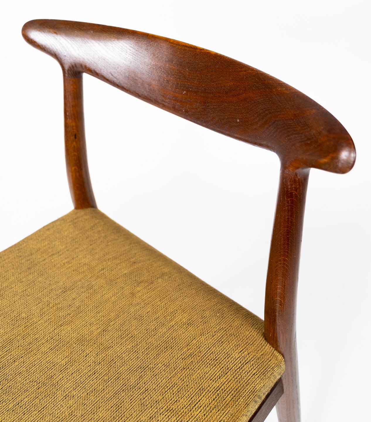 Set of four dining room chairs, model W2, designed by Hans J. Wegner from the 1960s. The chairs are of oak and upholstered with light fabric.