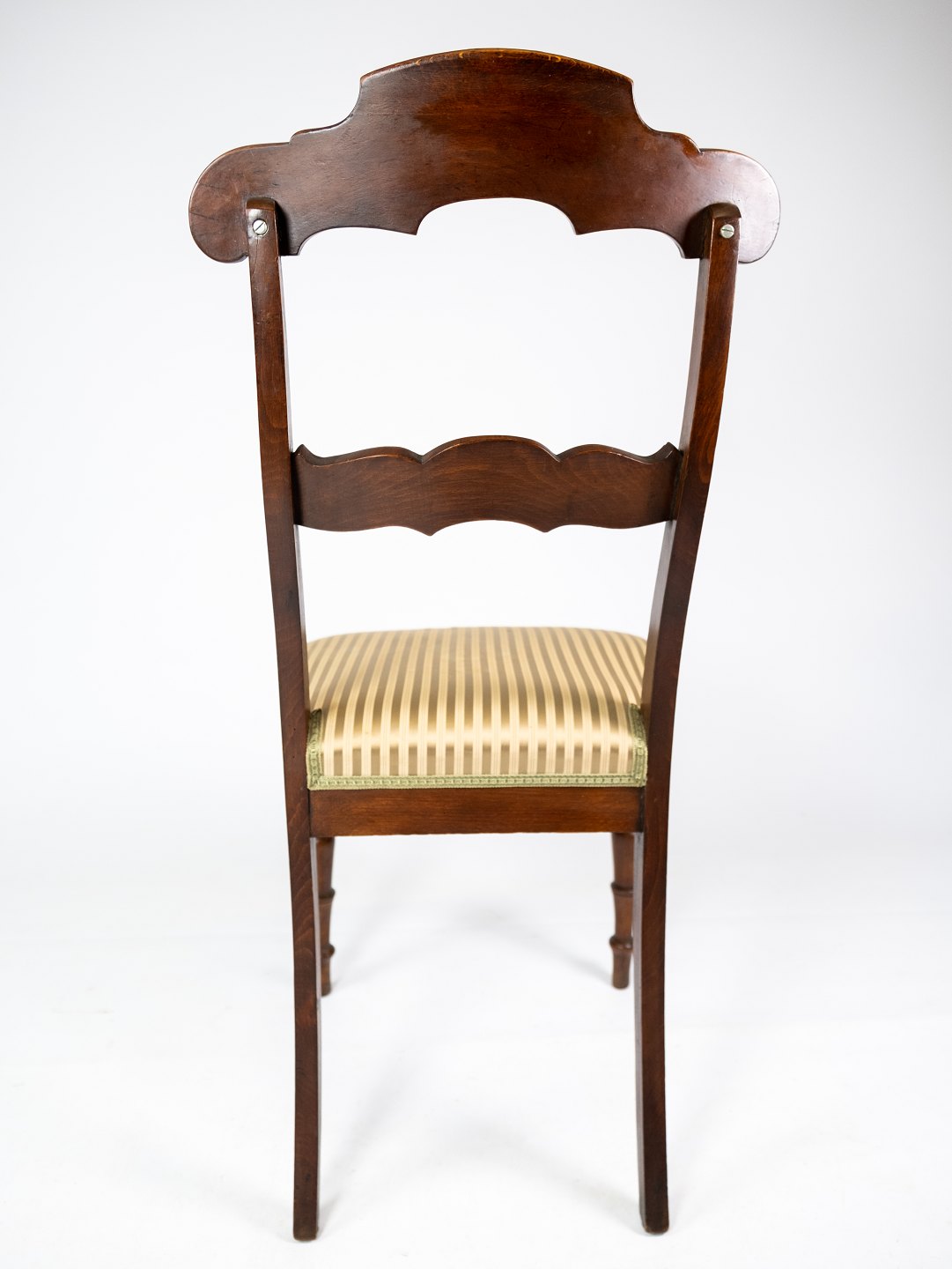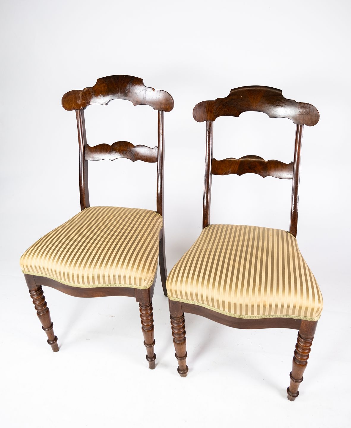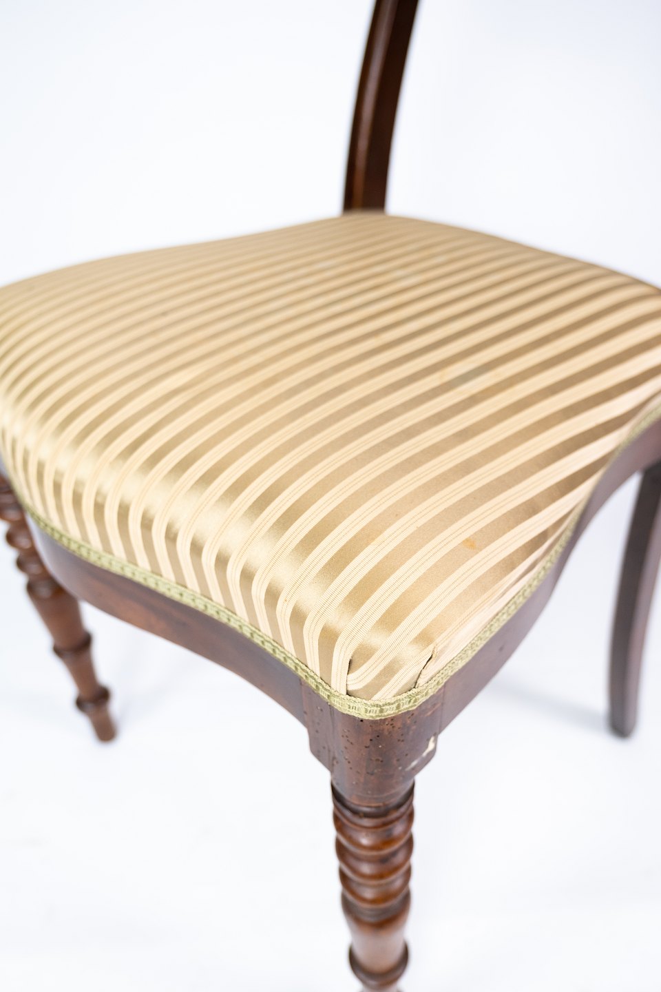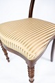 Et sæt salonstole af mahogni og polstret med stribet stof fra 1860erne. Stolene er i flot brugt stand.