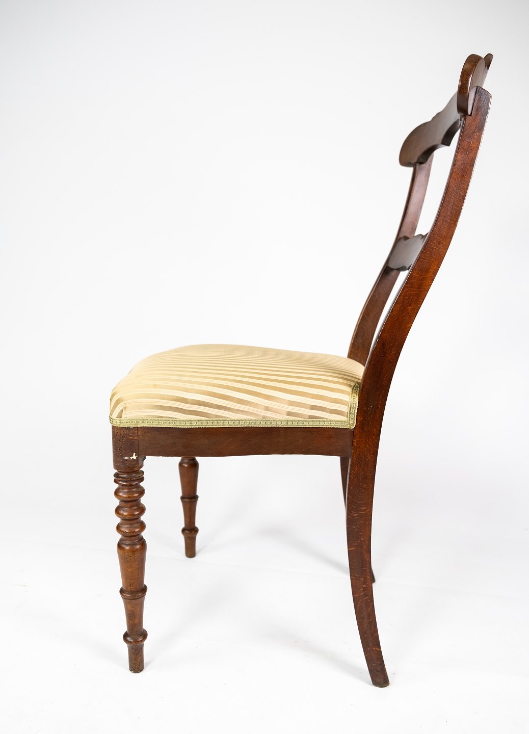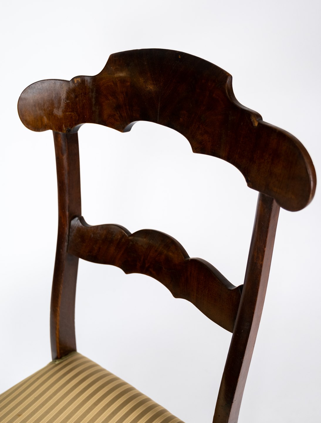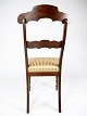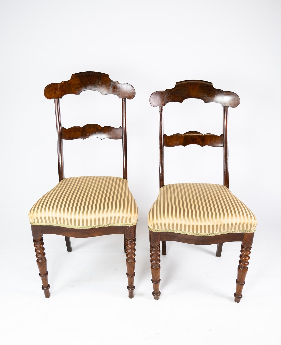 Et sæt salonstole af mahogni og polstret med stribet stof fra 1860erne. Stolene er i flot brugt stand.