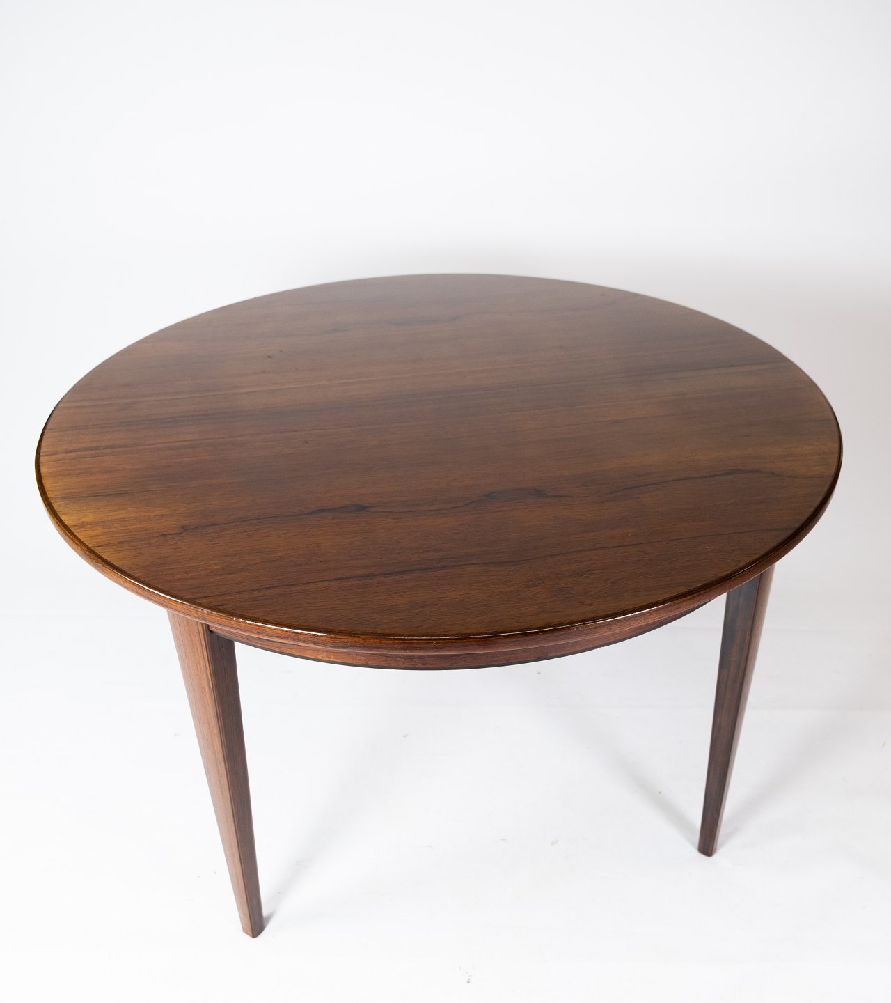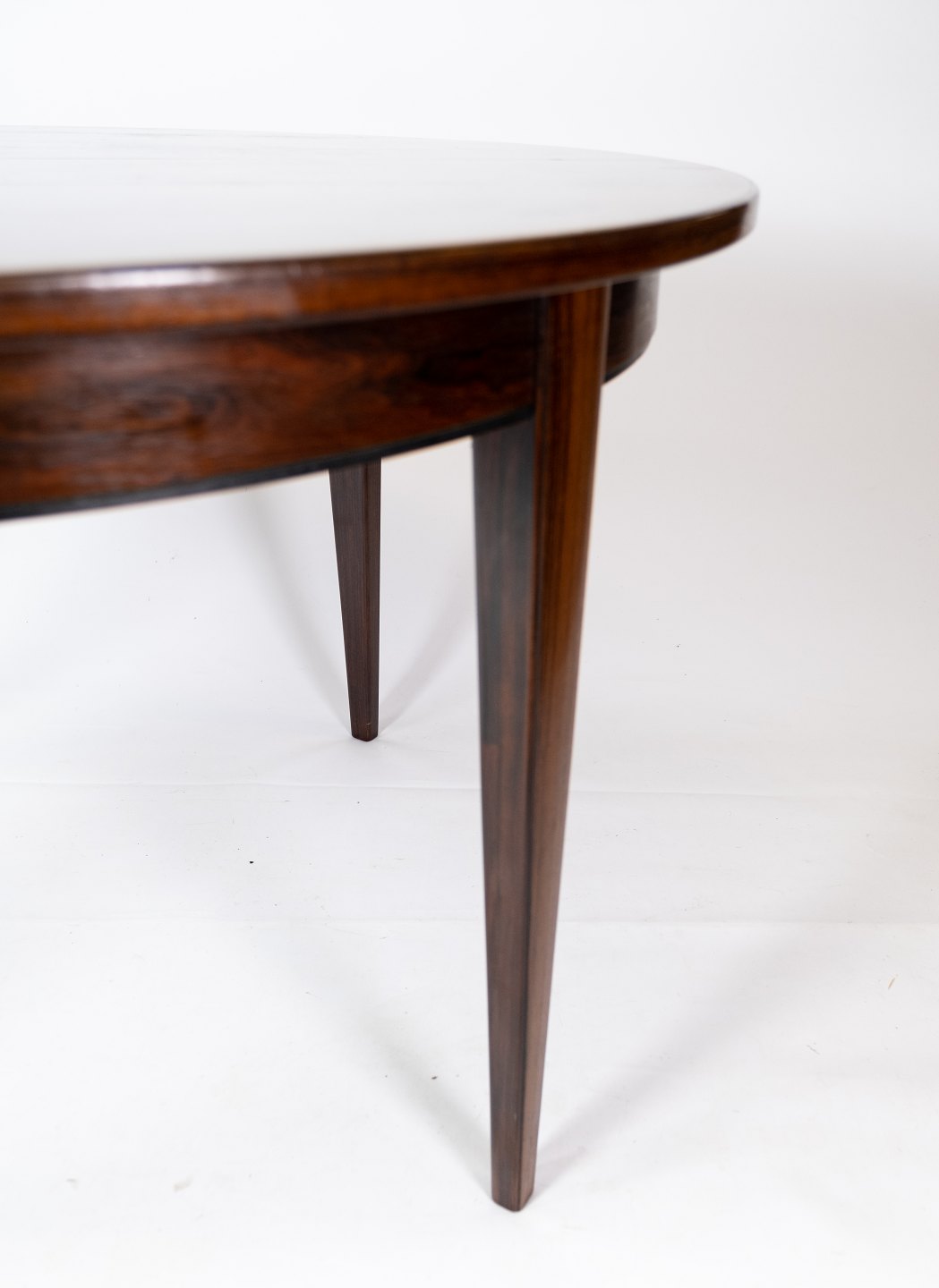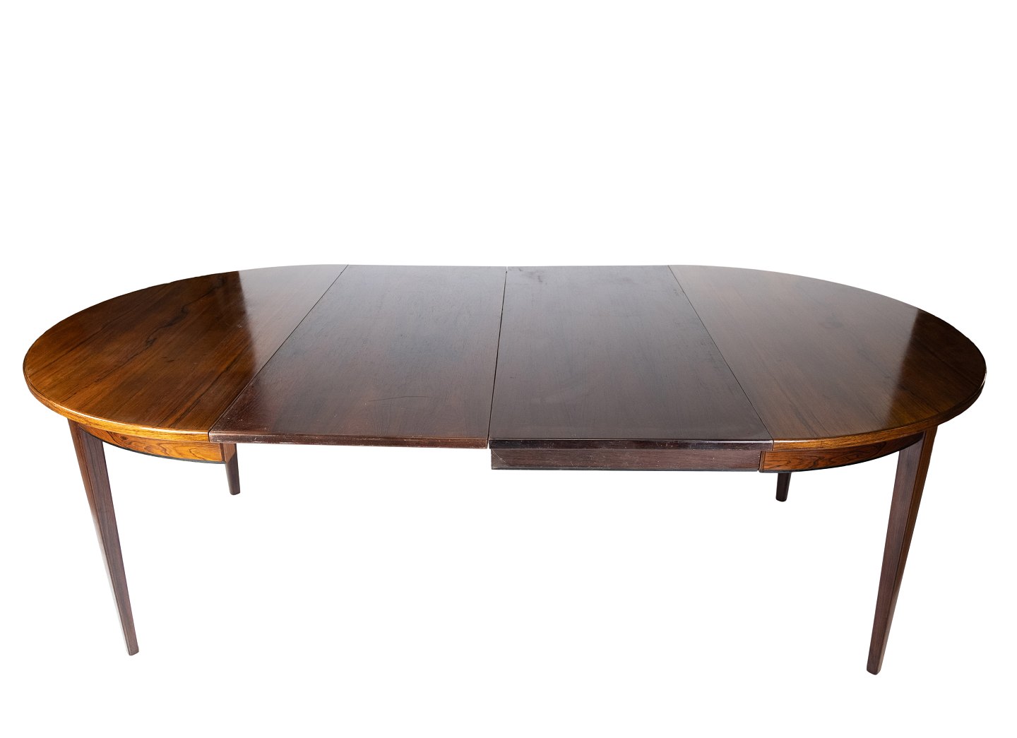 This rosewood dining table is an example of the fine craftsmanship of Oman Junior, a renowned Danish furniture manufacturer active in the 1960s. The warm tones and beautiful veins of the rosewood give the table a timeless elegance and a distinctive aesthetic.