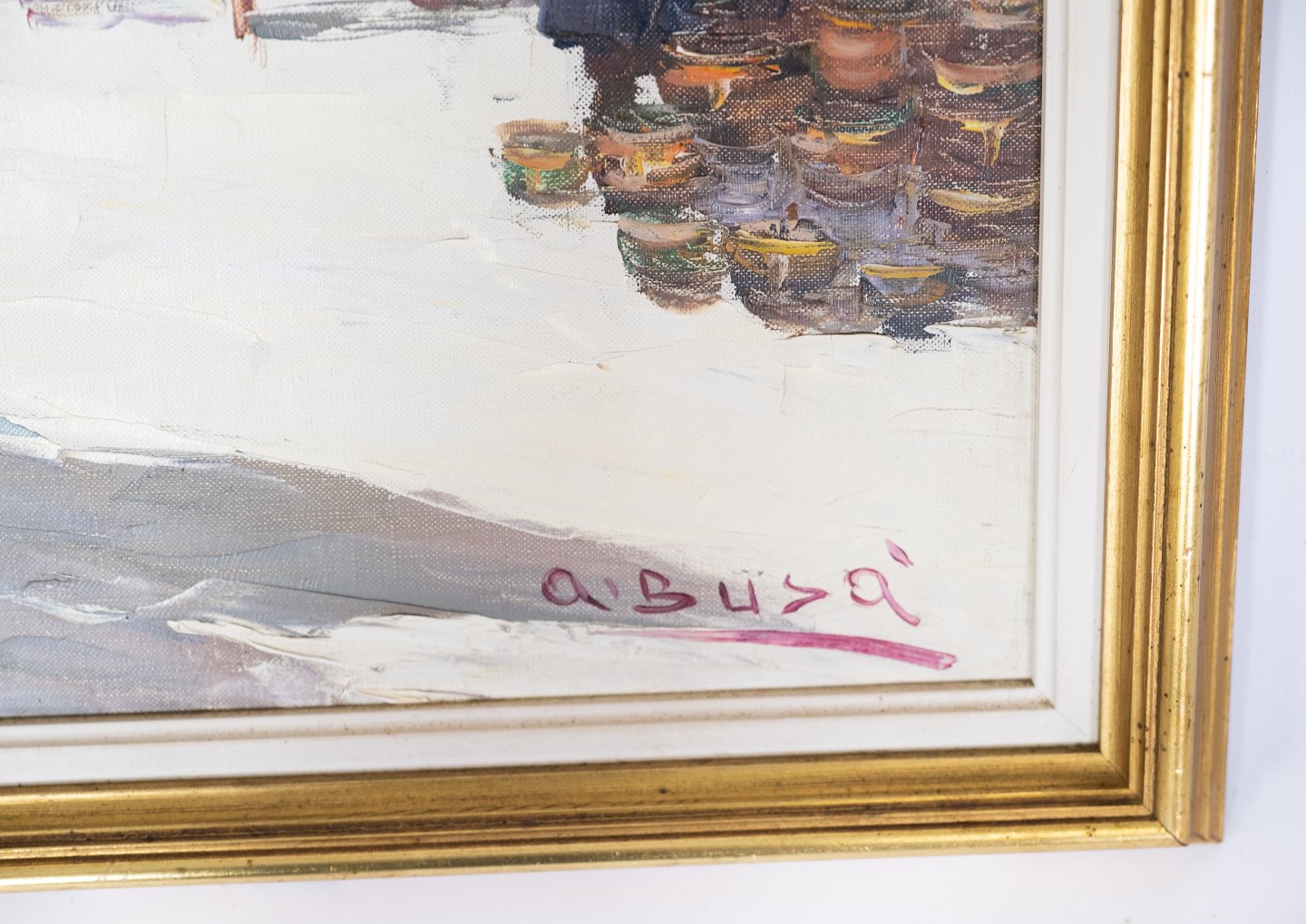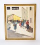 Oliemaleri med bymotiv og forgyldt ramme, signeret A. Suza fra 1940erne.