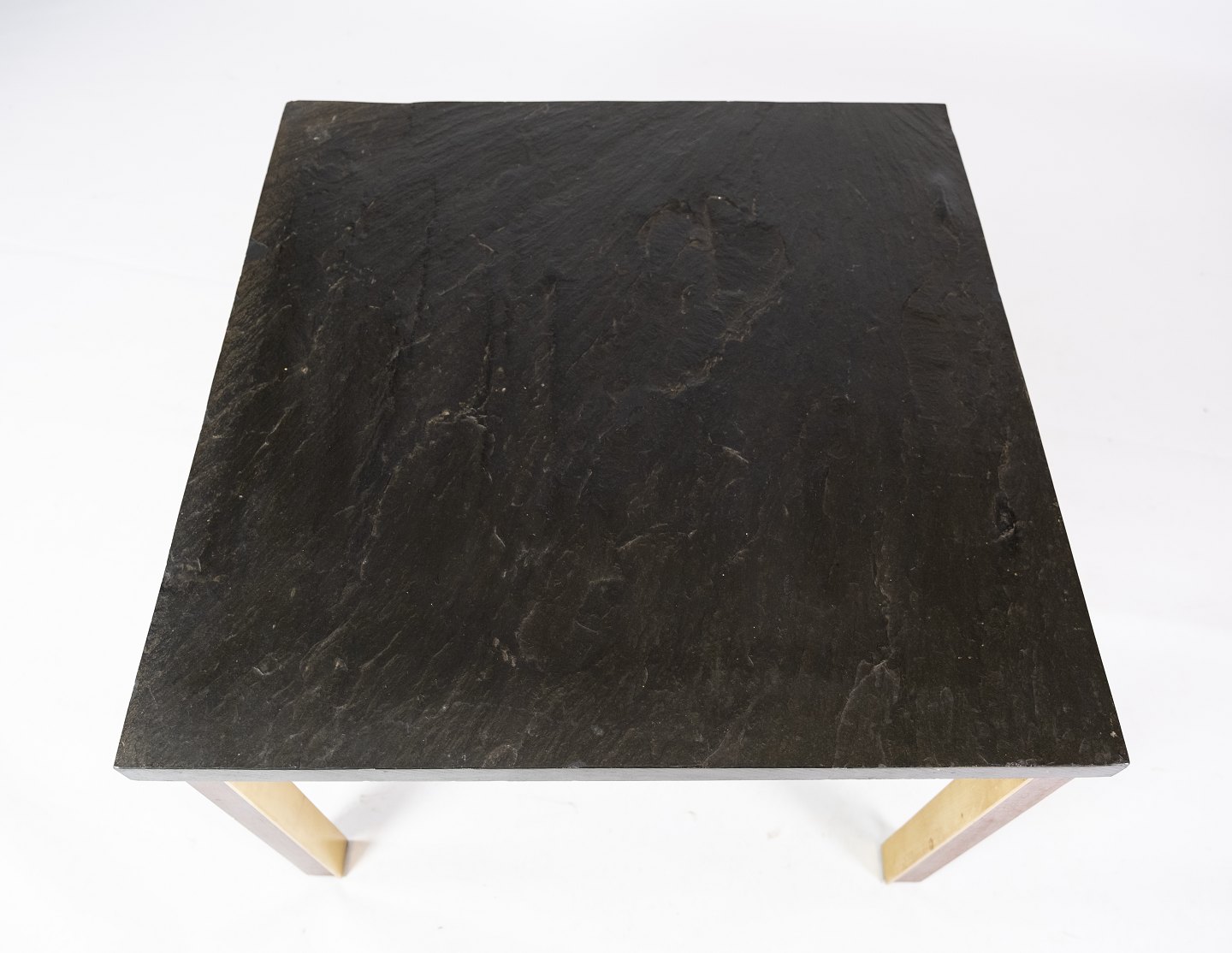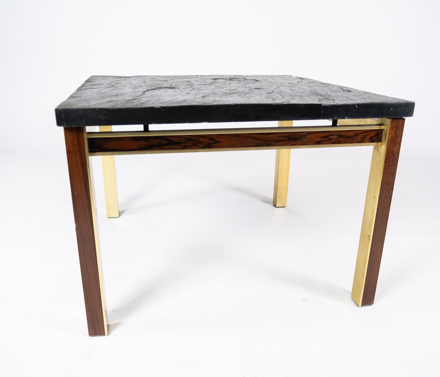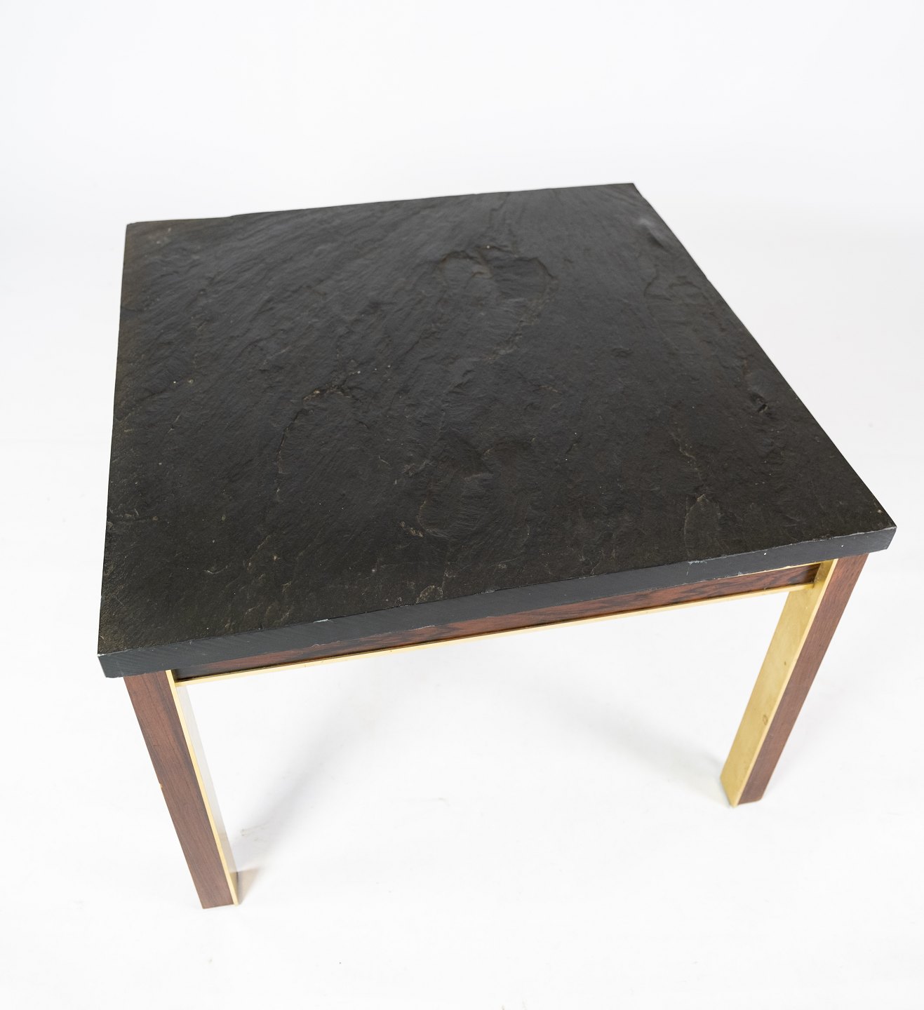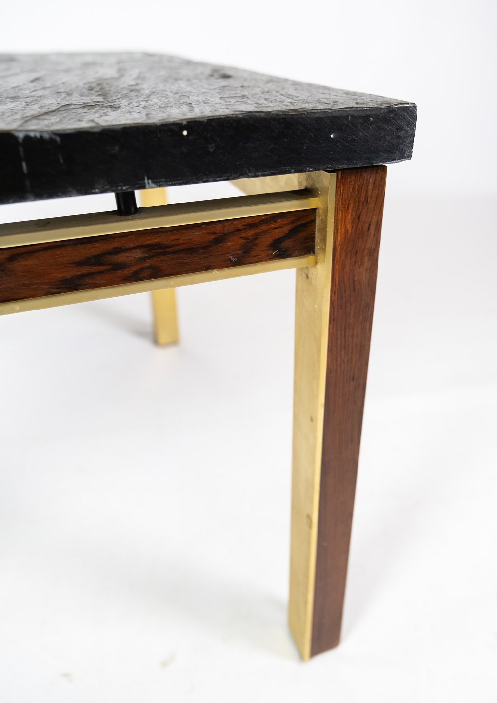 Sofabord med skifer plade og stel i forgyldt metal samt palisander af Bendixen design fra 1970erne. Bordet er i flot brugt stand.