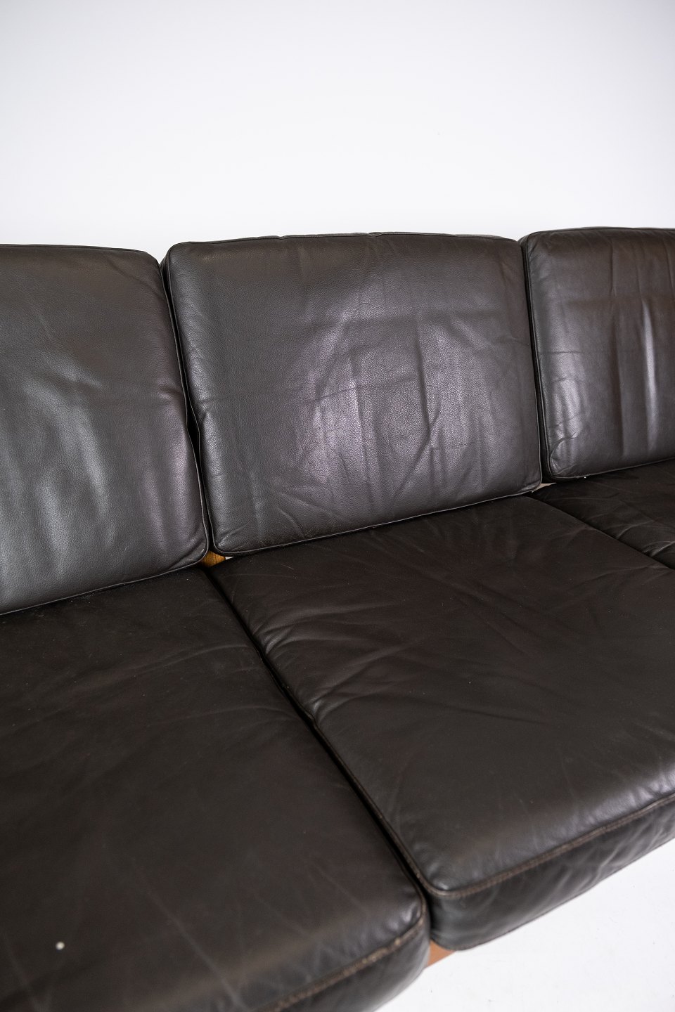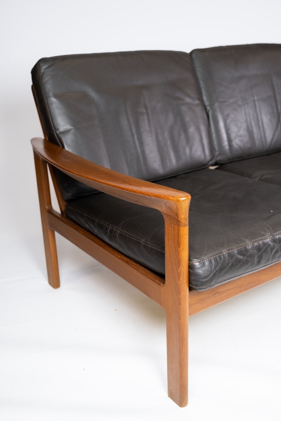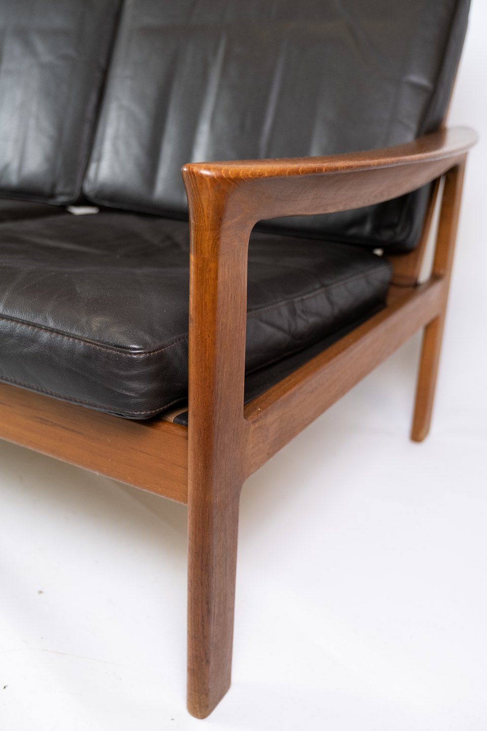 Sofaens ramme i teak træ tilføjer en varm og naturlig tone til rummet, mens det sorte læderbetræk giver et strejf af luksus og sofistikering. Med sit strømlinede design og rene linjer er denne sofa et ikonisk eksempel på dansk møbeldesign fra midten af det 20. århundrede.
