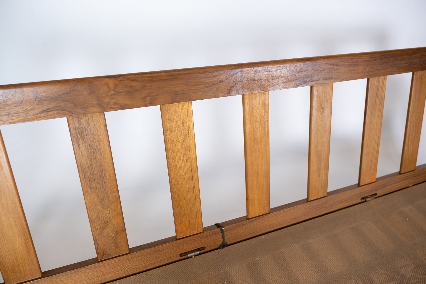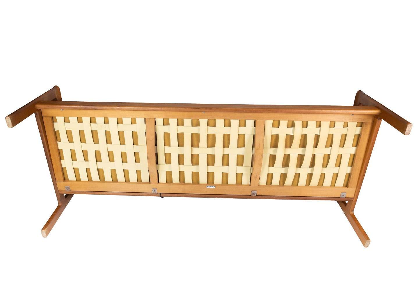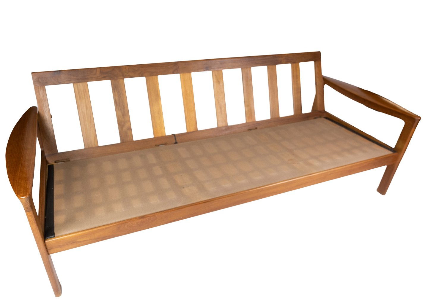 Sofaens ramme i teak træ tilføjer en varm og naturlig tone til rummet, mens det sorte læderbetræk giver et strejf af luksus og sofistikering. Med sit strømlinede design og rene linjer er denne sofa et ikonisk eksempel på dansk møbeldesign fra midten af det 20. århundrede.
