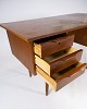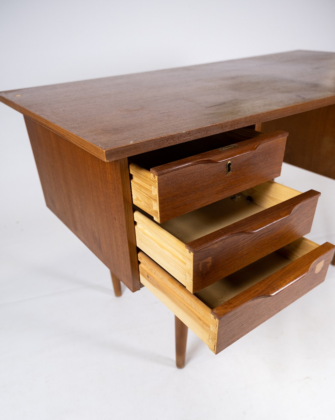 This desk is a beautiful example of Danish design from the 1960s, made of teak wood, which gives it a natural and timeless look. The beautiful golden color and unique wood pattern add character and warmth to any room. With its simple and elegant design, the desk fits seamlessly into both modern and classic interiors.
