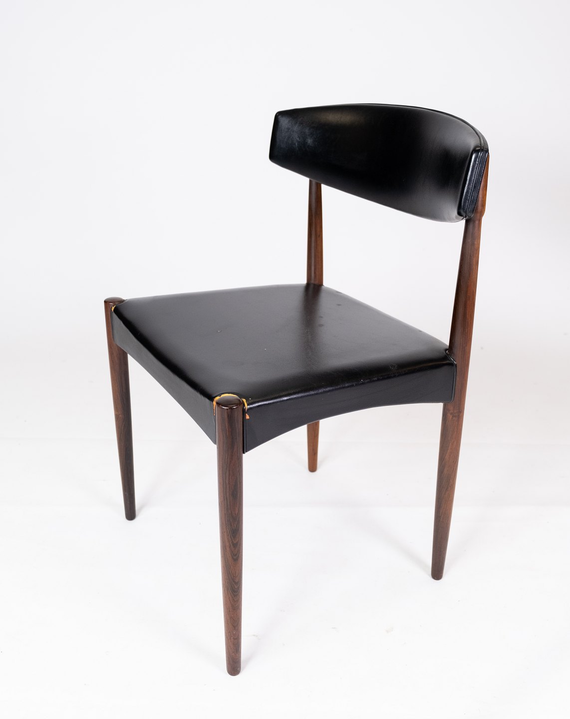 Dette sæt af fire spisestuestole er et smukt eksempel på dansk design fra 1960'erne. Stolene er fremstillet af palisander, et eksklusivt træ kendt for sin rige farve og smukke korn.