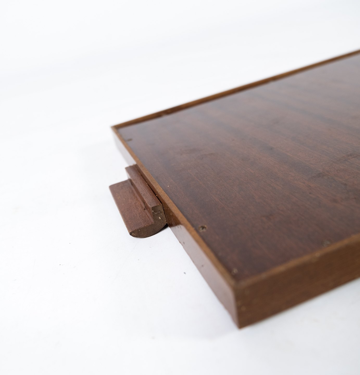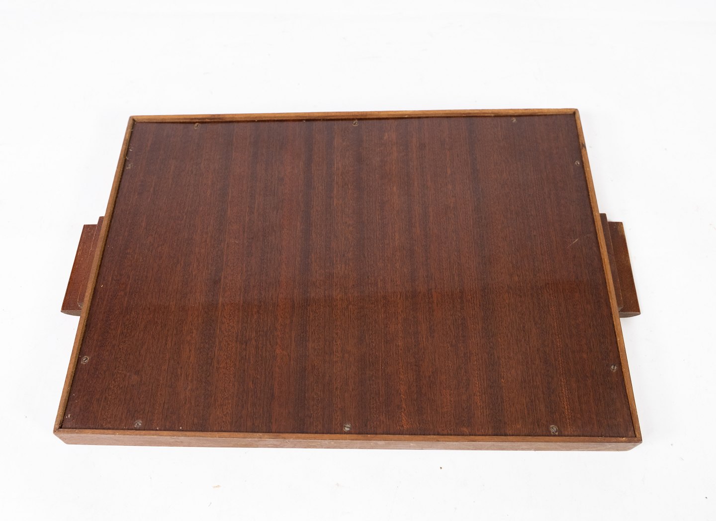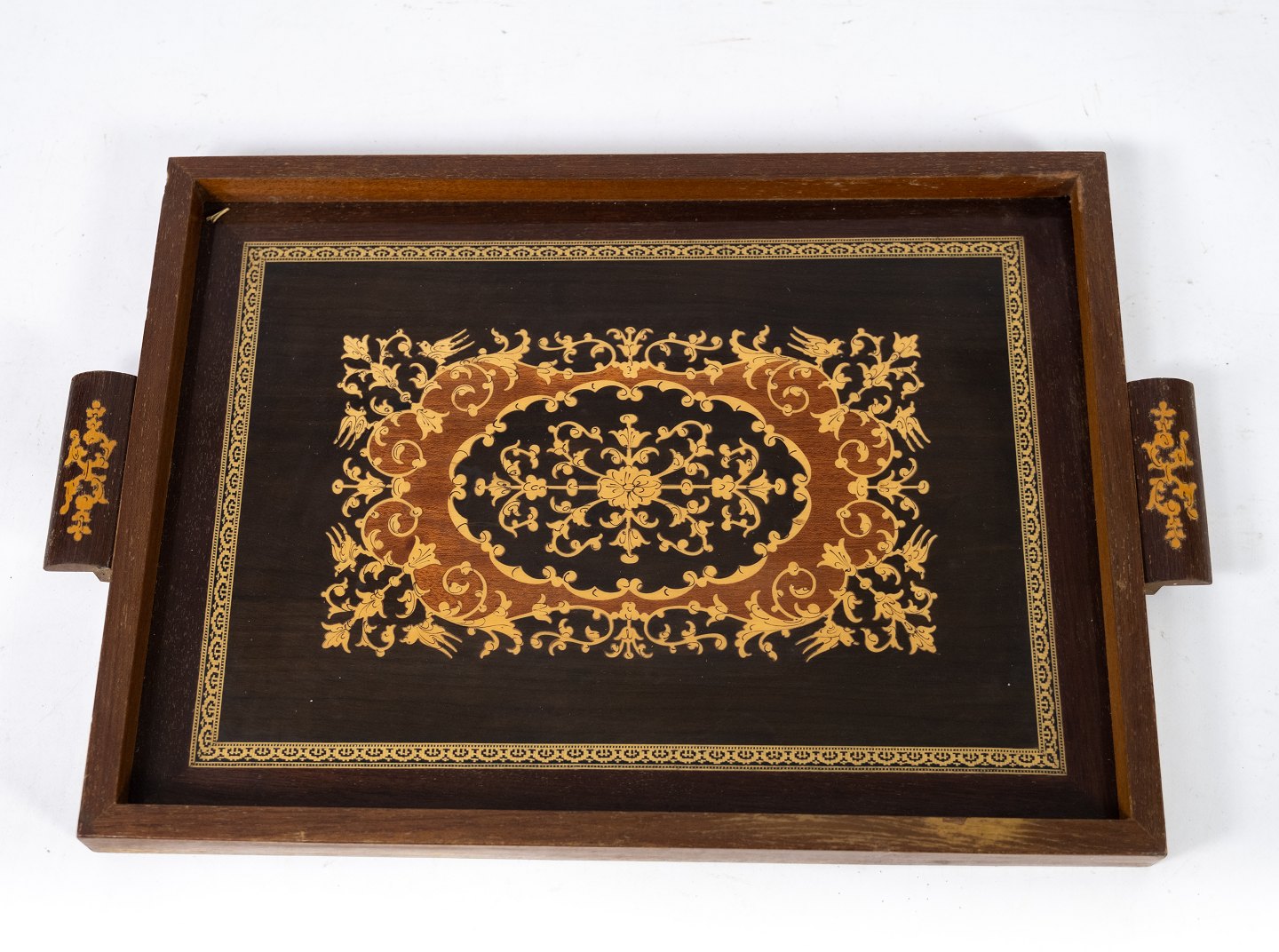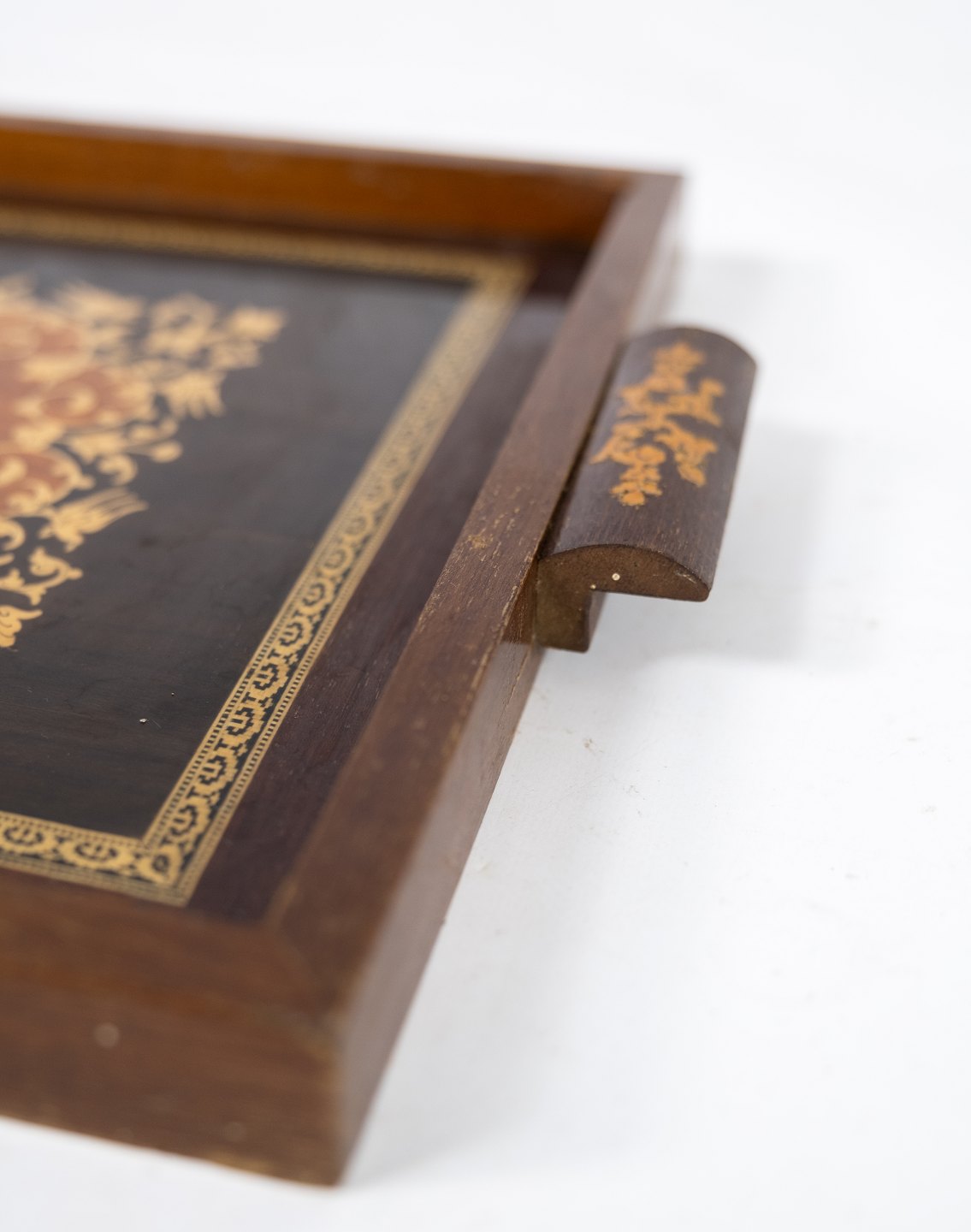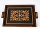 Serving tray of dark wood with inlaid wood, from the 1940s.