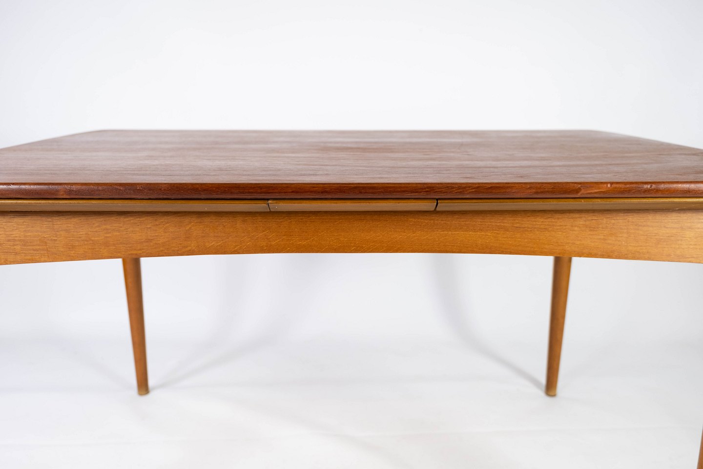 Spisebord i teak med hollandsk udtræk og ben af eg, af dansk design fra 1960erne. Bordet er i flot brugt stand.