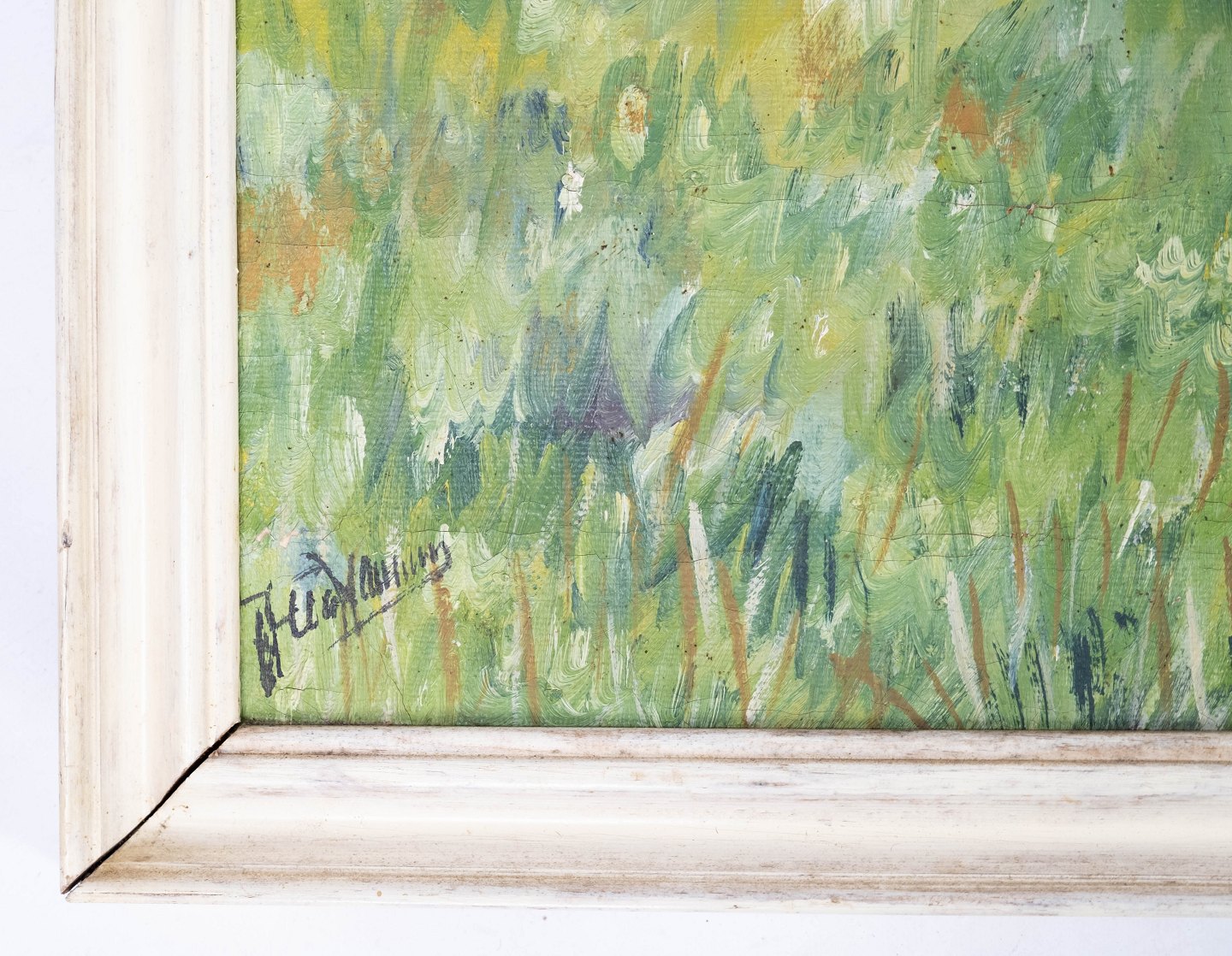 Oil painting with motif of pheasants and with white painted frame, unknown signature from the 1920s.
