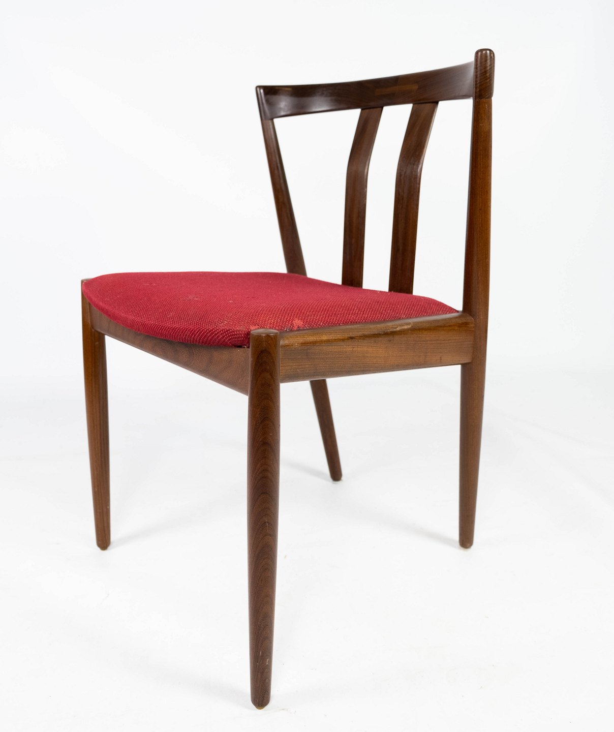 Spisestuestol i teak og polstret med rødt stof af dansk design fra 1960erne. Stolen er i flot brugt stand.