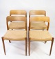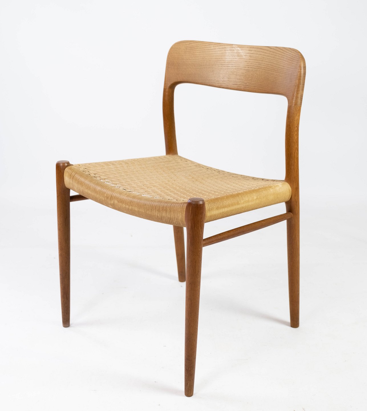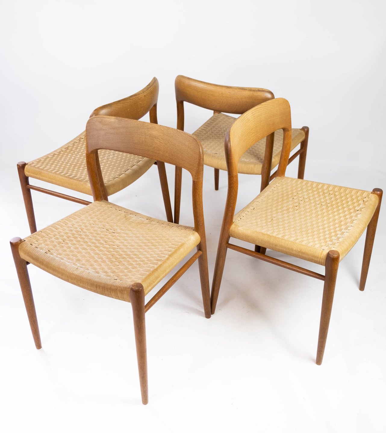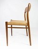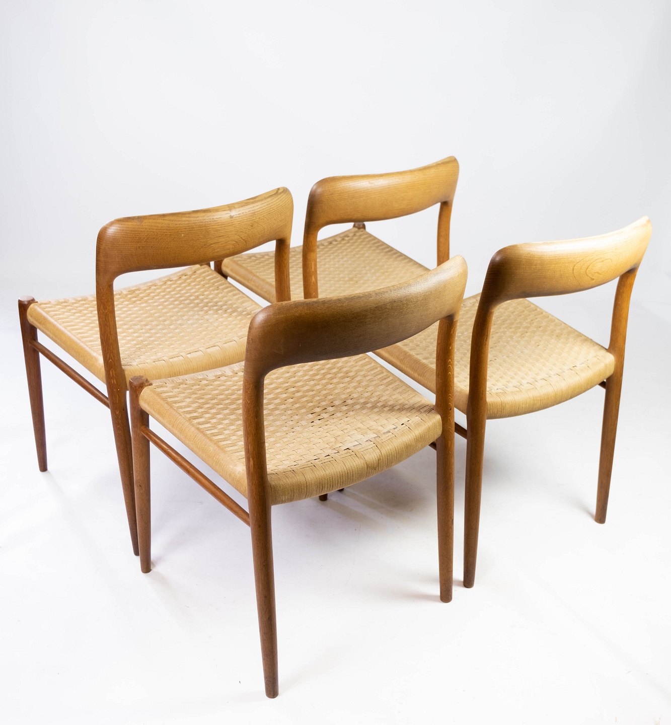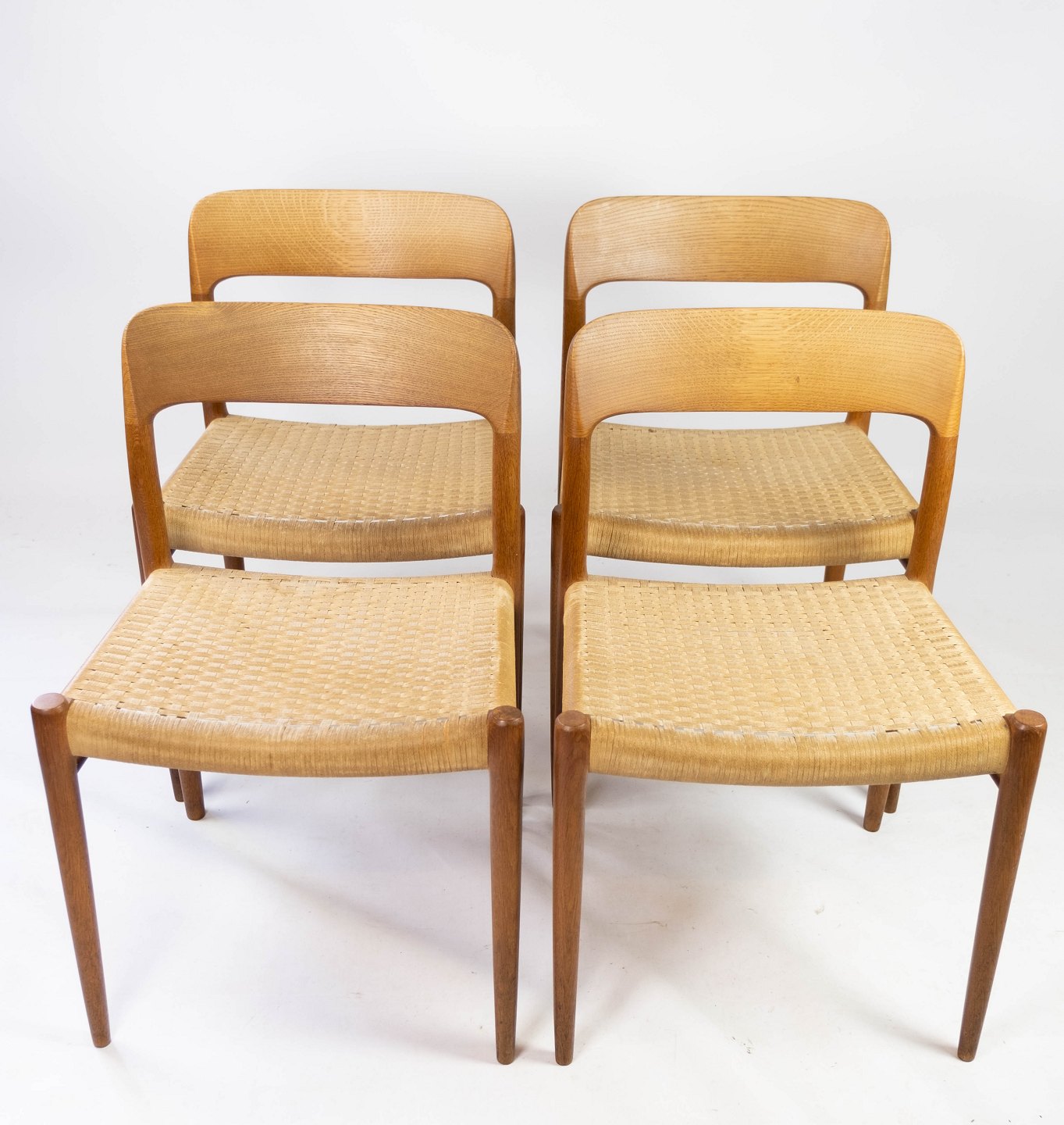 SolgtEt sæt af fire spisestuestole, model 75, i eg og papirflet designet af N.O. Møller fra 1960erne. Stolene er i flot brugt stand.
