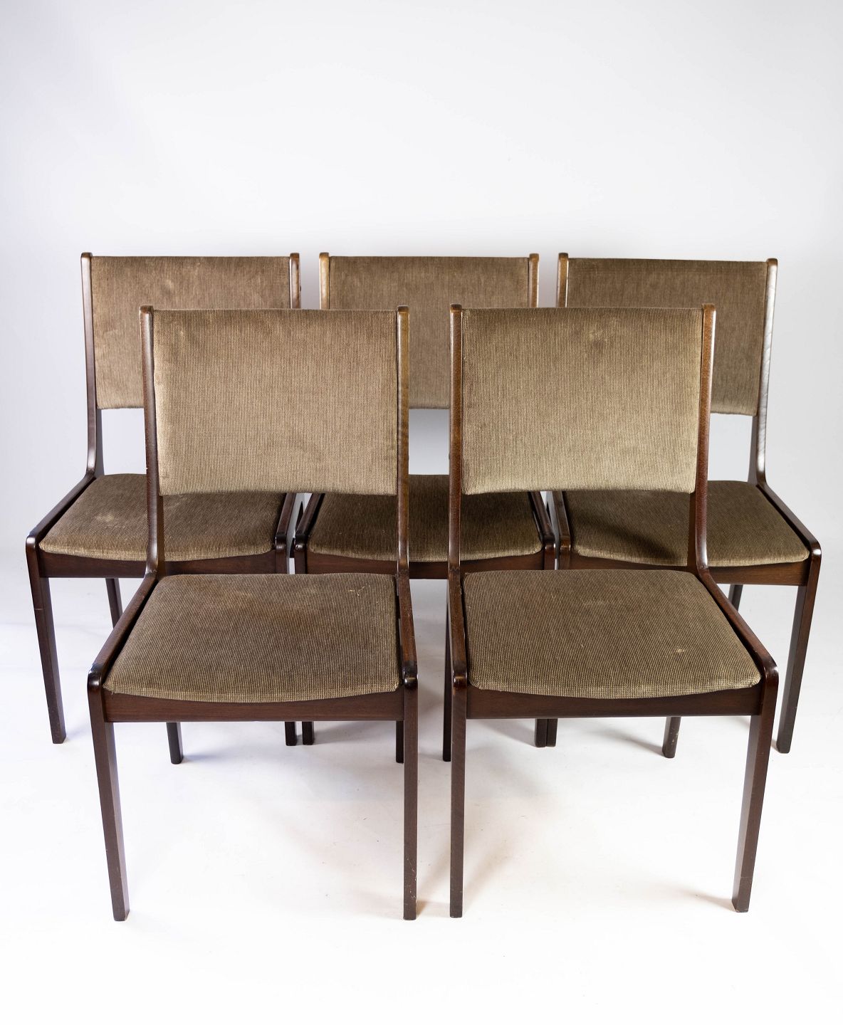 Sæt af fem spisestuestole I mørkt træ og mørkt stof af dansk design fremstillet af Farstrup i 1960erne.