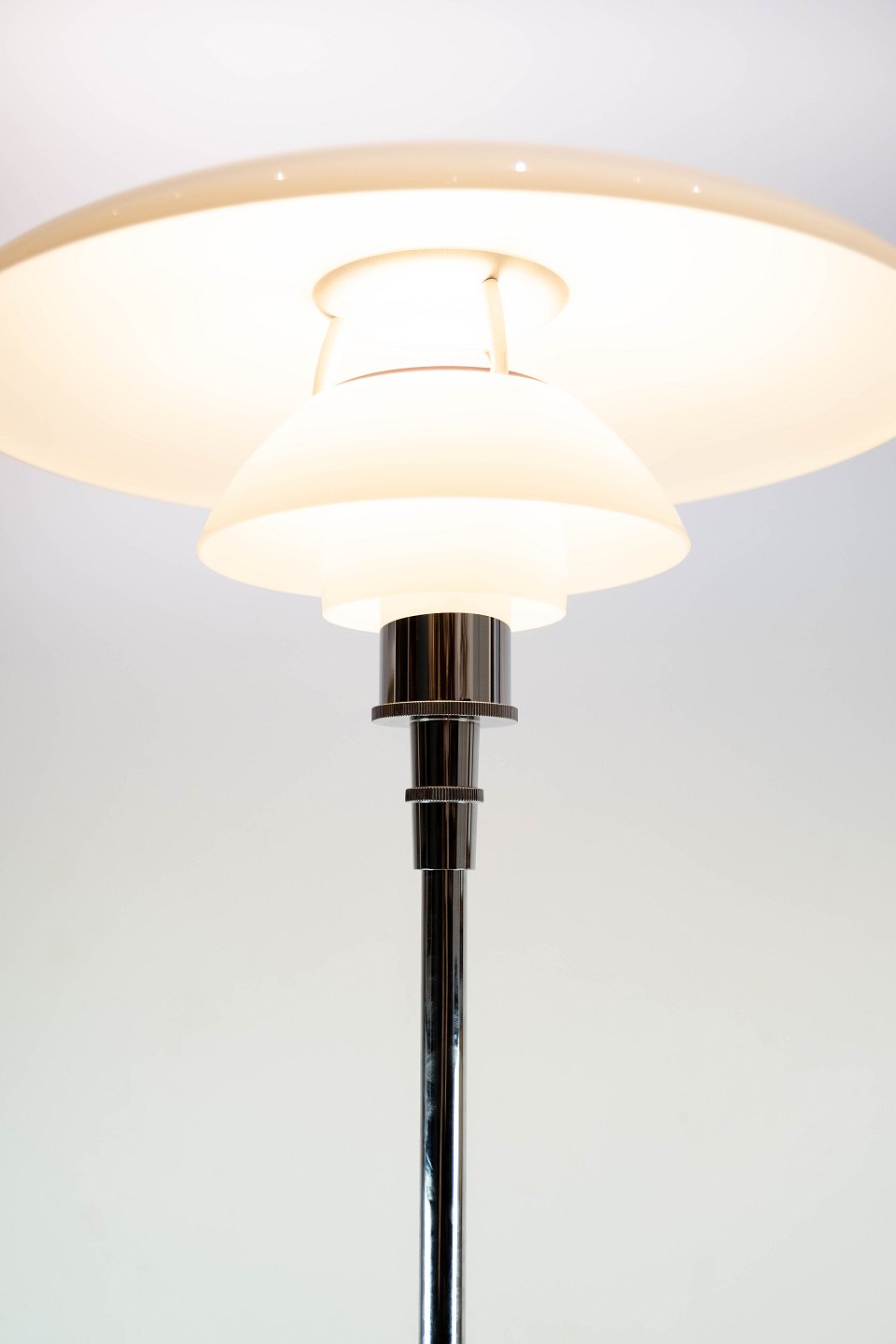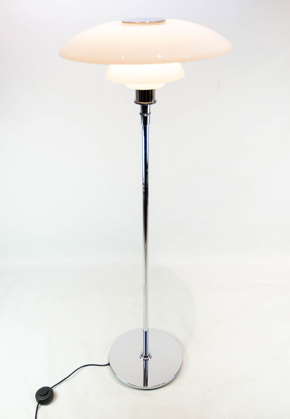 PH 4 1/2-3 1/2 floor lamp of chrome with shades of opaline glass.