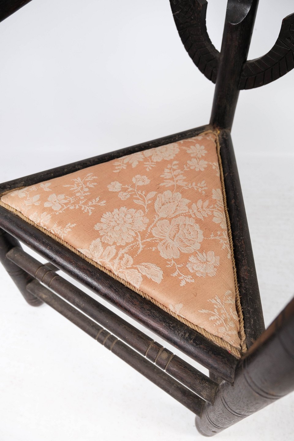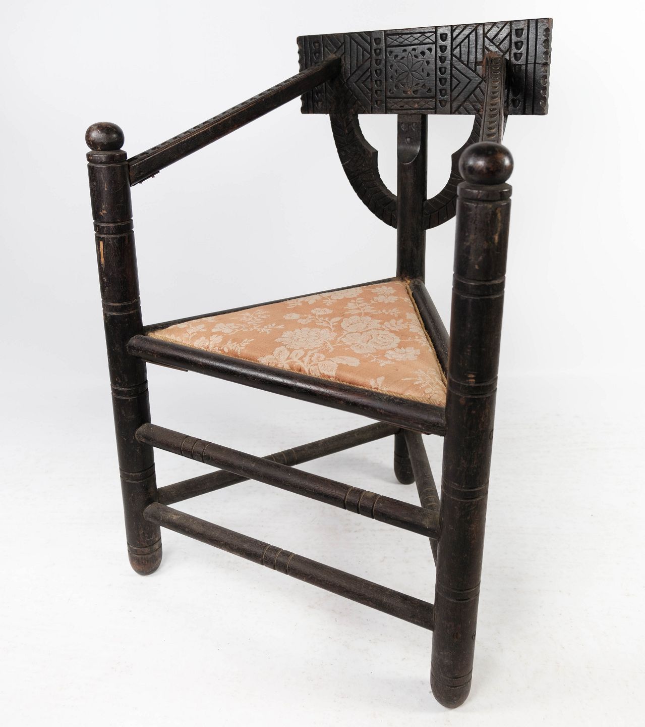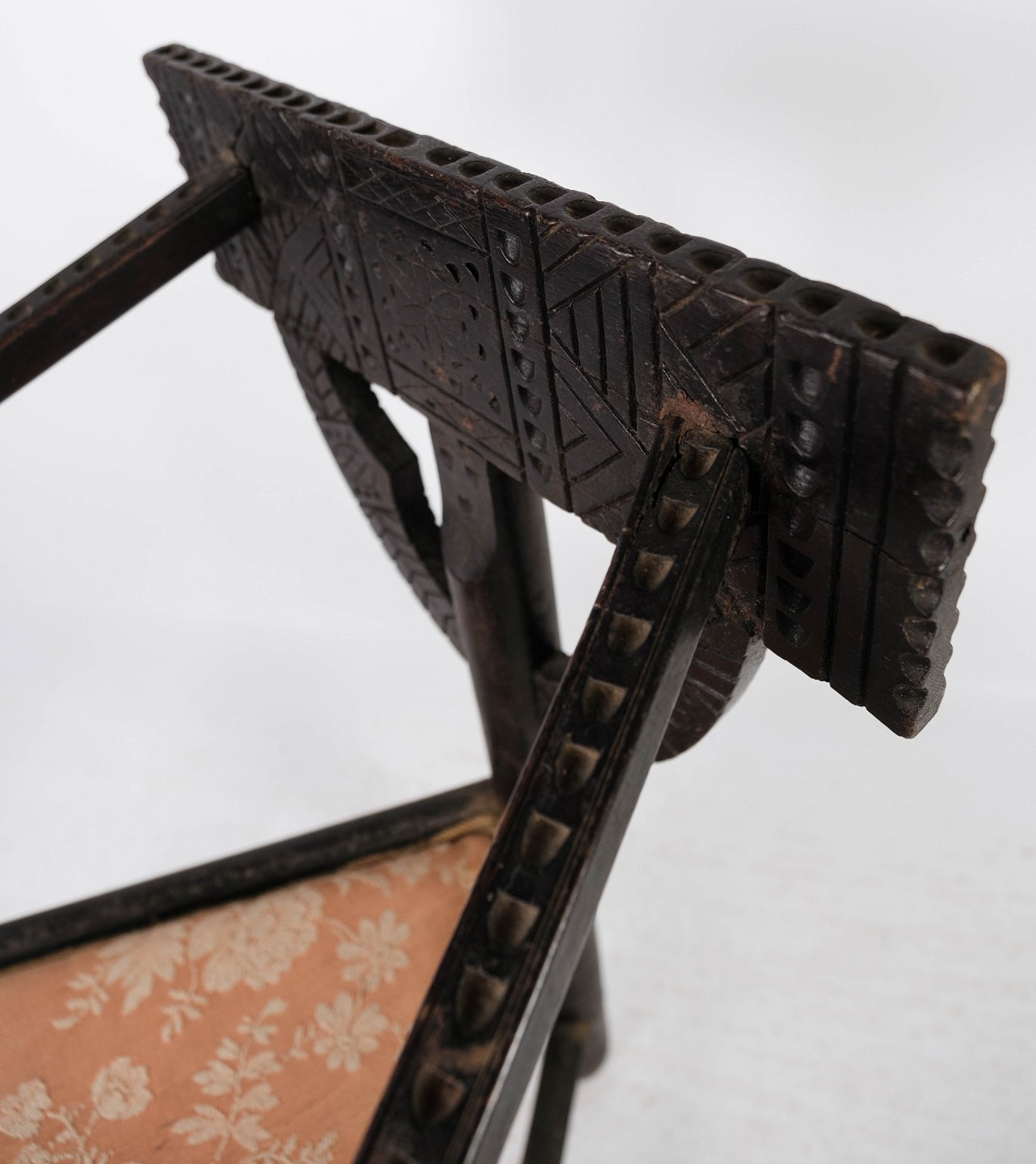 Armchair of dark wood with carvings and upholstered with light fabric, in great antique condition from 1880.