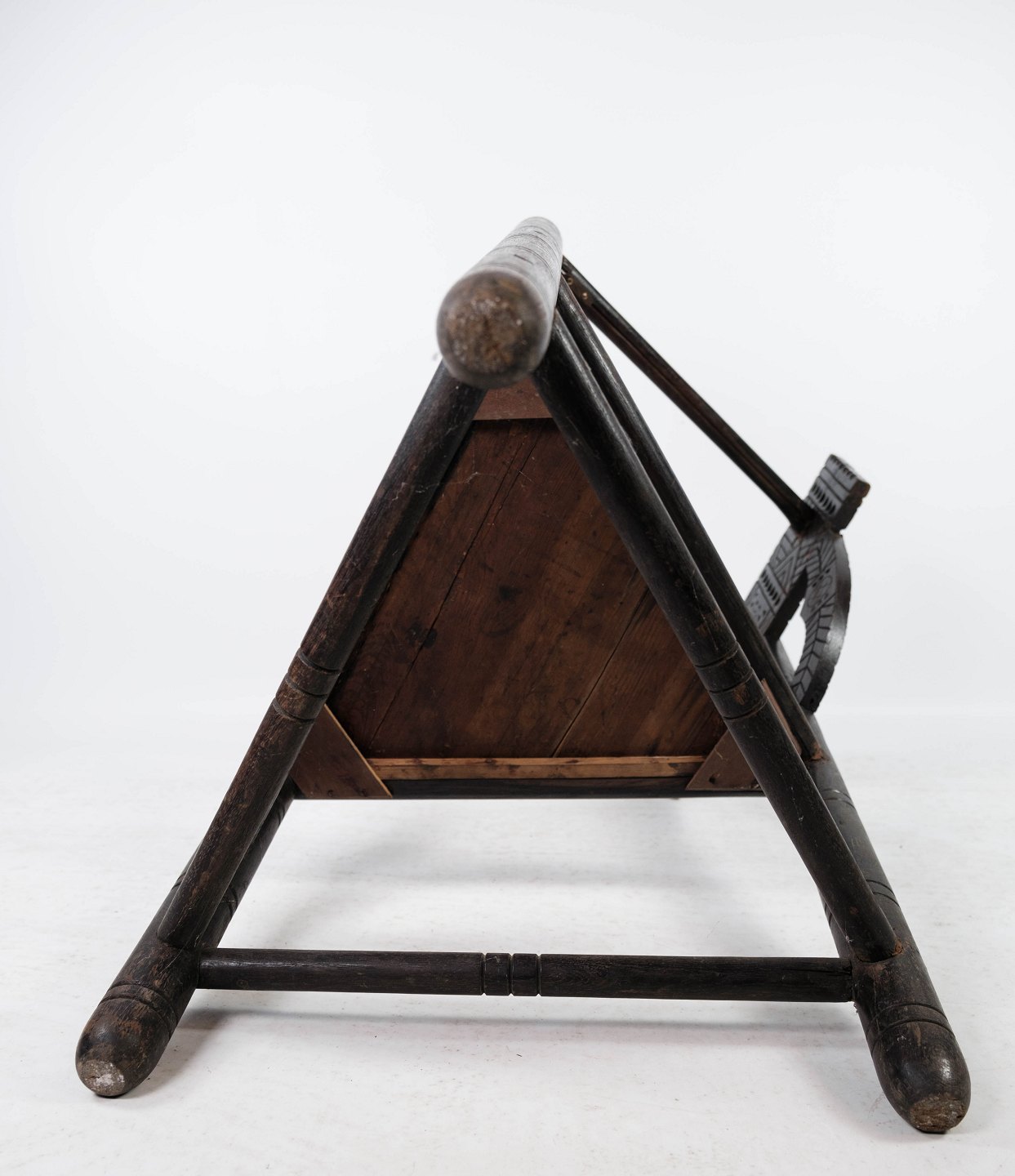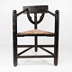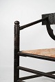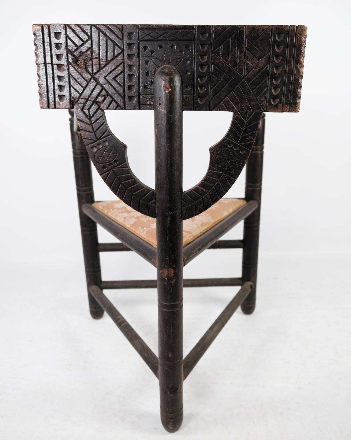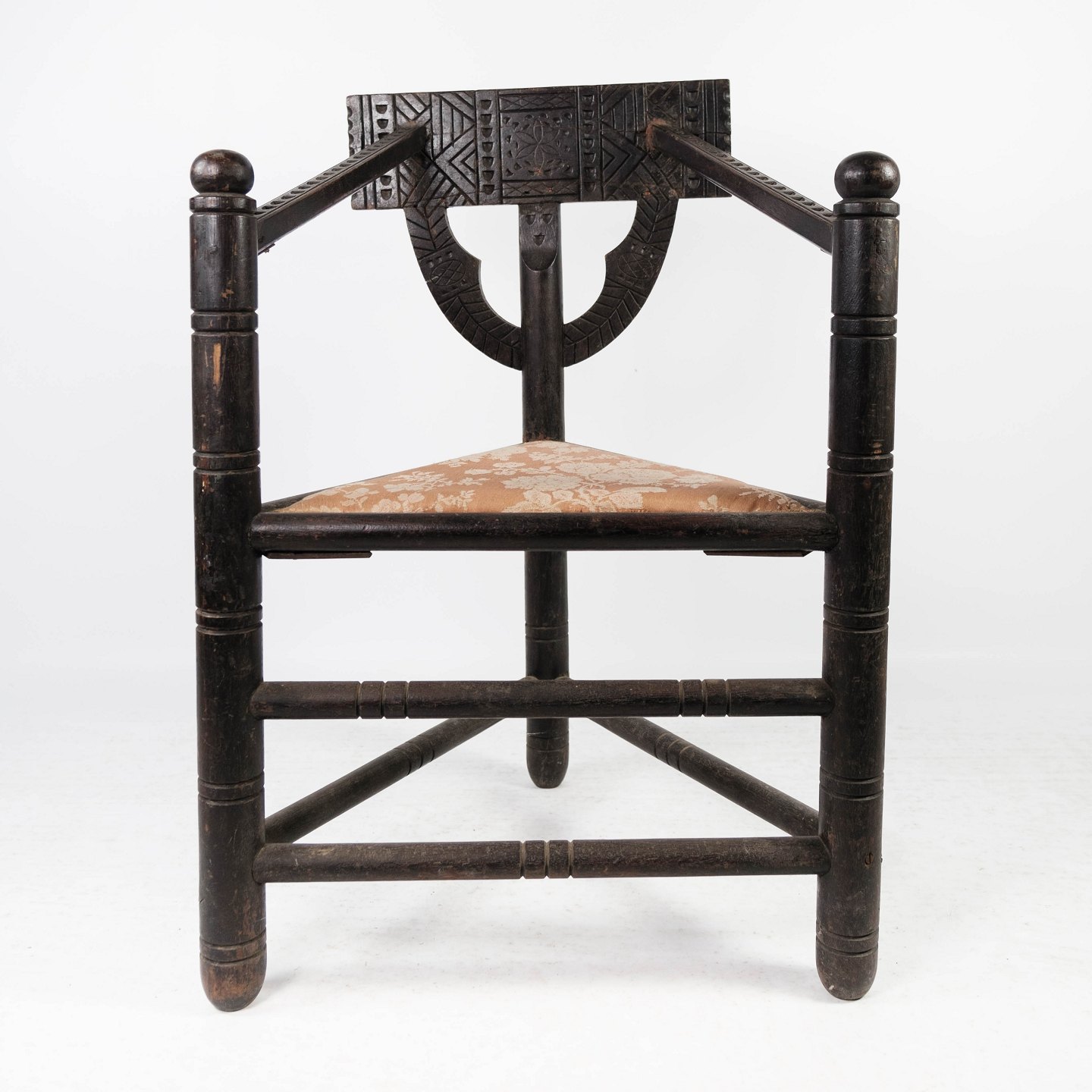 Armchair of dark wood with carvings and upholstered with light fabric, in great antique condition from 1880.