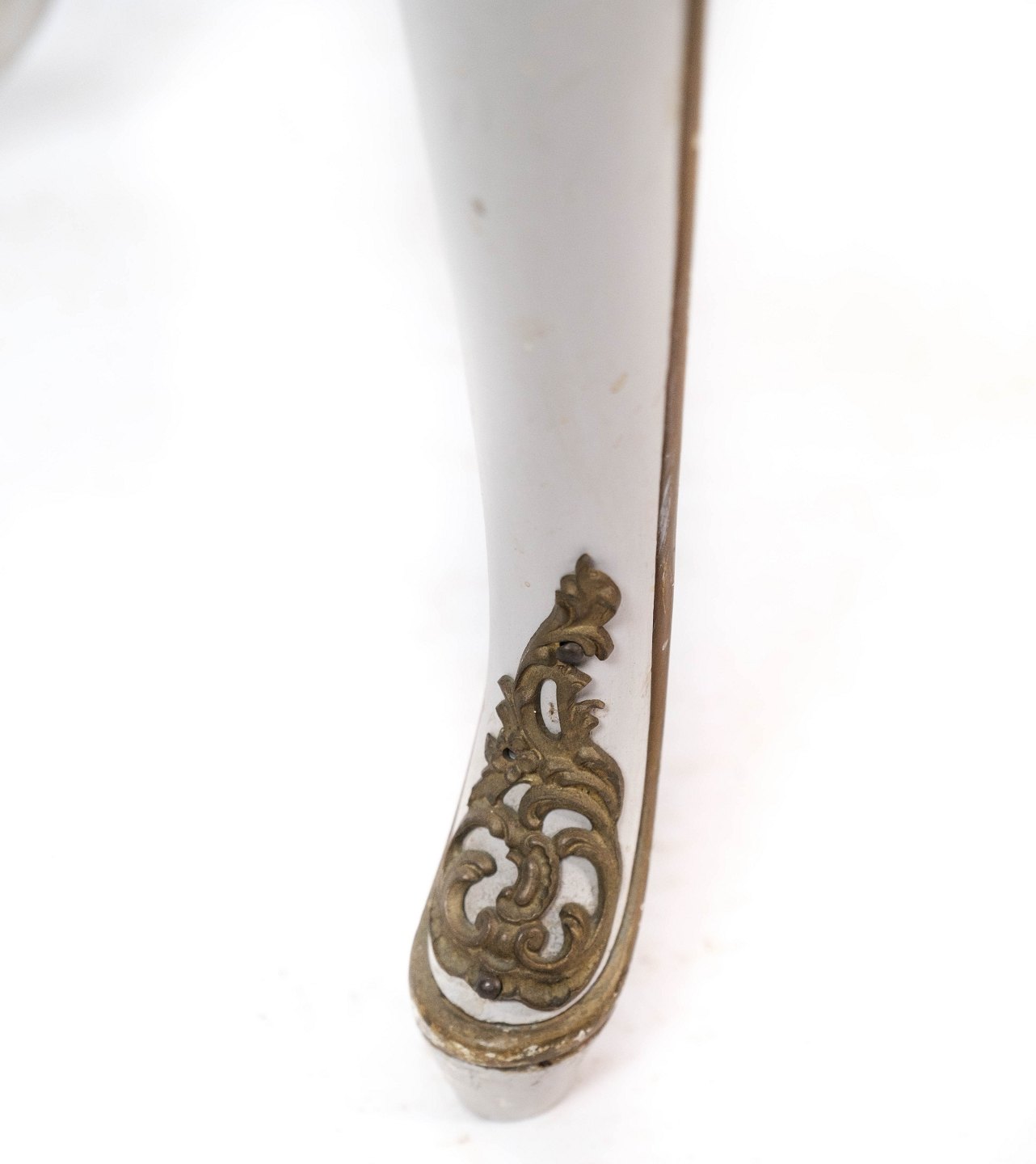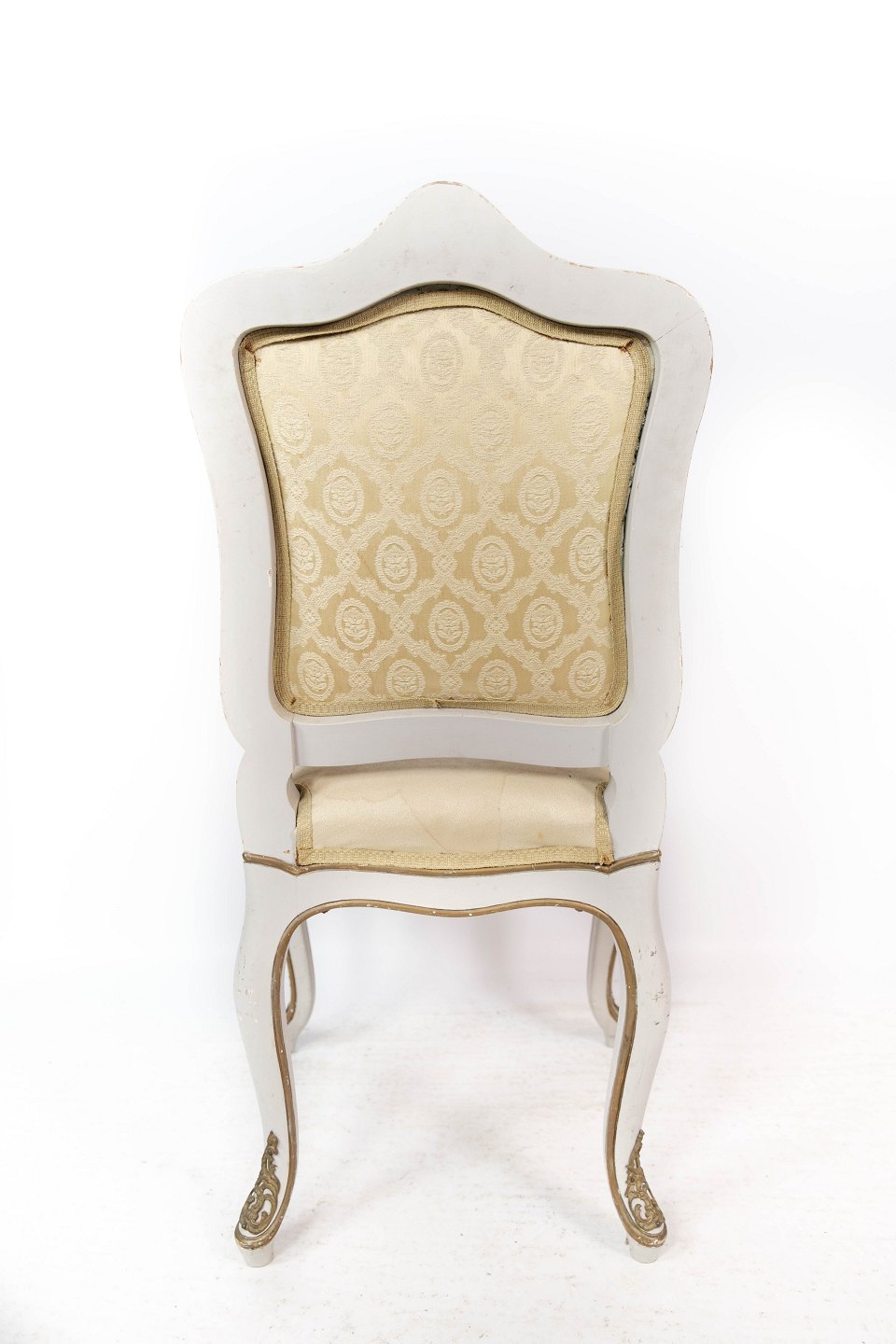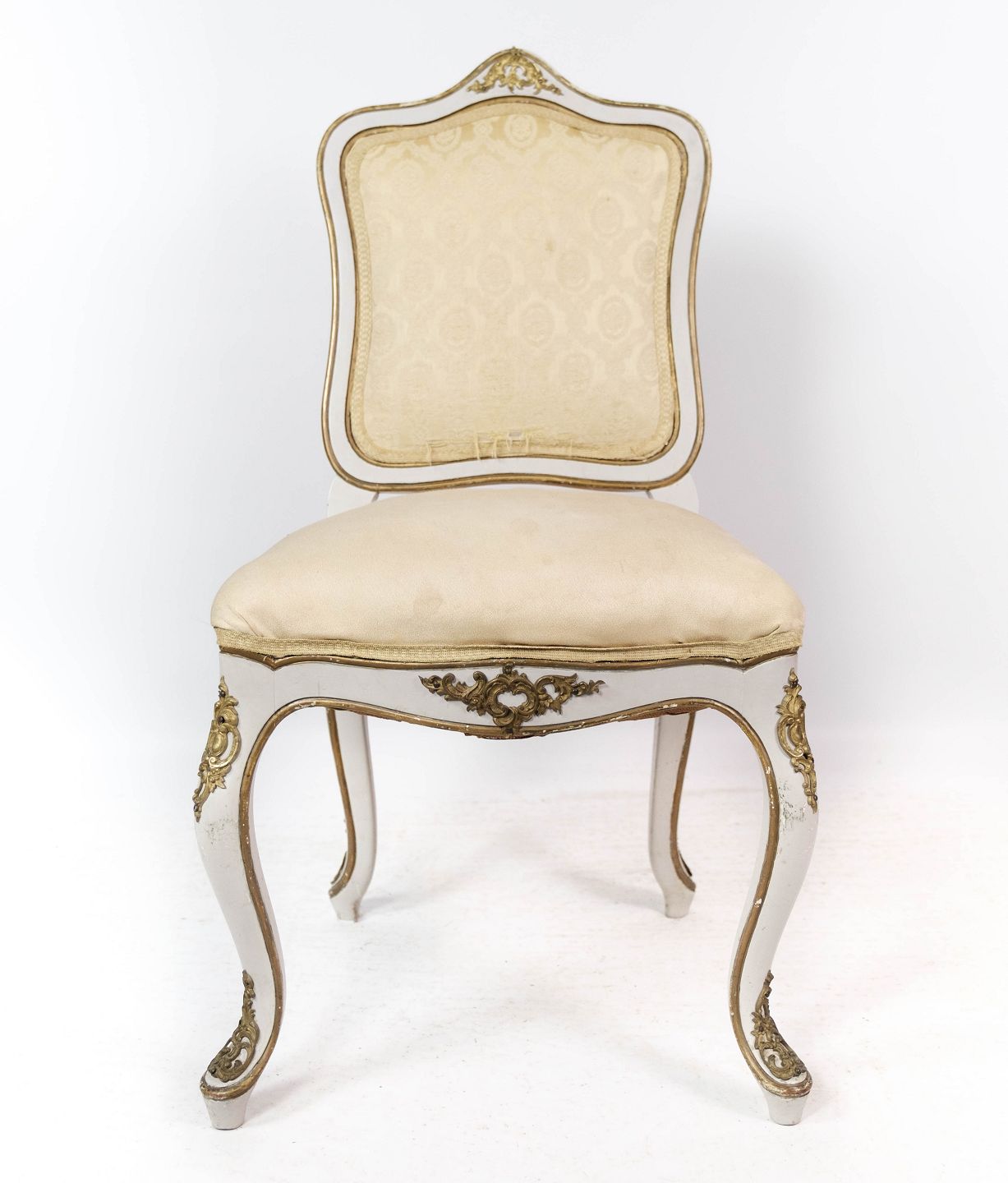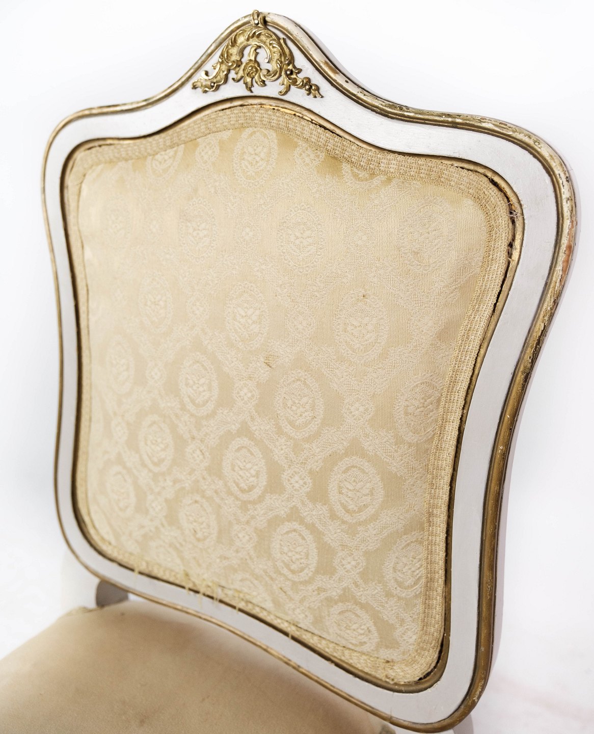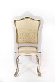Dining chair of white painted wood and upholstered with light fabric, in great antique condition from around 1880.