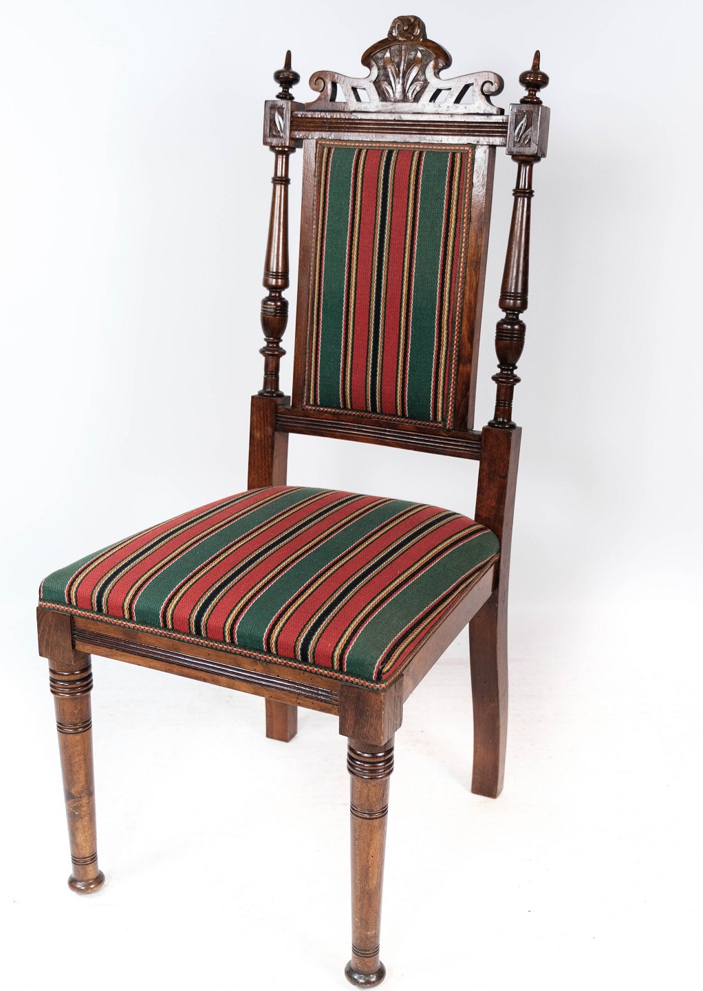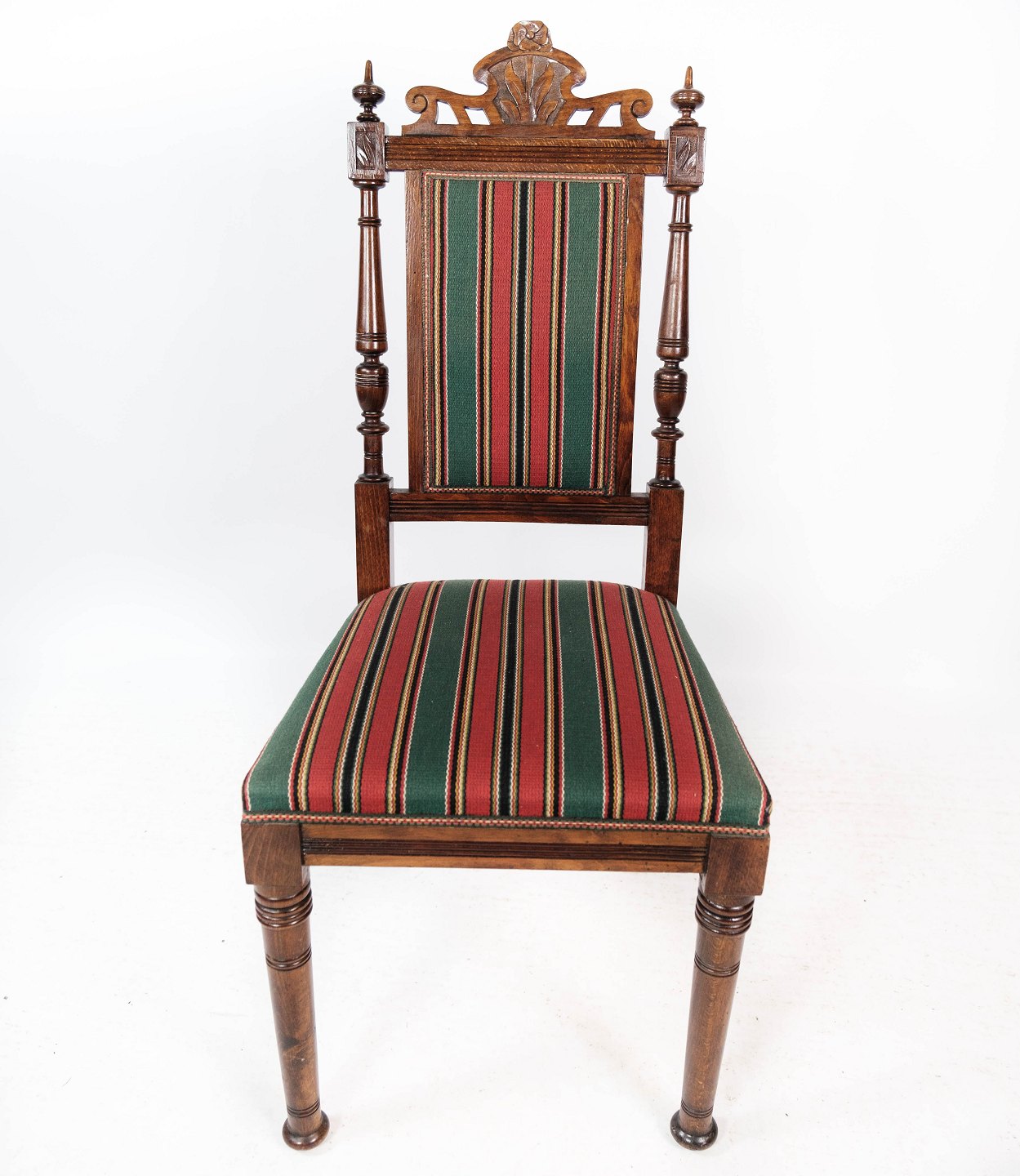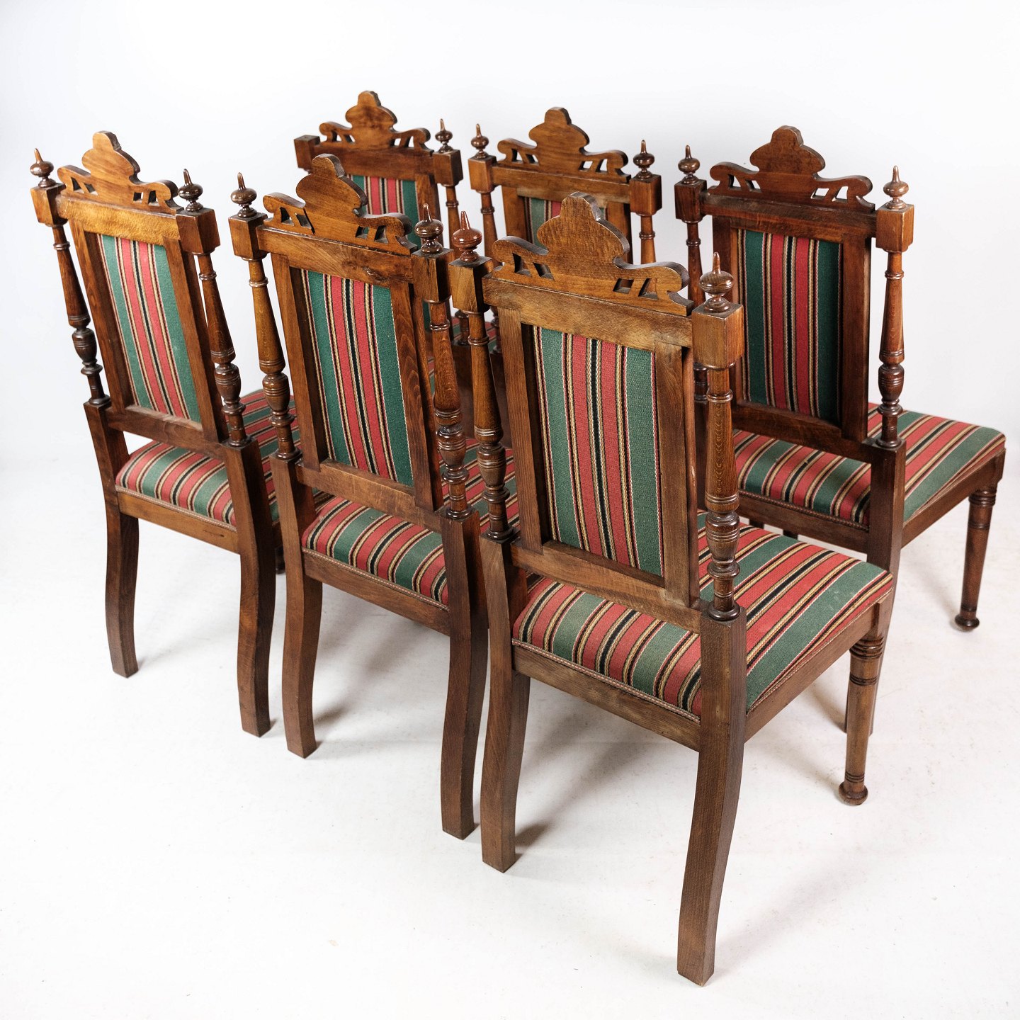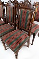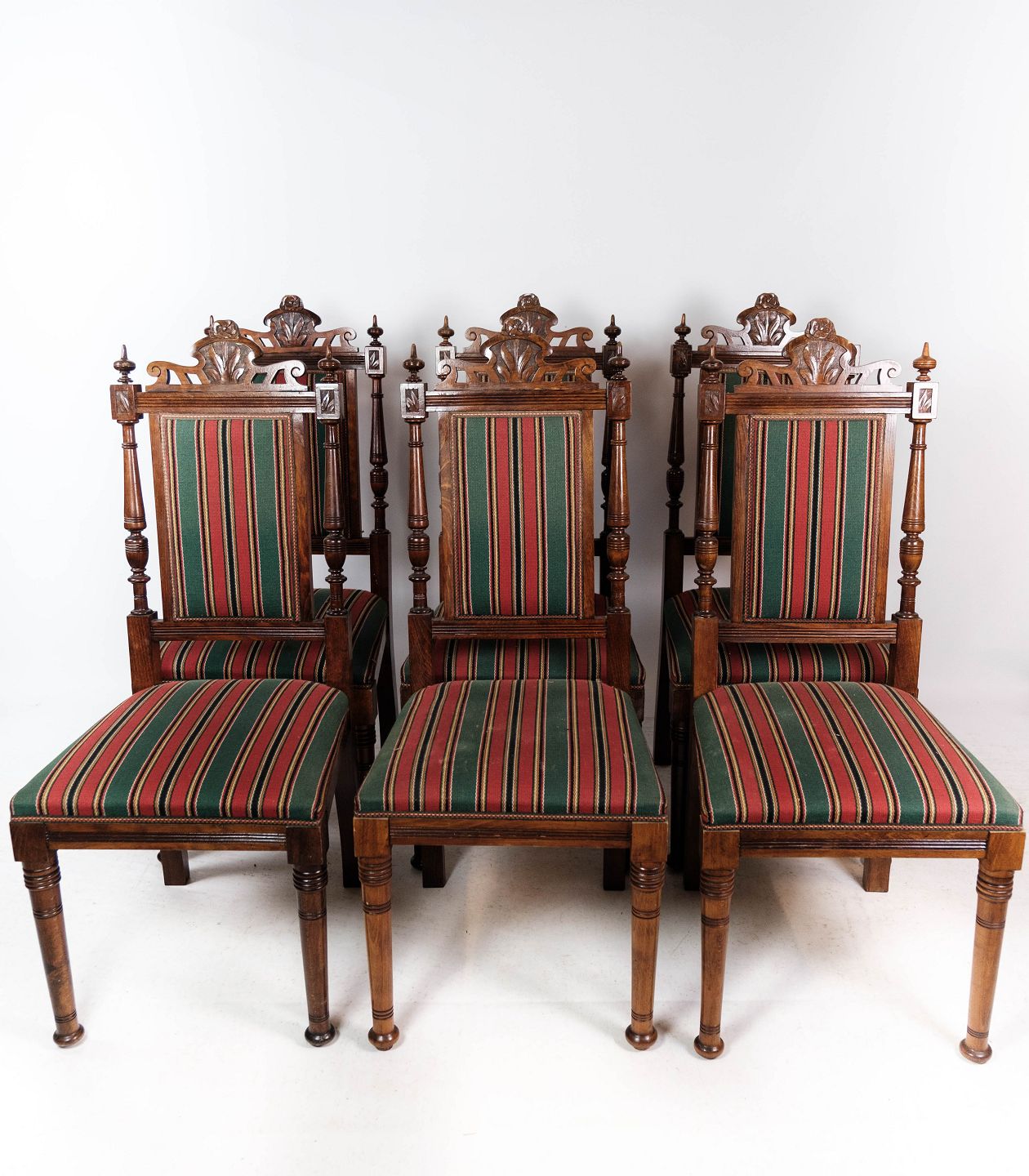 Sæt af seks spisestuestole af eg og polstret med stribet stof, fra omkring 1920. Stolene er i flot antik stand.