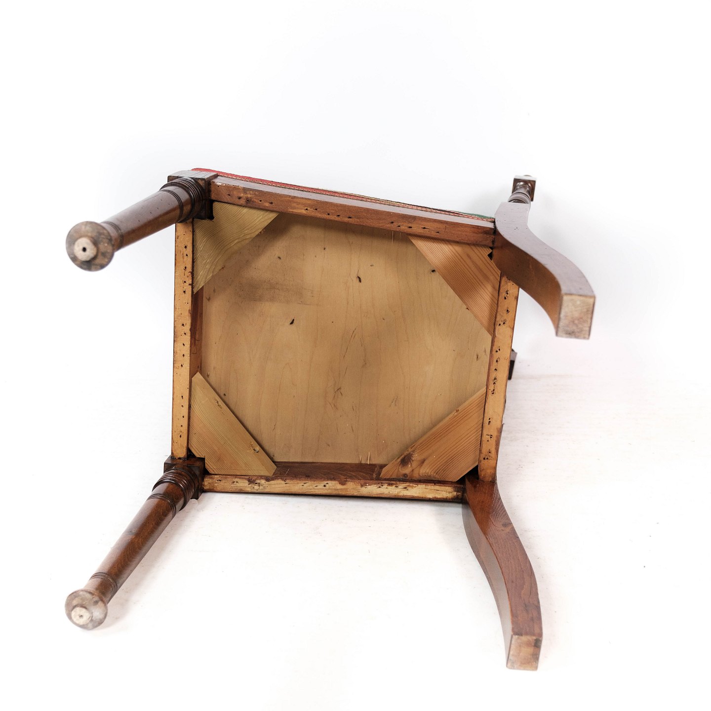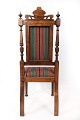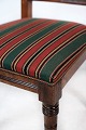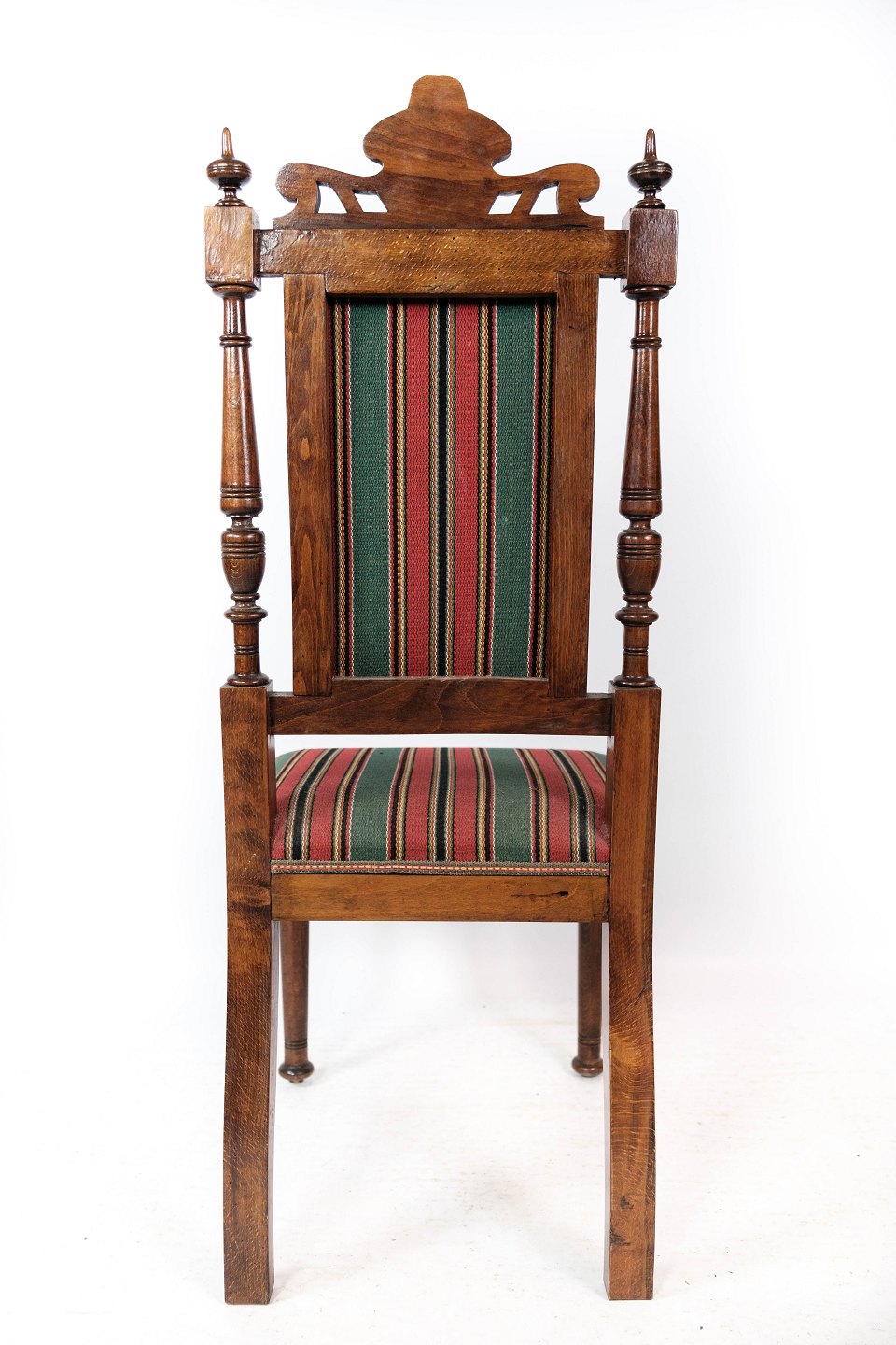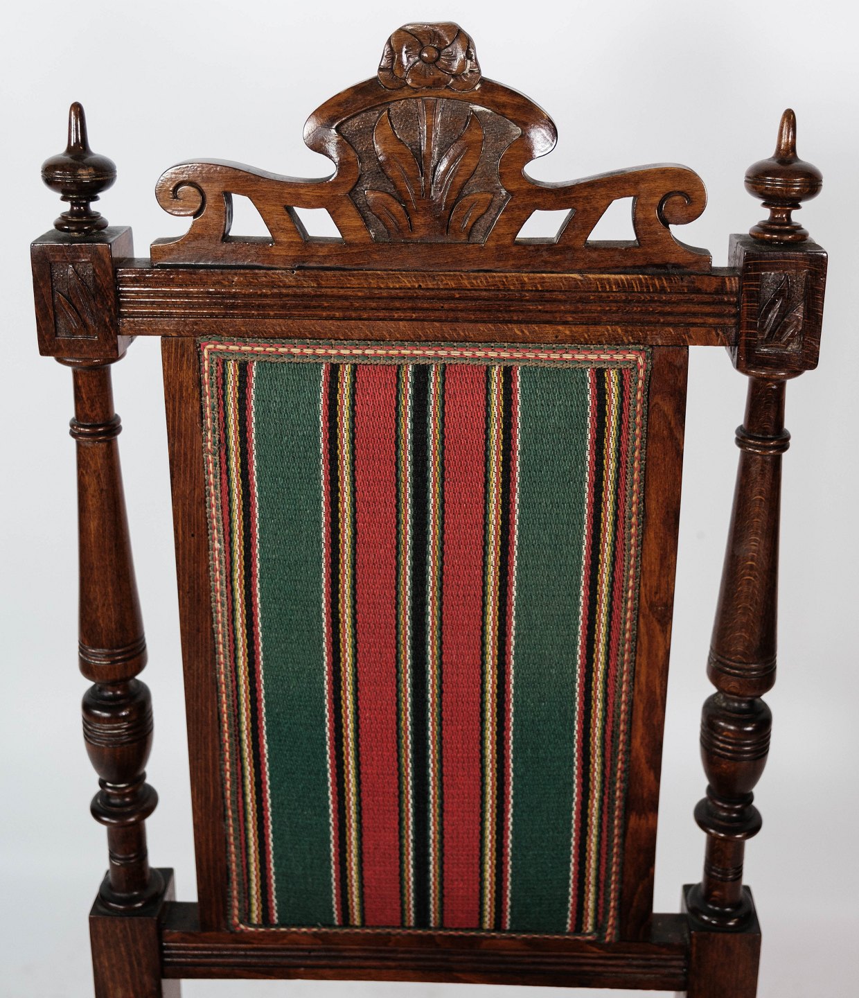 Sæt af seks spisestuestole af eg og polstret med stribet stof, fra omkring 1920. Stolene er i flot antik stand.