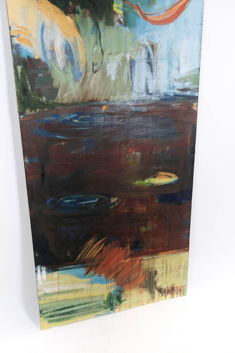 Højt oliemaleri på lærred i mørke farver af den dansk kunster Åse Højer, f. 1952.