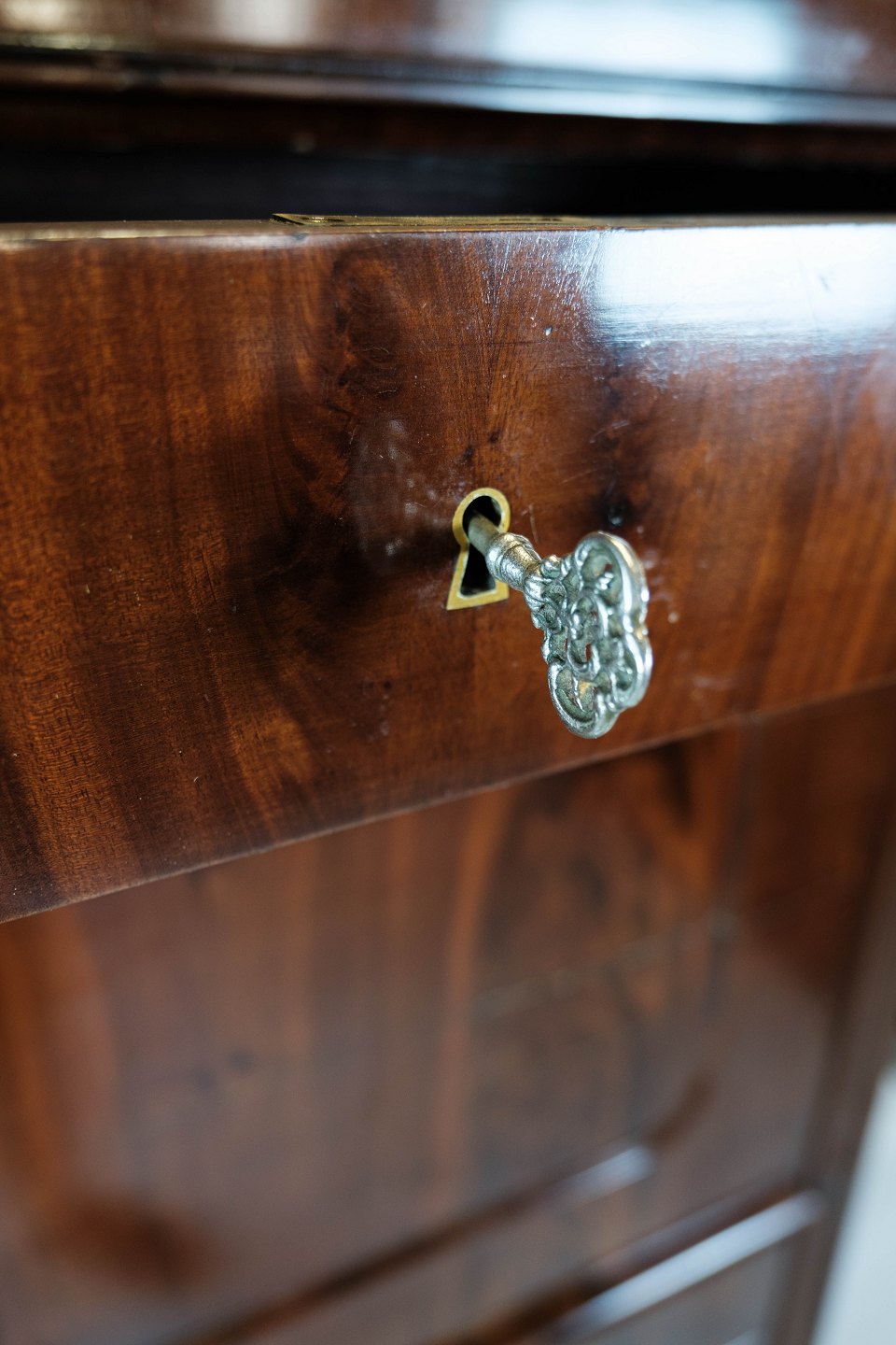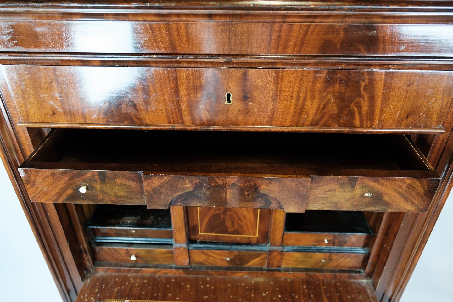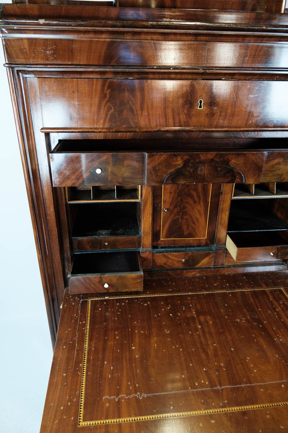 Sekretær af mahogni med intarsia, i flot antik stand fra 1840erne.