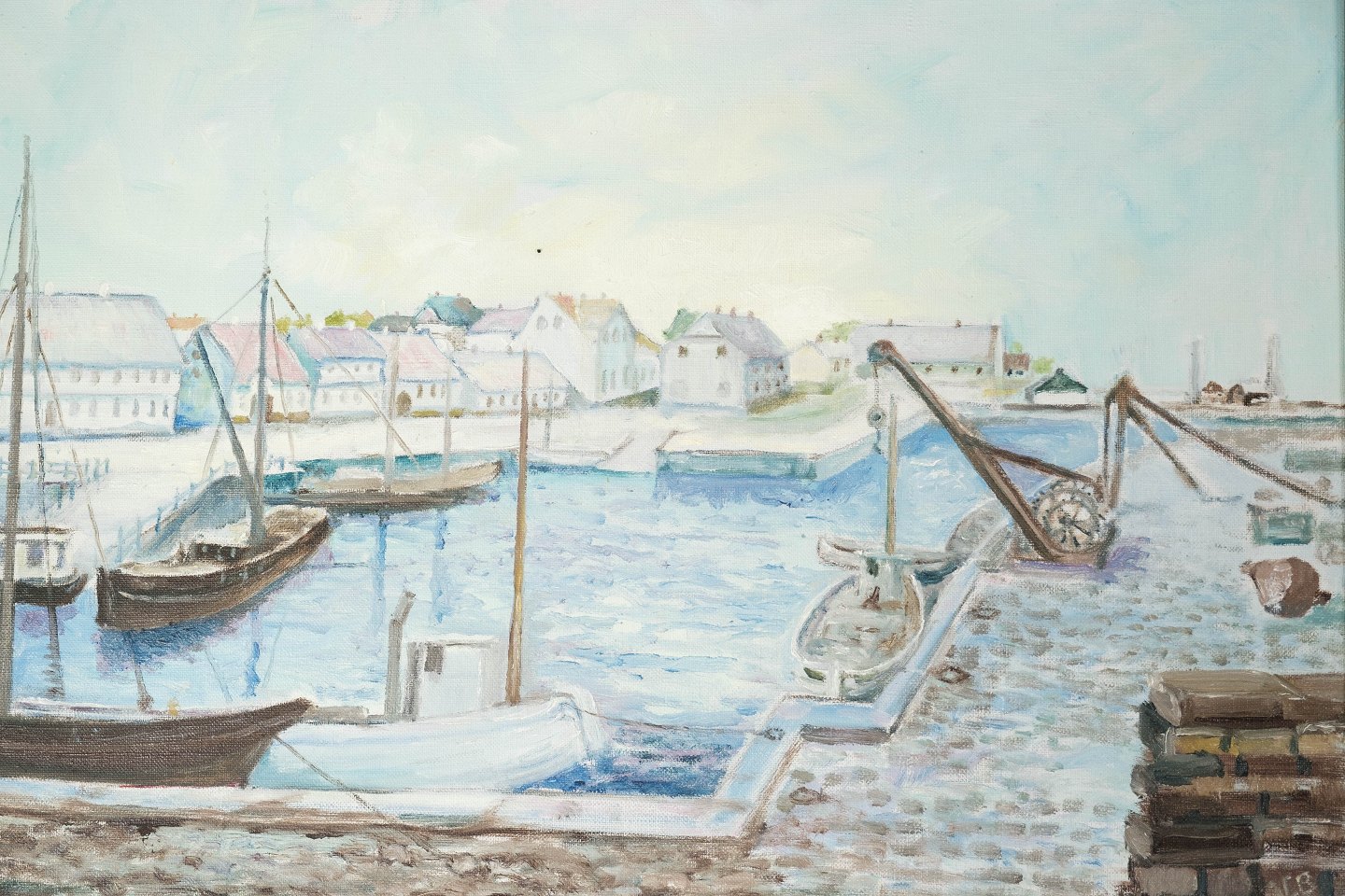 Painting on canvas with harbour motif and gilded frame, signed V.B. from the 1940s.